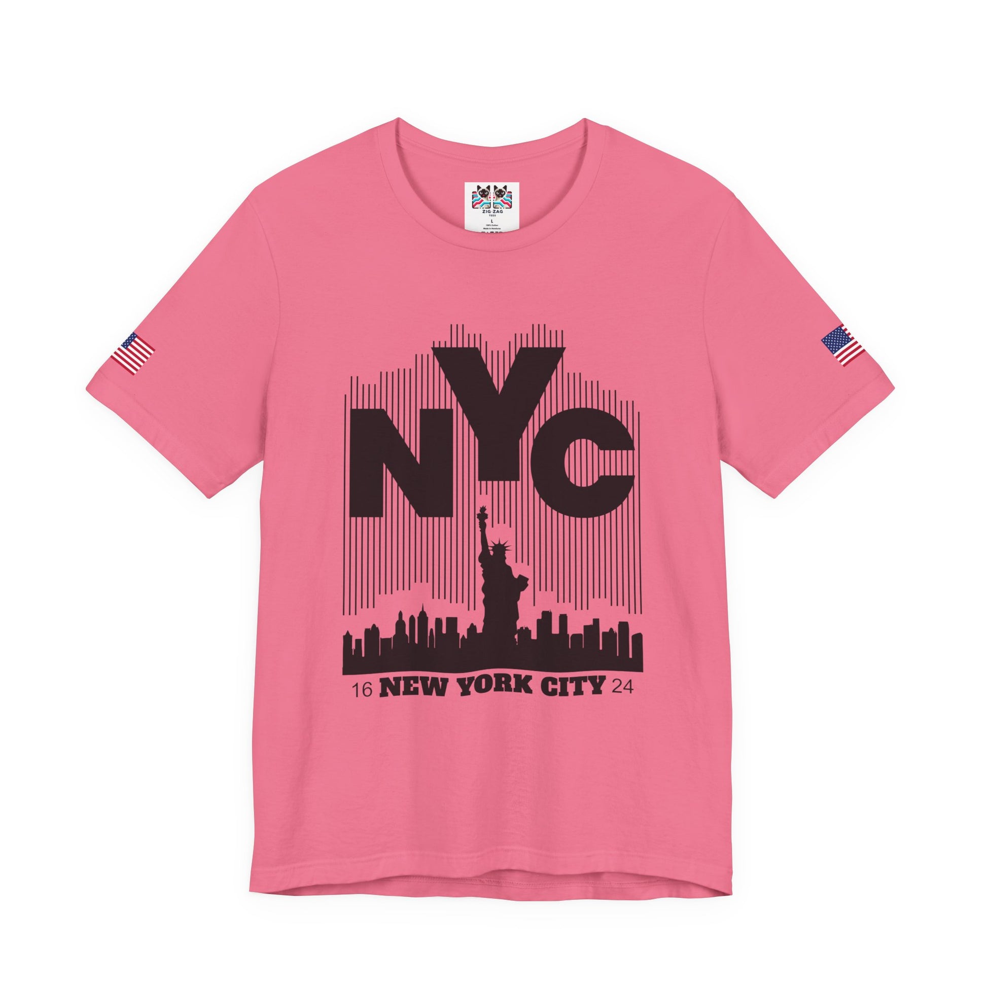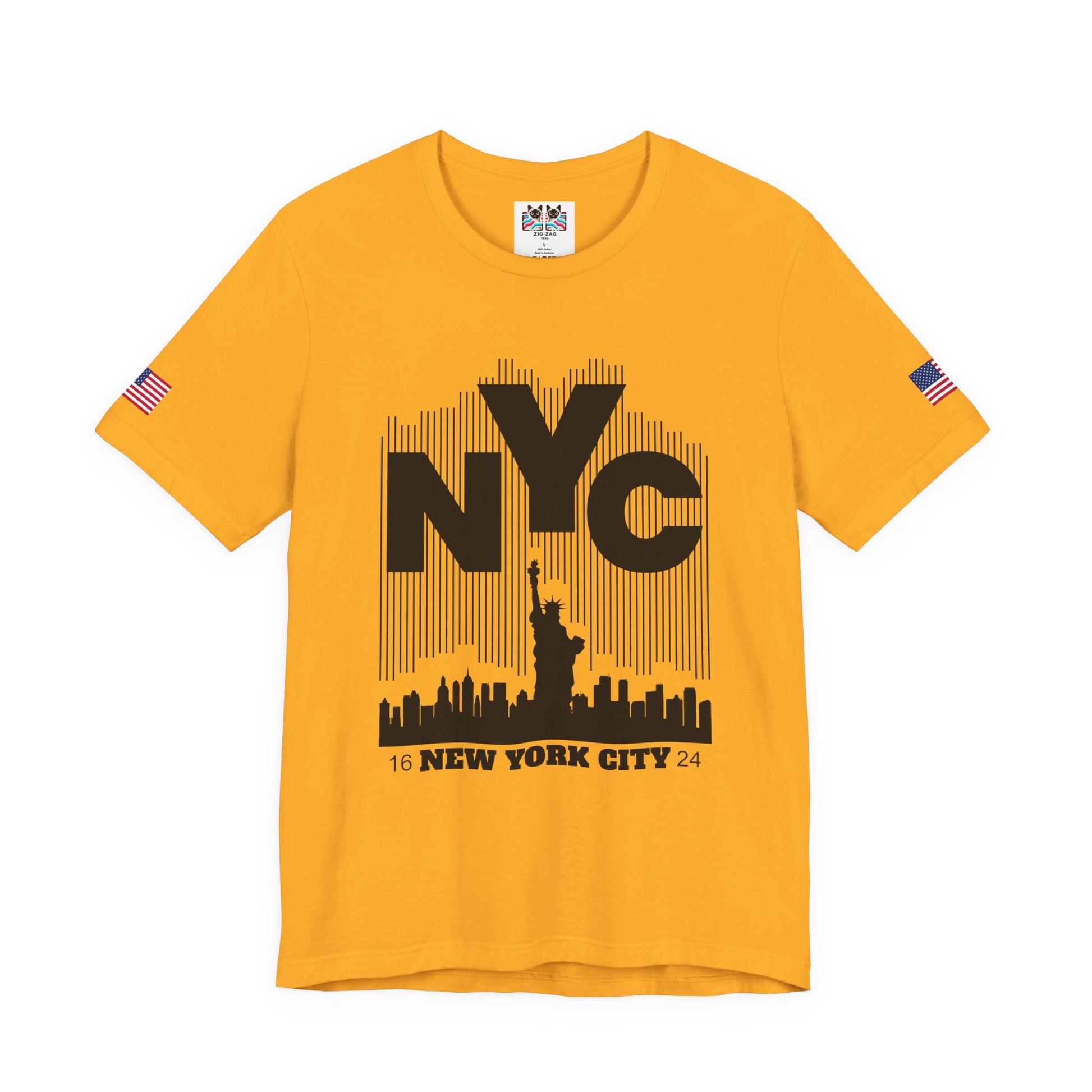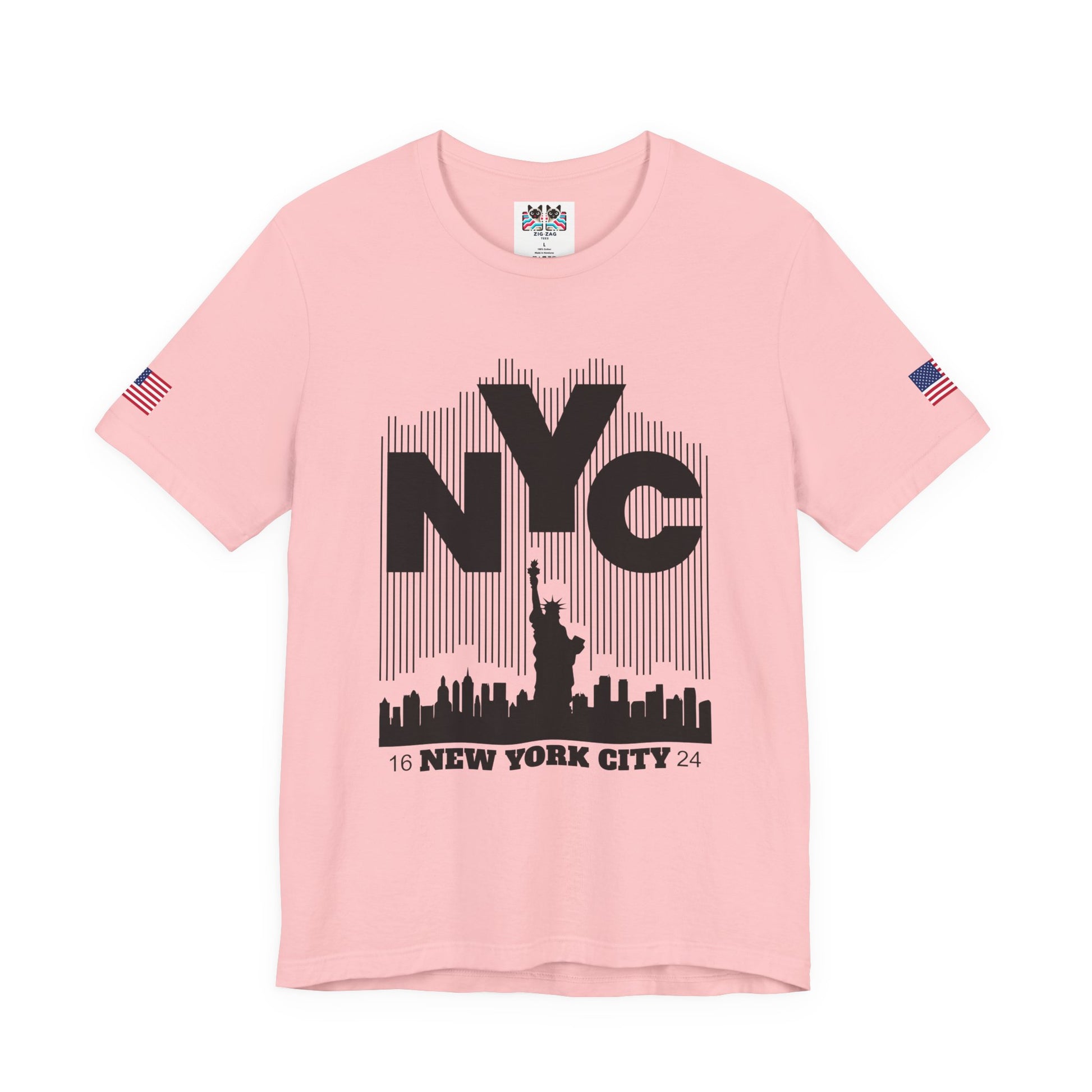 Make a contemporary statement with this unique NYC barcode-inspired t-shirt! The modern design features "NYC" in bold letters with vertical line patterns creating a barcode/stripe effect, along with the Statue of Liberty and Manhattan skyline silhouette below. The text "16 NEW YORK CITY 24" references the founding year 1624 in a creative split format. The black and white minimalist aesthetic with clean lines appeals to modern design enthusiasts, tech-savvy New Yorkers, graphic designers, or anyone who appreciates contemporary urban art. This white t-shirt with American flag sleeve patches represents NYC in a fresh, innovative way - perfect for the modern metropolis that's always evolving. Great for art students, design professionals, trendy urbanites, or those who want NYC style that's different from traditional tourist designs. The barcode element adds an edgy, urban contemporary vibe.