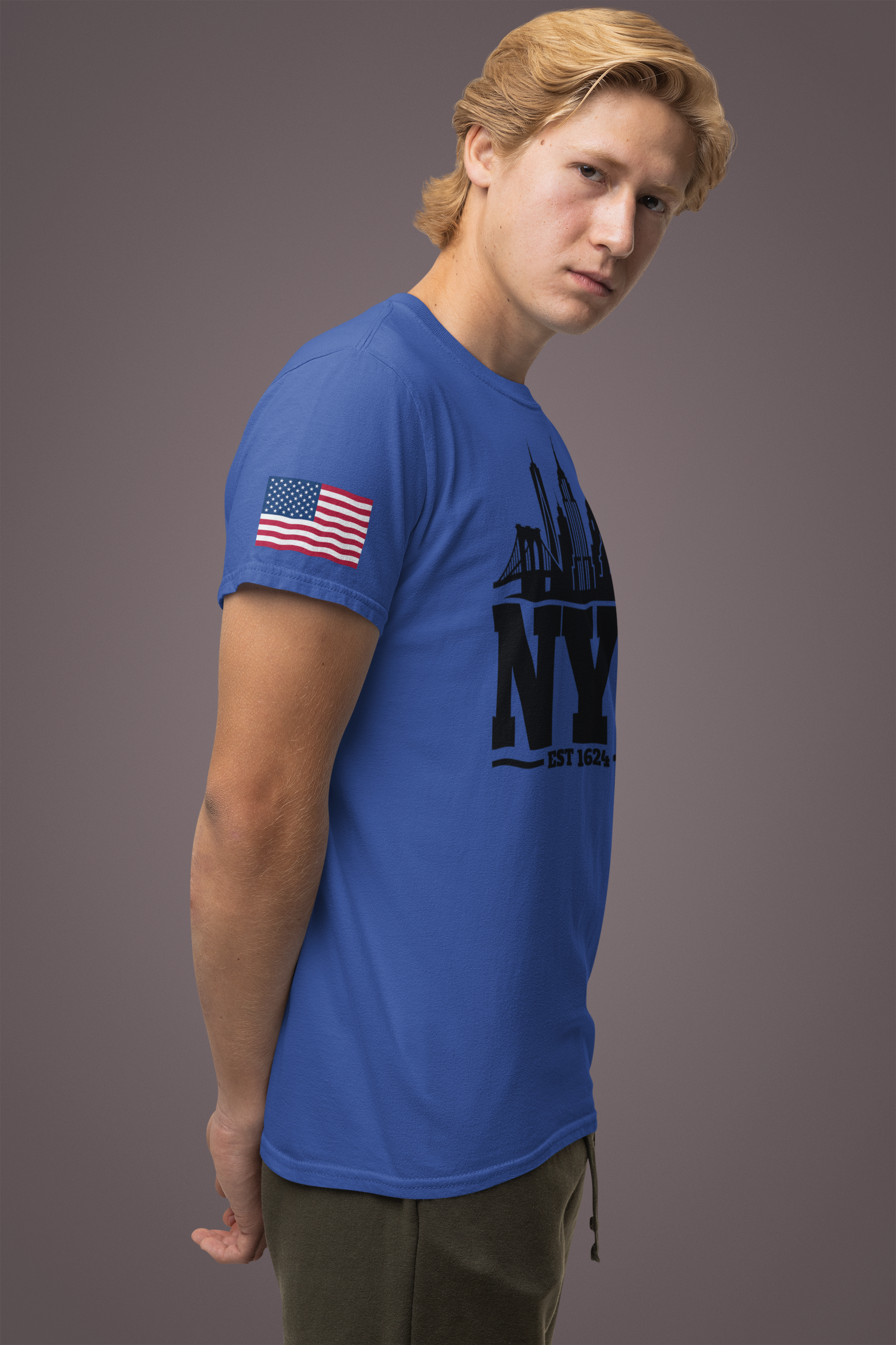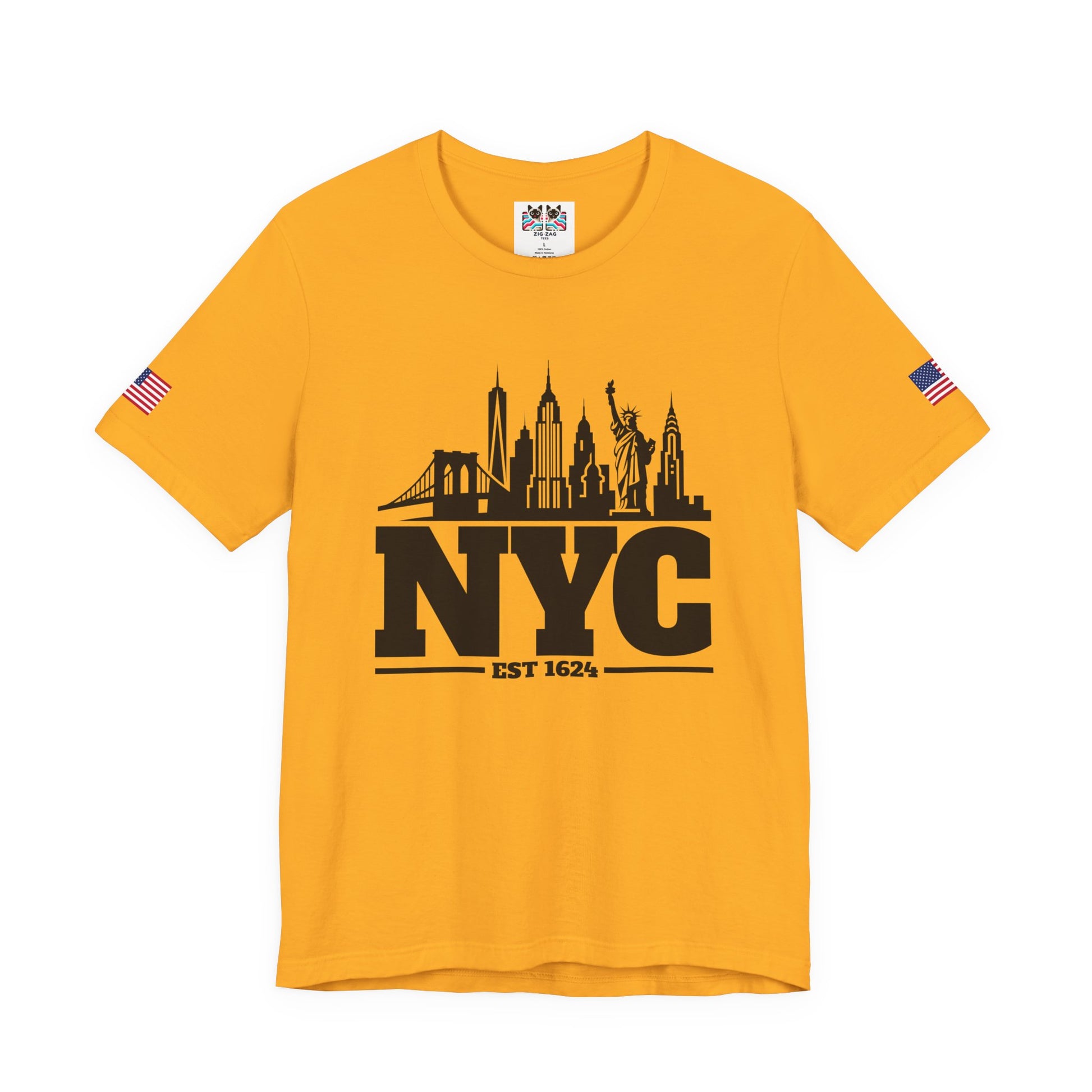 Keep it classic with this bold black and white NYC skyline silhouette t-shirt! The minimalist design features "NYC EST 1624" in large letters with the iconic Manhattan skyline incorporated as a silhouette, including One World Trade Center (Freedom Tower), Empire State Building, Chrysler Building, Brooklyn Bridge, and the Statue of Liberty. The clean, simple black-on-white design creates maximum visual impact and timeless style. Perfect for minimalist fashion lovers, modern NYC enthusiasts, urban professionals, or anyone who appreciates clean graphic design and New York City pride. This white t-shirt with American flag sleeve patches works for any occasion - casual everyday wear, business casual Fridays, travel, or as a versatile NYC souvenir. The silhouette style is sophisticated yet bold, making it ideal for both young professionals and classic style enthusiasts who want to represent NYC with understated elegance.