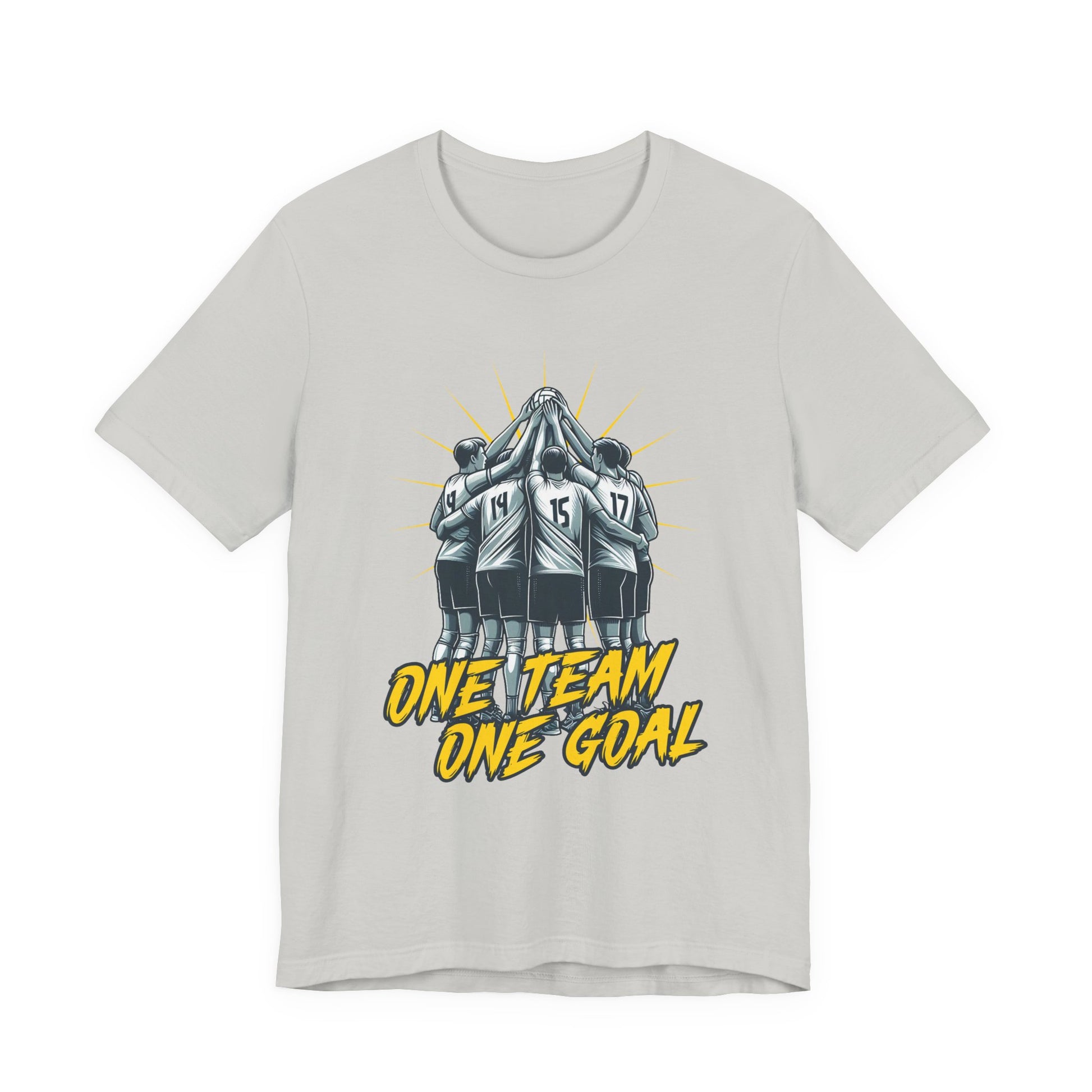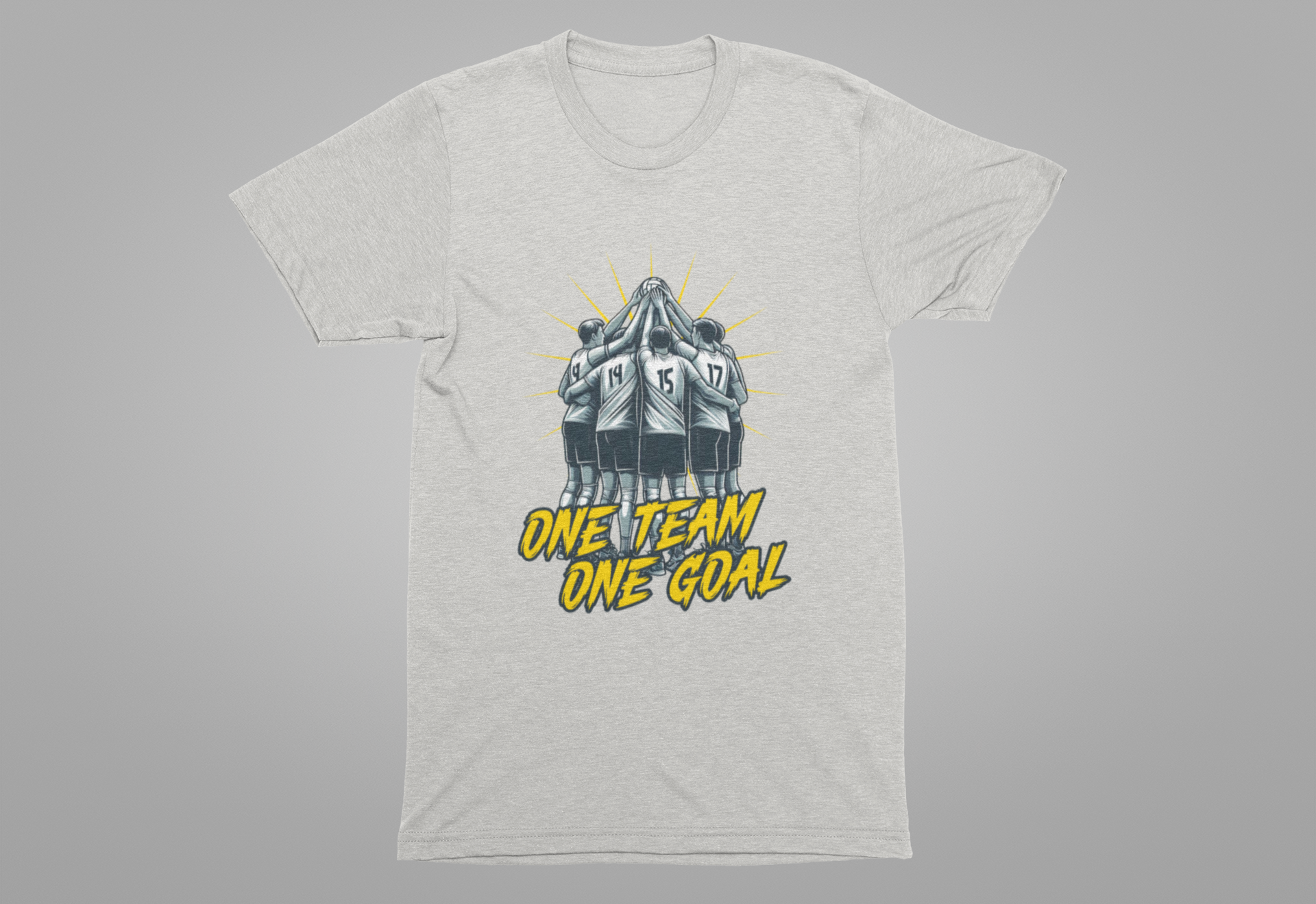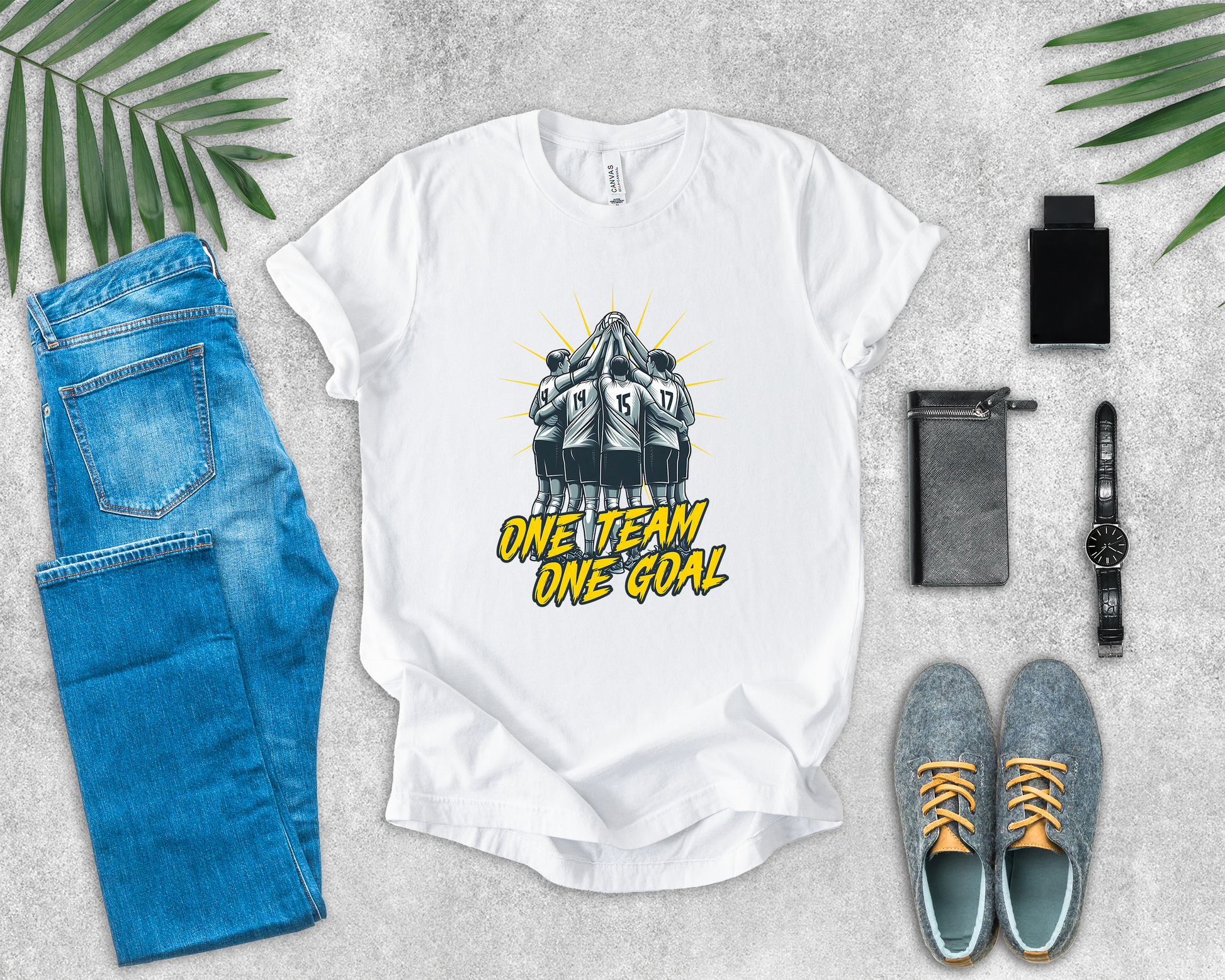 Show your team spirit with this "One Team One Goal" t-shirt, featuring a powerful graphic of a group of men’s team huddling together, hands stacked on top in a classic team huddle pose. This design captures the essence of unity, determination, and collective purpose—perfect for sports teams, group events, or anyone who values teamwork and camaraderie. The bold slogan and dynamic illustration make this tee a standout choice for building motivation and representing your squad. Crafted from soft, comfortable fabric, it’s ideal for game days, training sessions, or everyday wear that celebrates the power of togetherness.