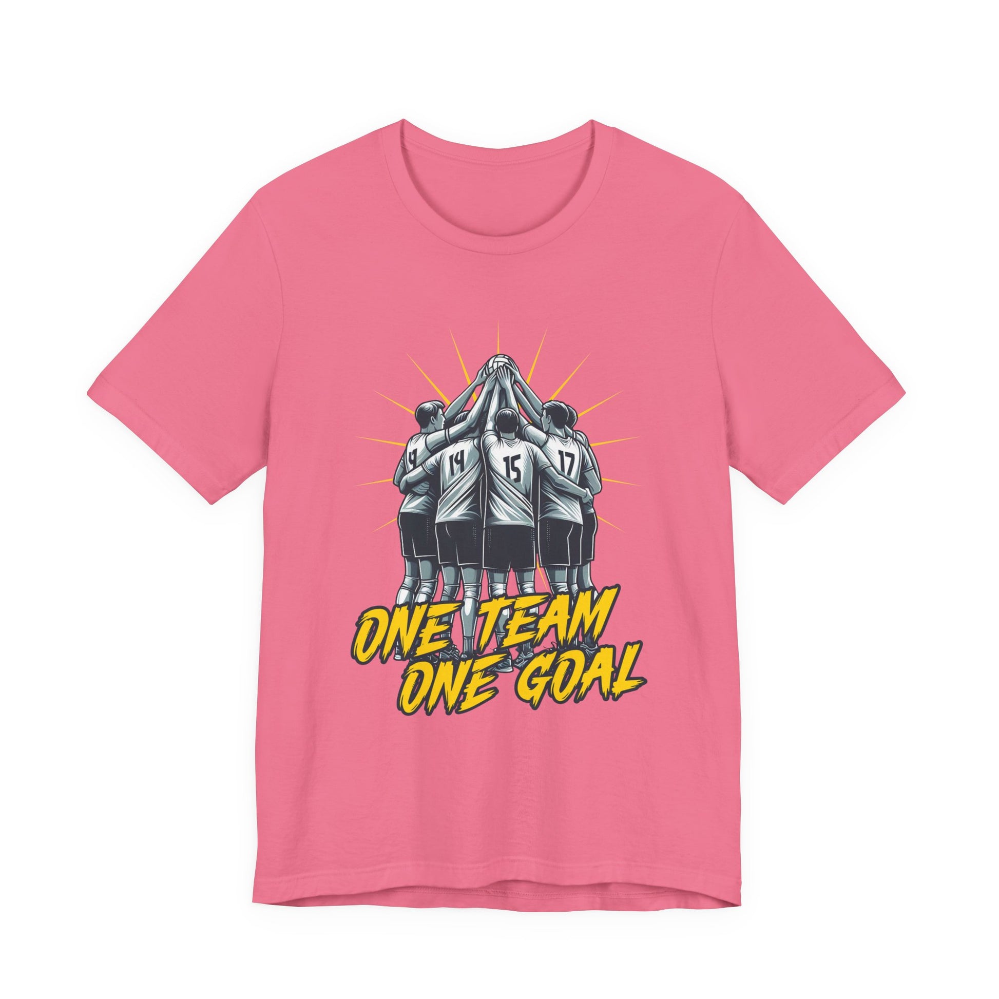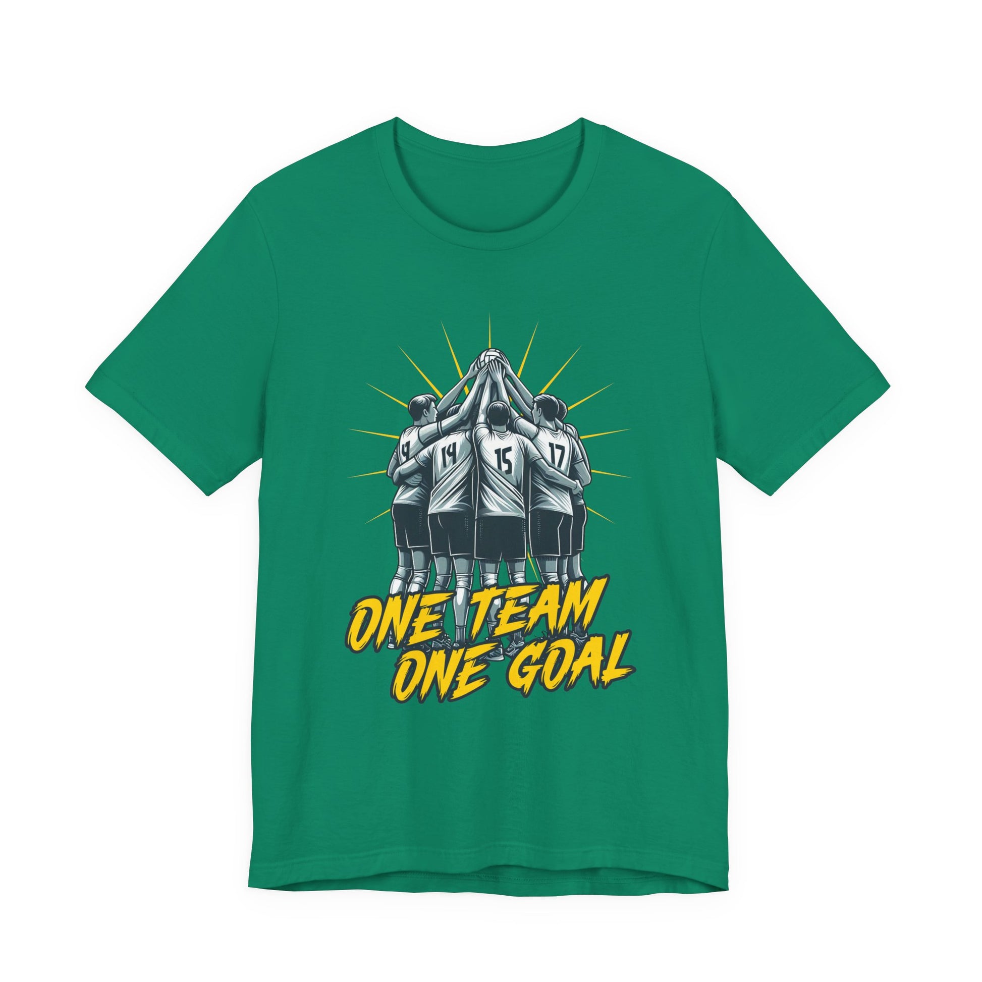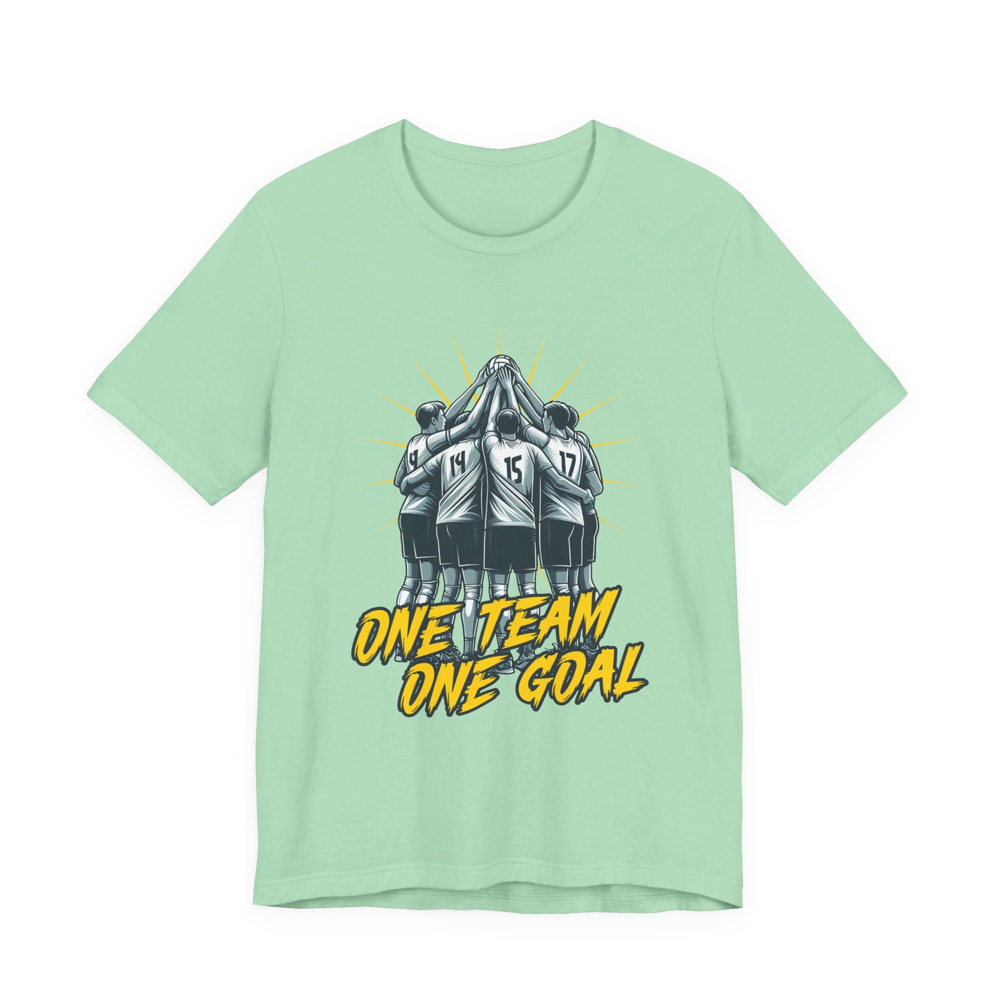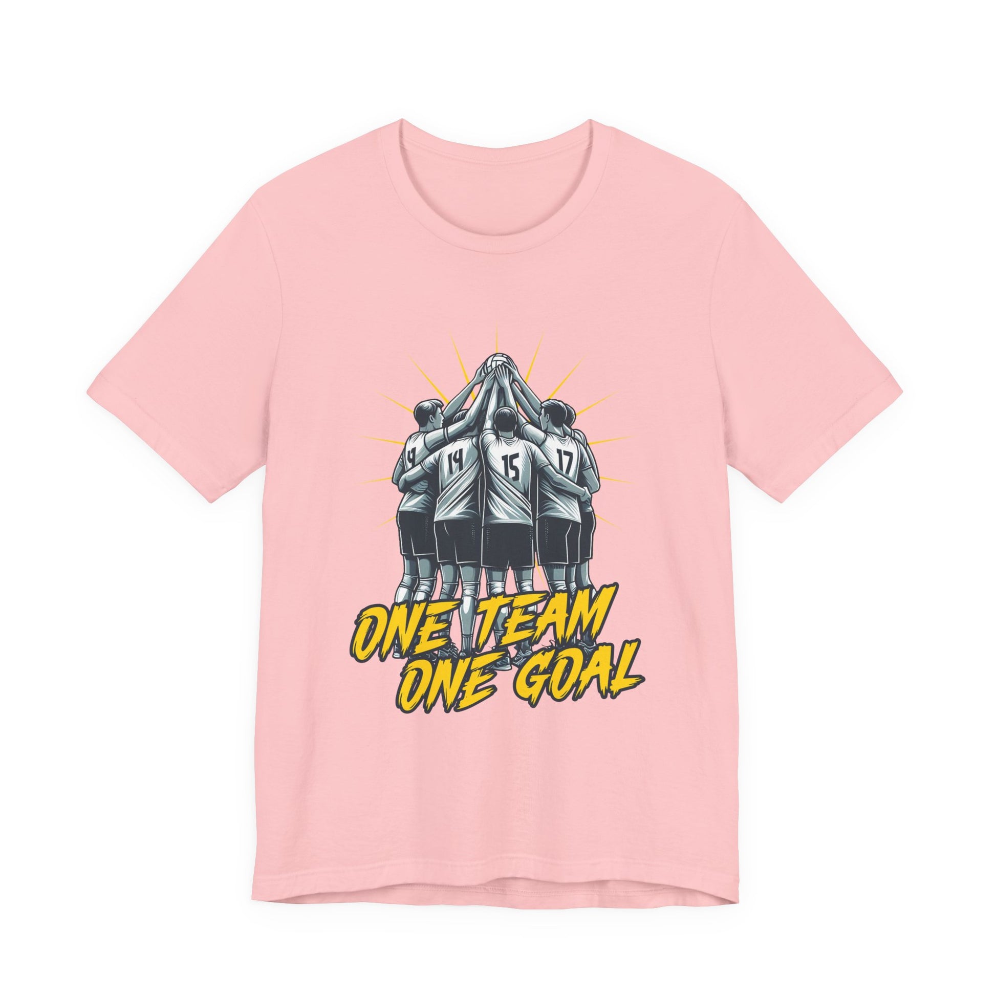 Show your team spirit with this "One Team One Goal" t-shirt, featuring a powerful graphic of a group of men’s team huddling together, hands stacked on top in a classic team huddle pose. This design captures the essence of unity, determination, and collective purpose—perfect for sports teams, group events, or anyone who values teamwork and camaraderie. The bold slogan and dynamic illustration make this tee a standout choice for building motivation and representing your squad. Crafted from soft, comfortable fabric, it’s ideal for game days, training sessions, or everyday wear that celebrates the power of togetherness.