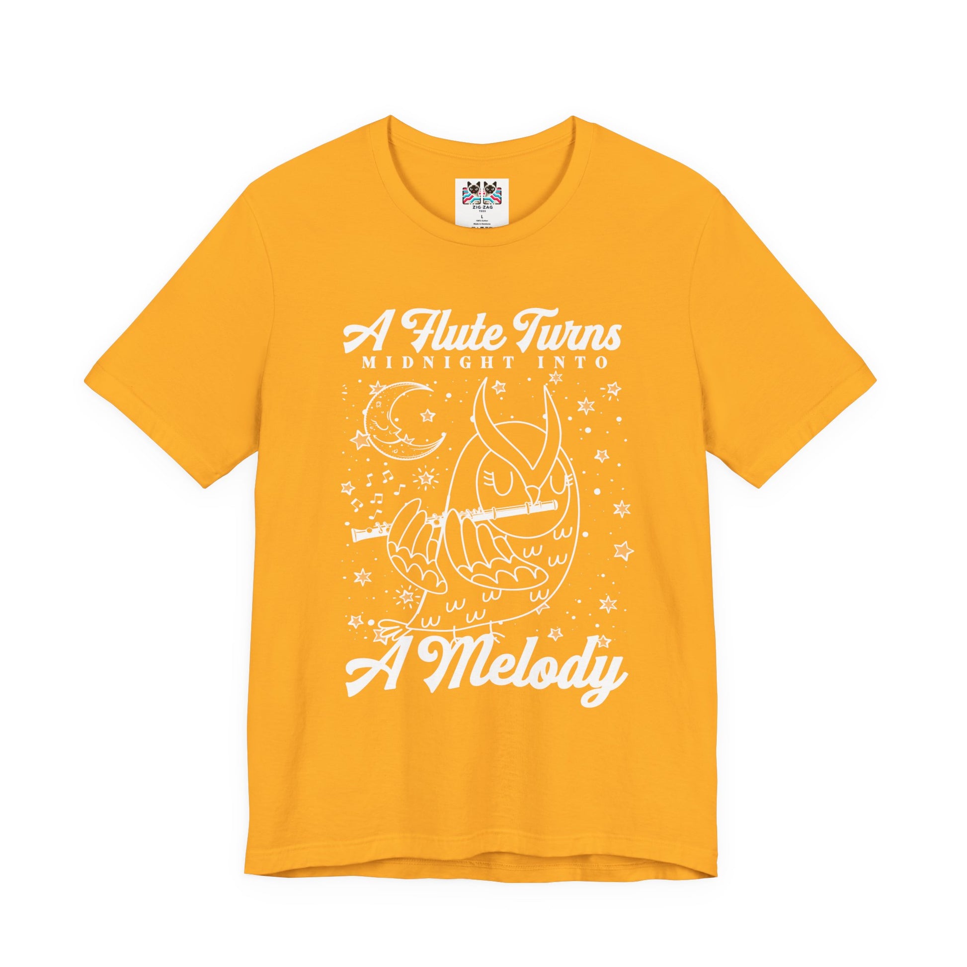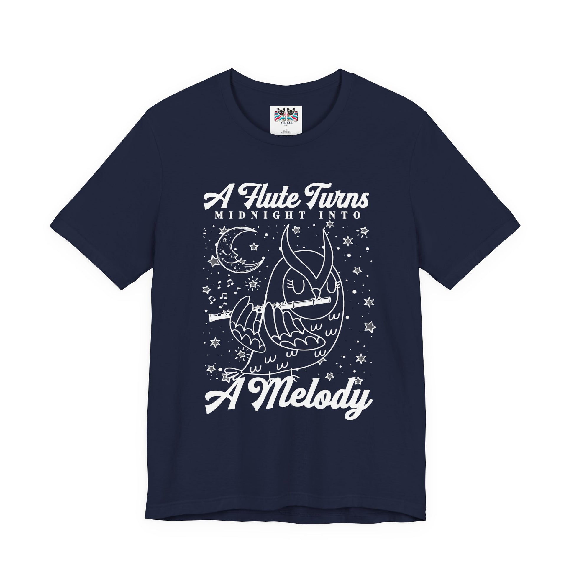 Embrace the magic of night music with this enchanting owl flute t-shirt. The front features an outline-style owl playing the flute with music notes swirling behind it and the phrase “A Flute Turns Midnight into a Melody,” while the back shows an owl playing flute on a tree before a huge full moon with the text “An Owl’s Flute Transforms the Moonlight into Music.” Perfect for flute players, owl lovers, band and orchestra members, and fans of mystical night designs, this tee is great for concerts, rehearsals, school events, or cozy evening wear. It also makes a unique gift for musicians and dreamers who feel most inspired under the moonlight.