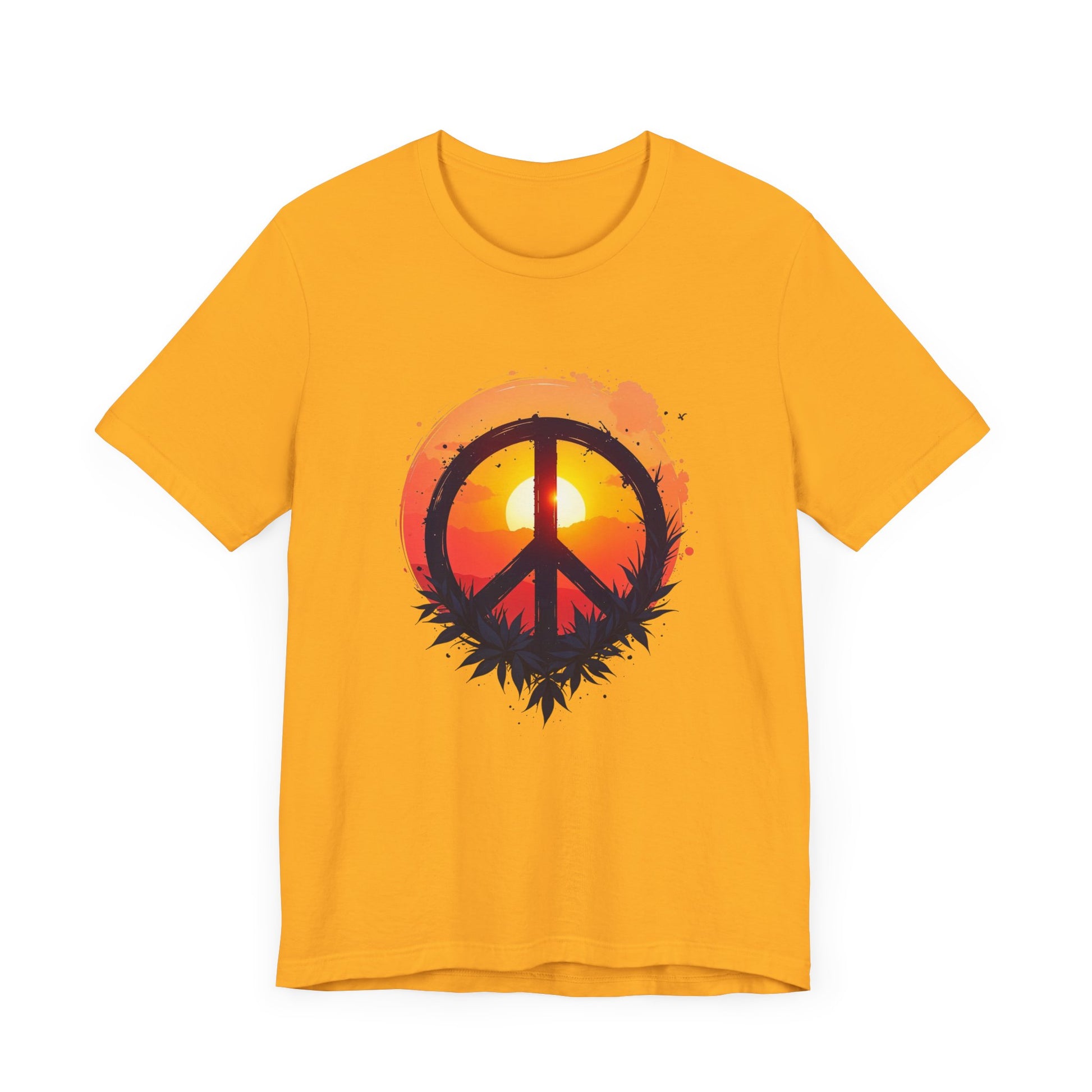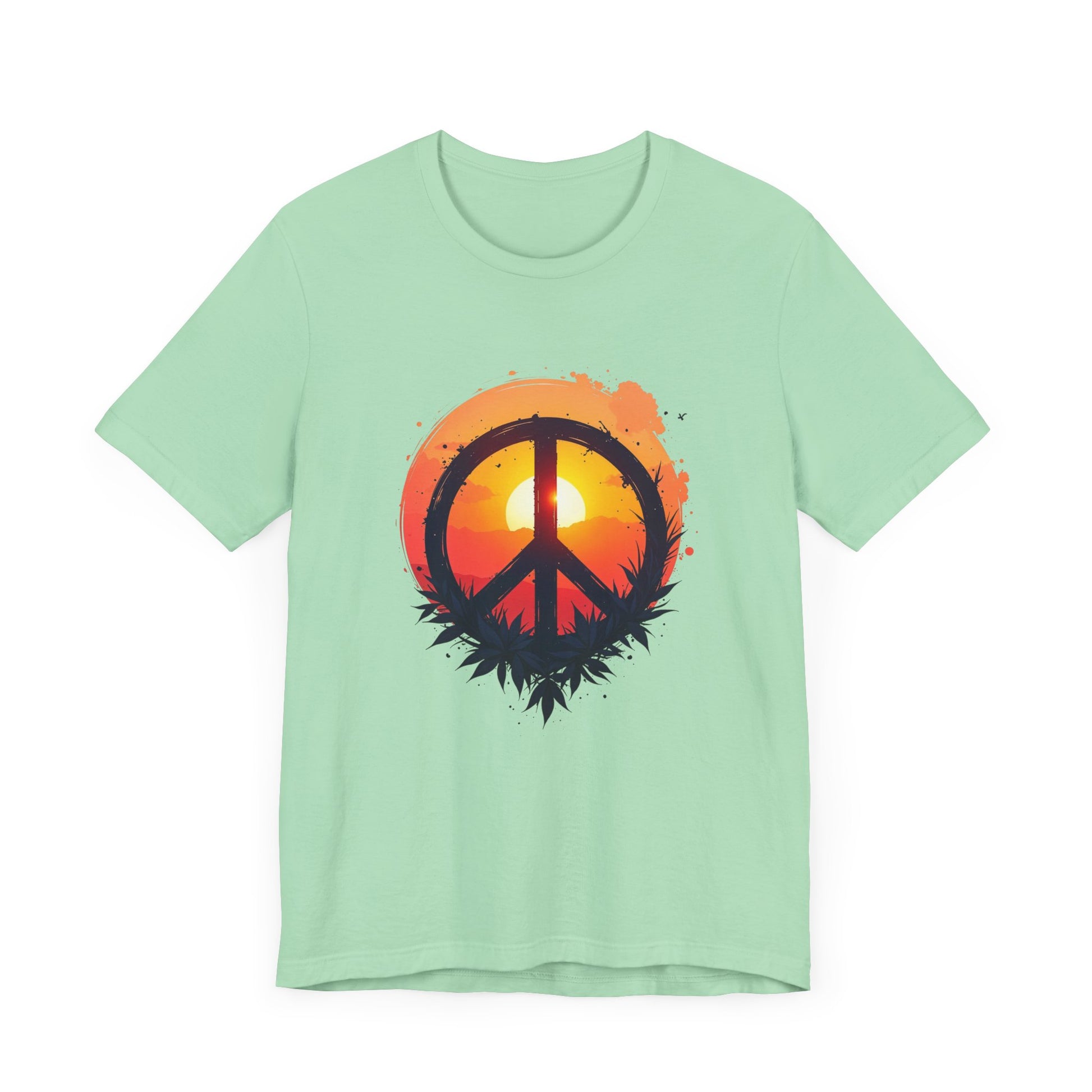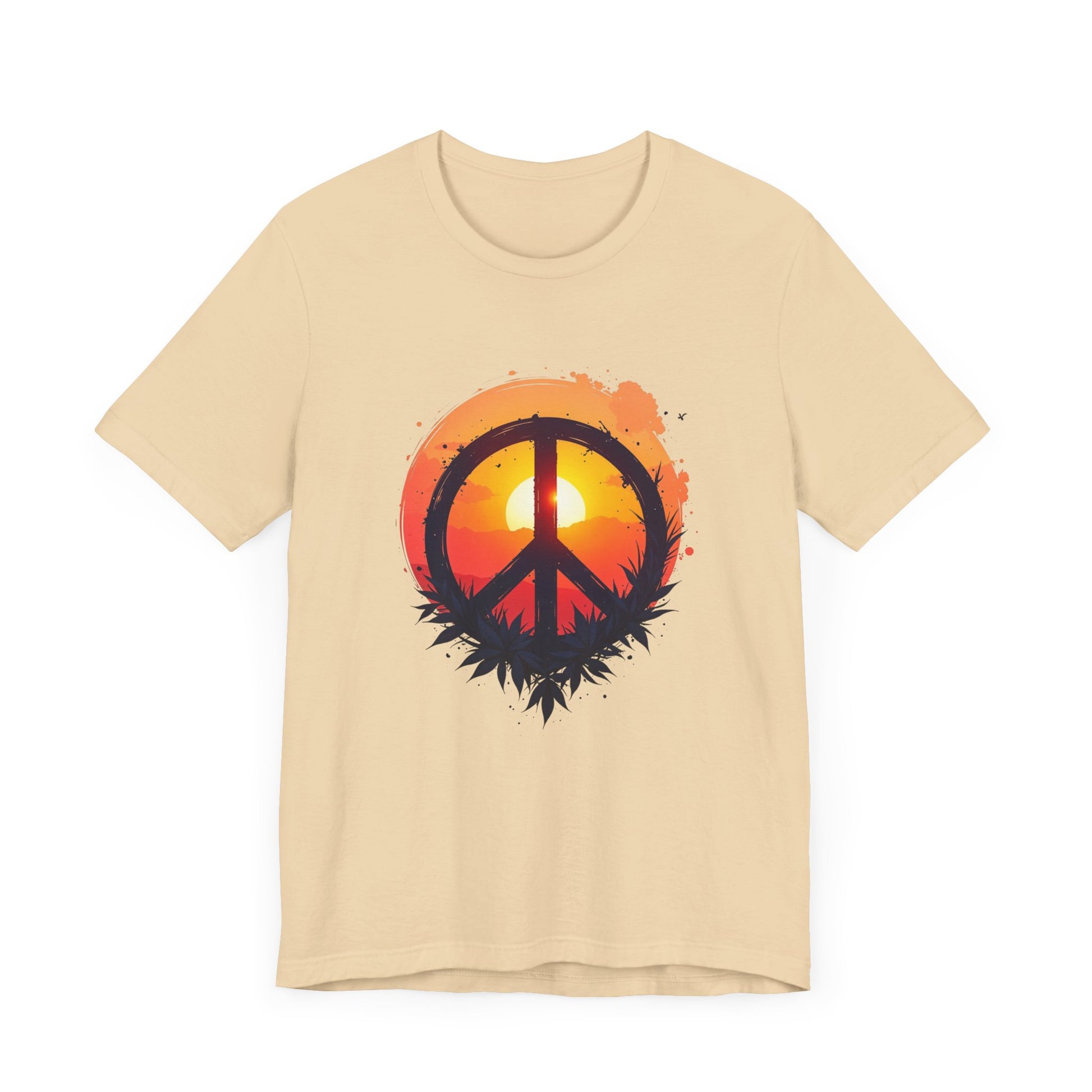 Embrace the spirit of peace and tranquility with this eye-catching Peace Sunset T-Shirt. Featuring a bold peace sign silhouetted against a vibrant sunset sky, this design blends retro hippie vibes with the calming beauty of nature. Subtle foliage at the base of the peace symbol adds a touch of earthiness, making this shirt perfect for free spirits, nature lovers, and anyone who believes in spreading good vibes.