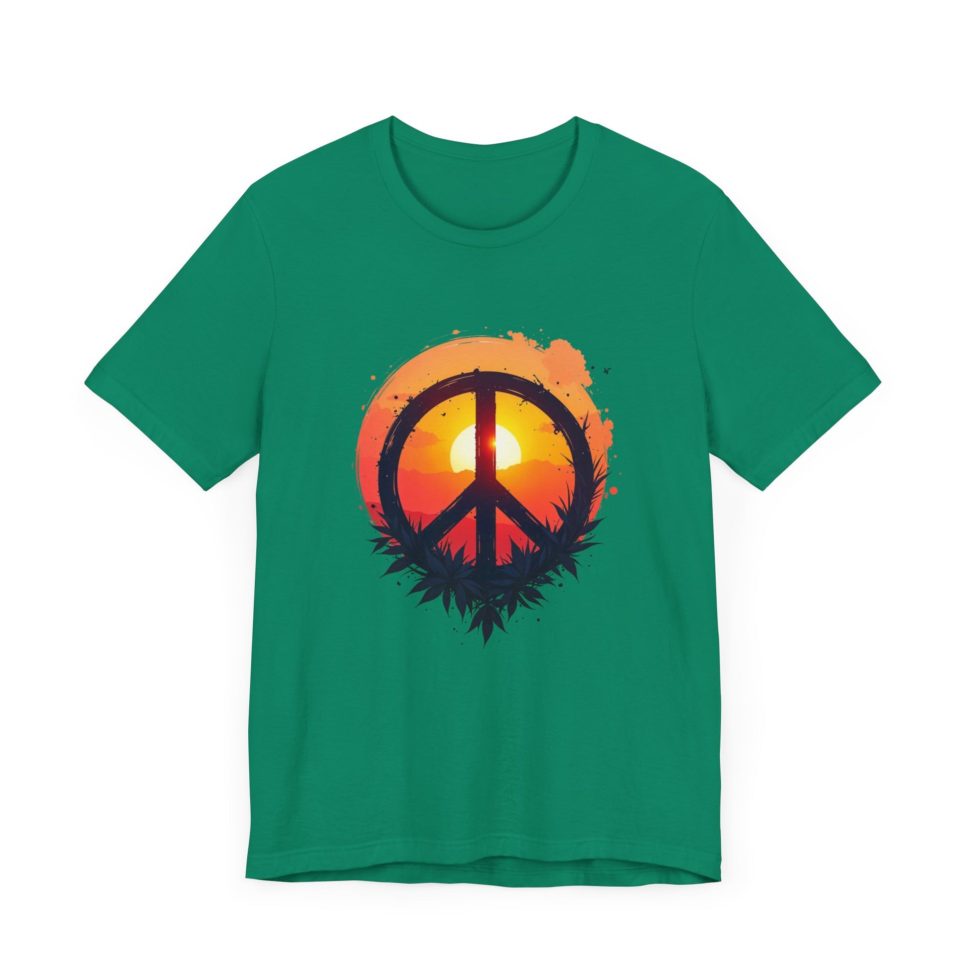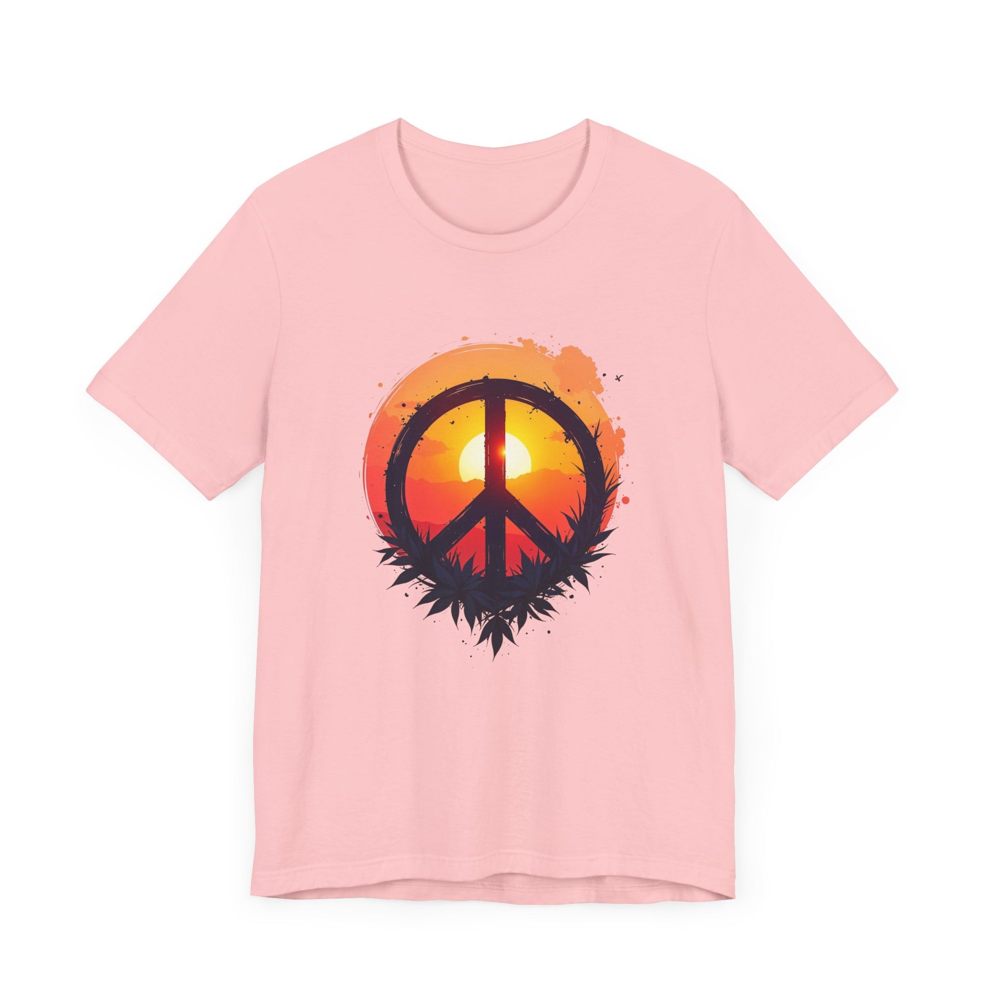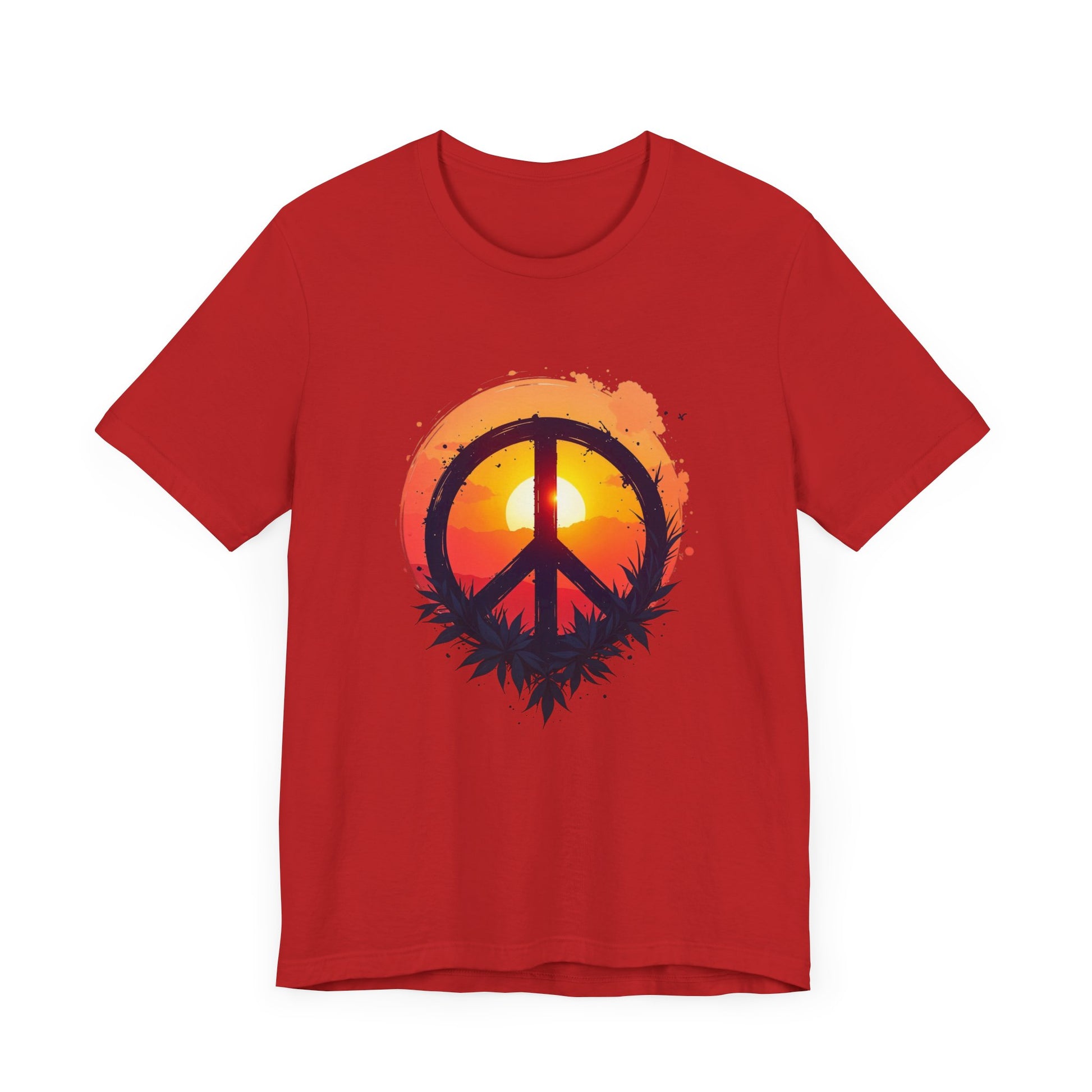 Embrace the spirit of peace and tranquility with this eye-catching Peace Sunset T-Shirt. Featuring a bold peace sign silhouetted against a vibrant sunset sky, this design blends retro hippie vibes with the calming beauty of nature. Subtle foliage at the base of the peace symbol adds a touch of earthiness, making this shirt perfect for free spirits, nature lovers, and anyone who believes in spreading good vibes.