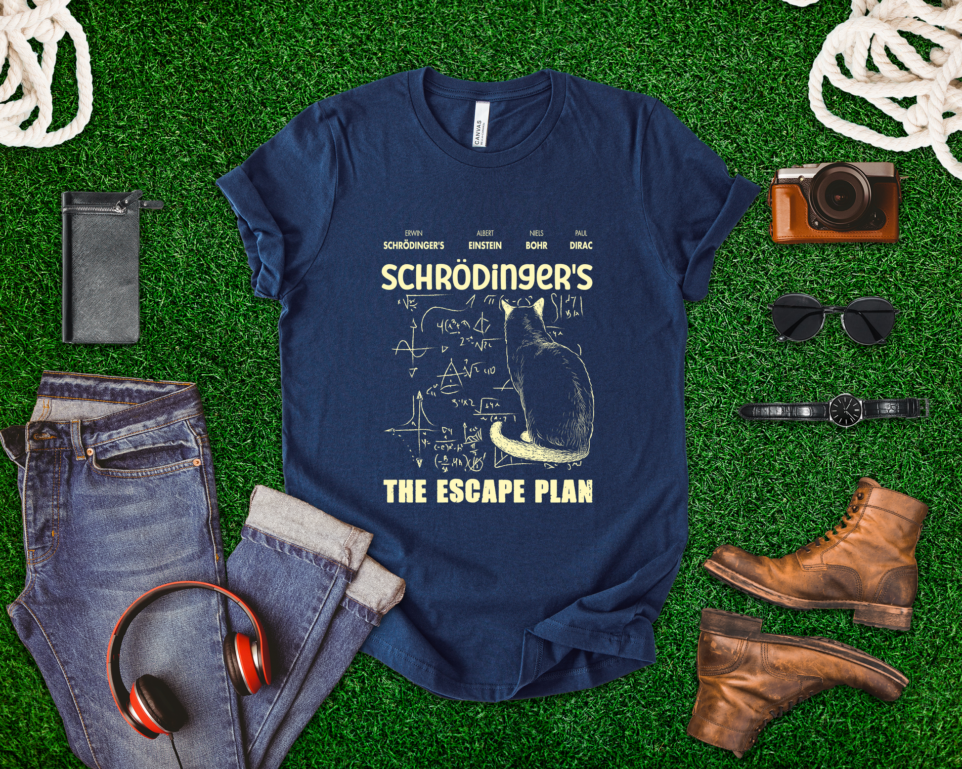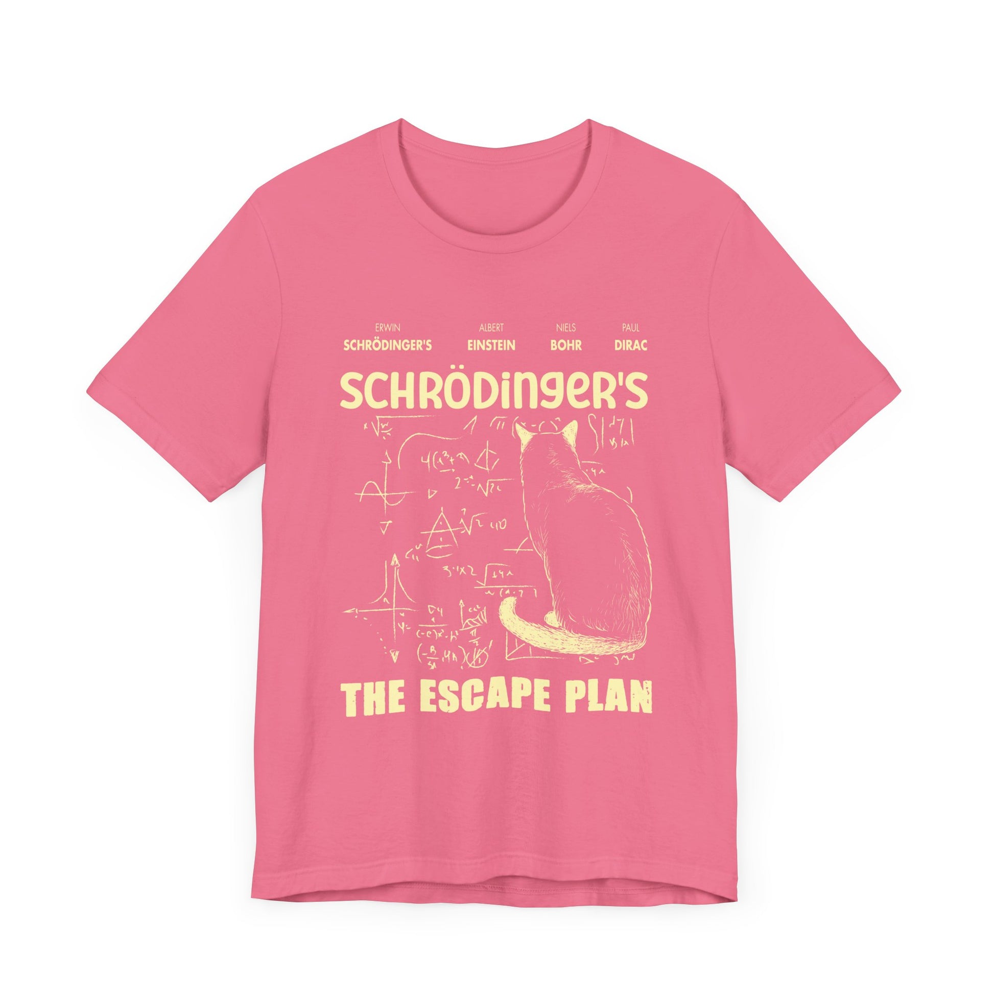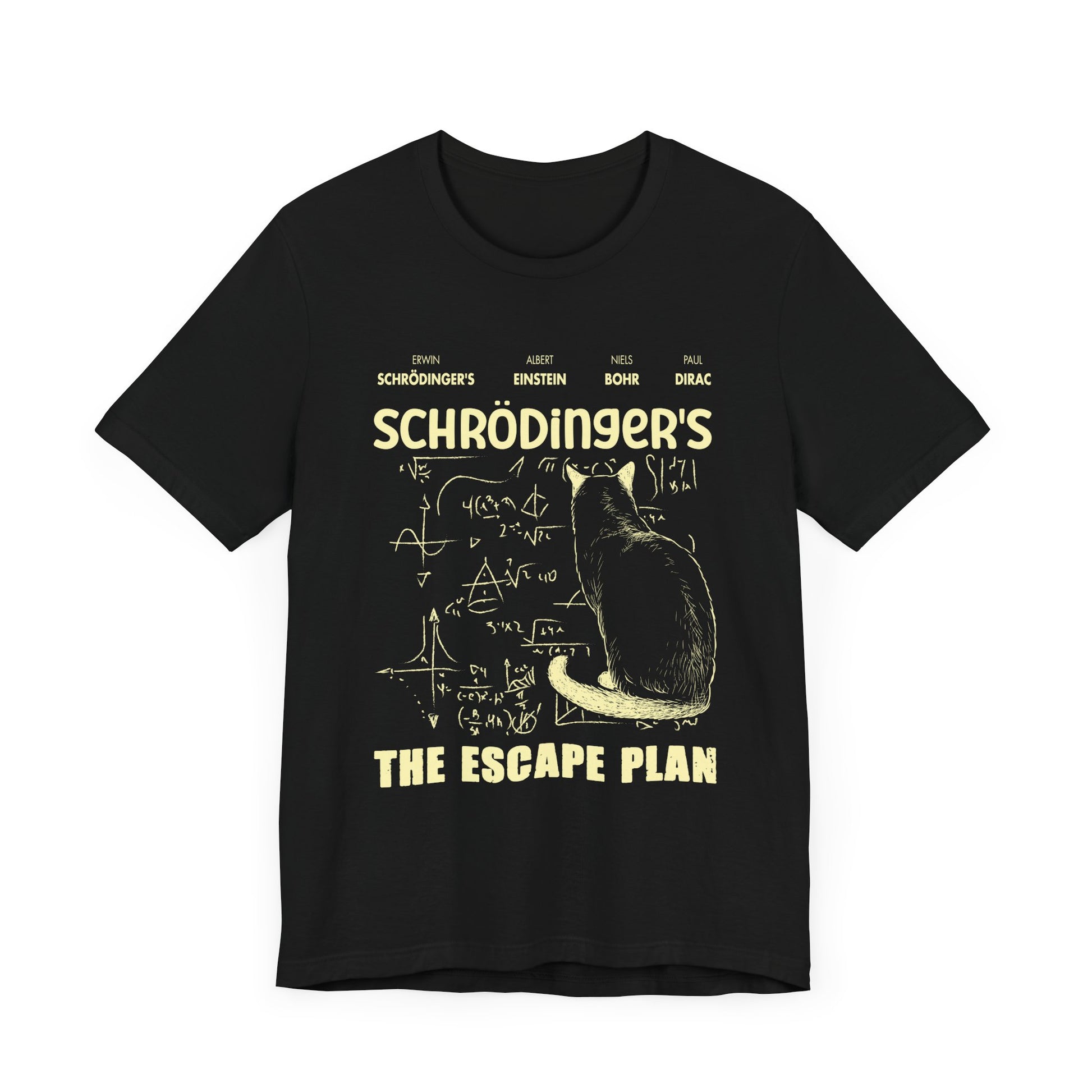Unleash your inner science nerd with this clever “Schrödinger’s The Escape Plan” t-shirt! Featuring a whimsical illustration of Schrödinger’s cat plotting its escape with chalkboard-style equations, this tee is a perfect blend of physics humor and feline mischief. The design highlights the names of legendary physicists—Erwin Schrödinger, Albert Einstein, Niels Bohr, and Paul Dirac—making it a standout for anyone passionate about quantum mechanics and classic science jokes.
