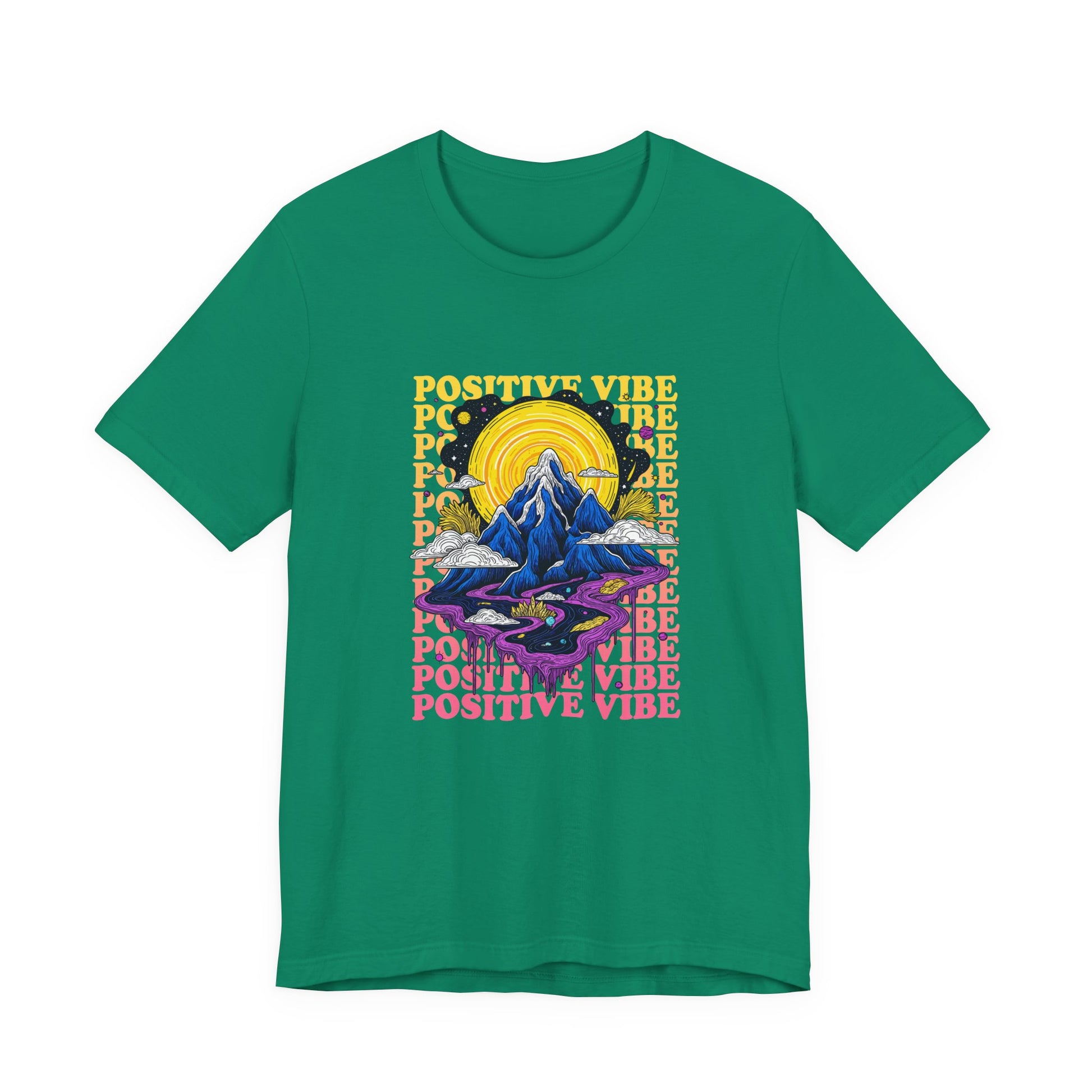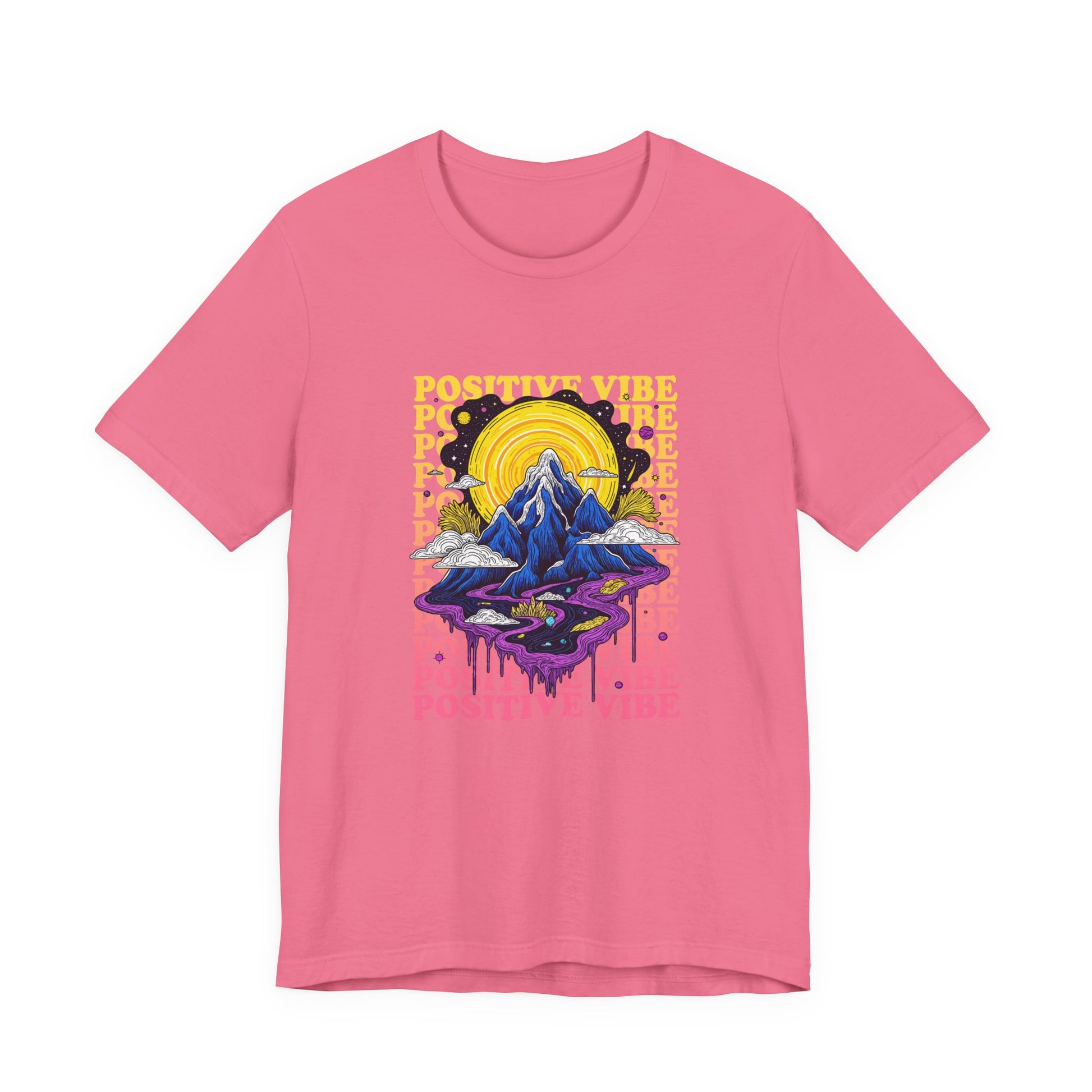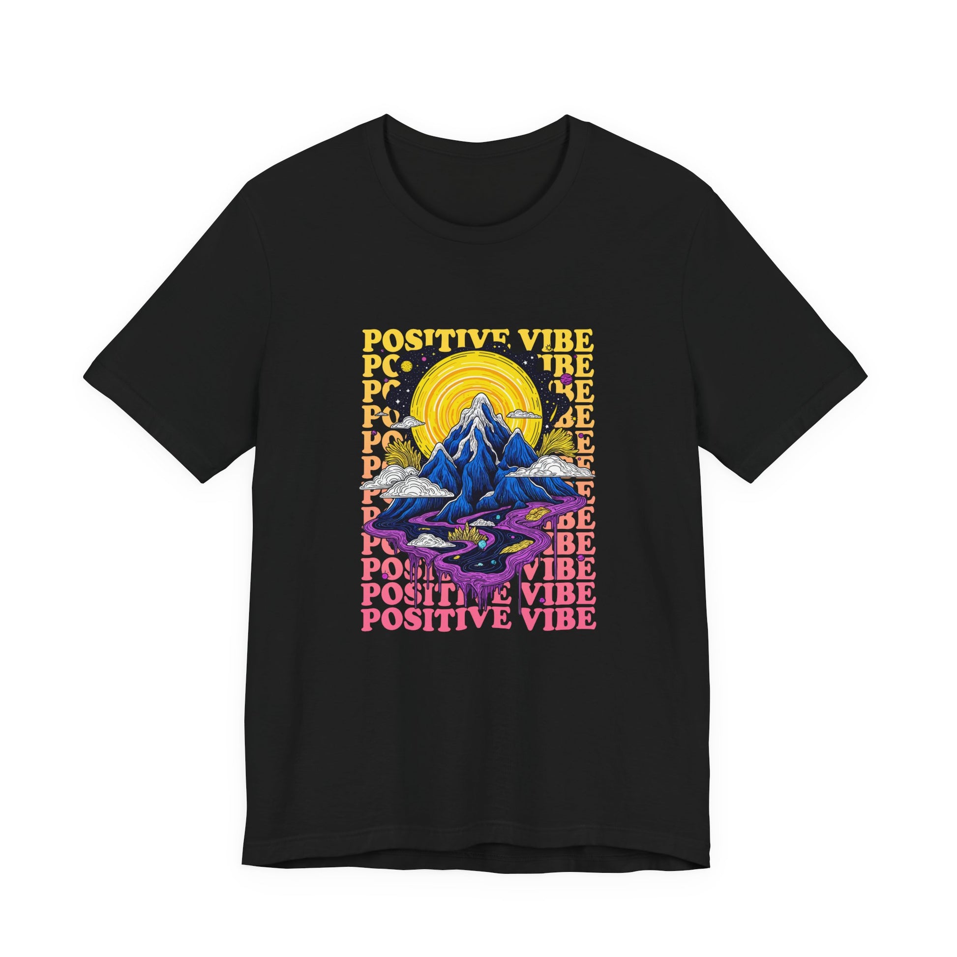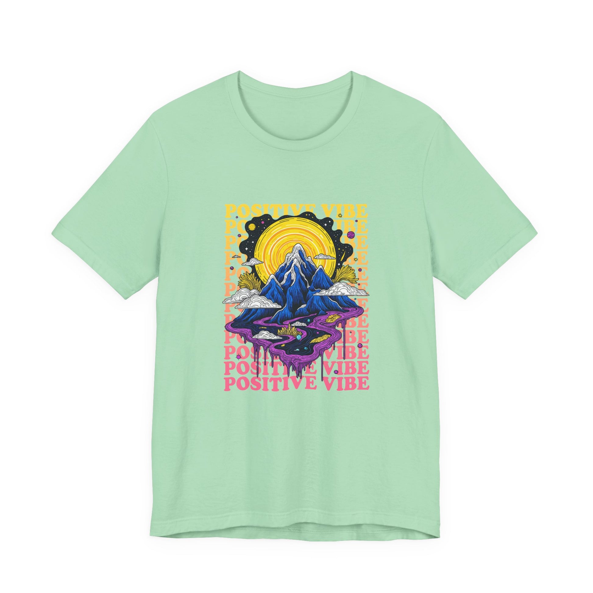 Elevate your outlook with this "Positive Vibes" t-shirt, featuring the uplifting phrase repeated in a vibrant backdrop behind an imaginative scene: a radiant large sun, swirling solar system, massive mountain peaks, dreamy clouds, and mesmerizing liquid flows dripping slowly through the design. This cosmic landscape channels optimism and wonder, blending celestial beauty with surreal, artistic flair. Crafted from soft, comfortable fabric, this tee is perfect for those who love unique, inspiring art and want to radiate positivity wherever they go. Wear it to stand out, spark conversations, and spread good energy every day.