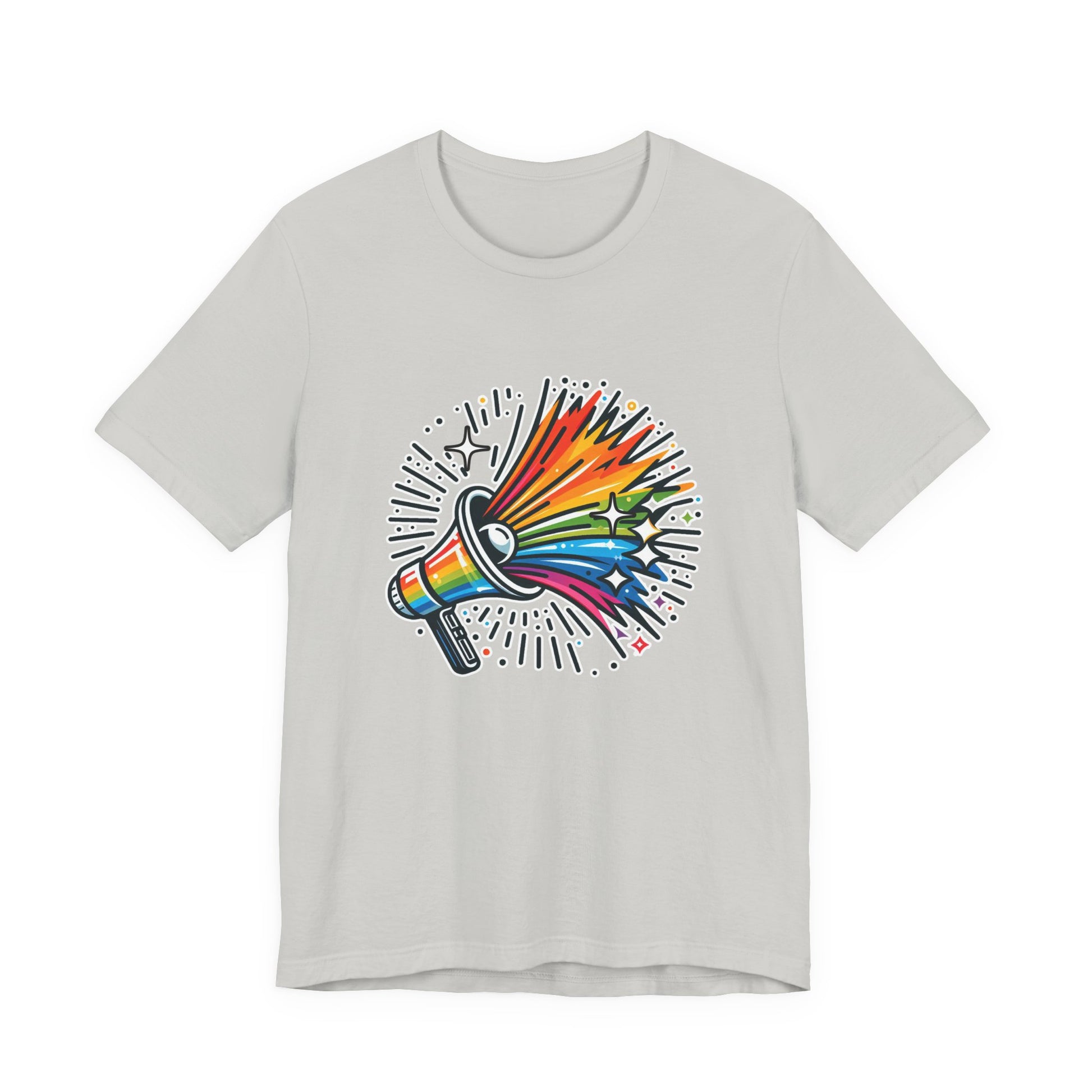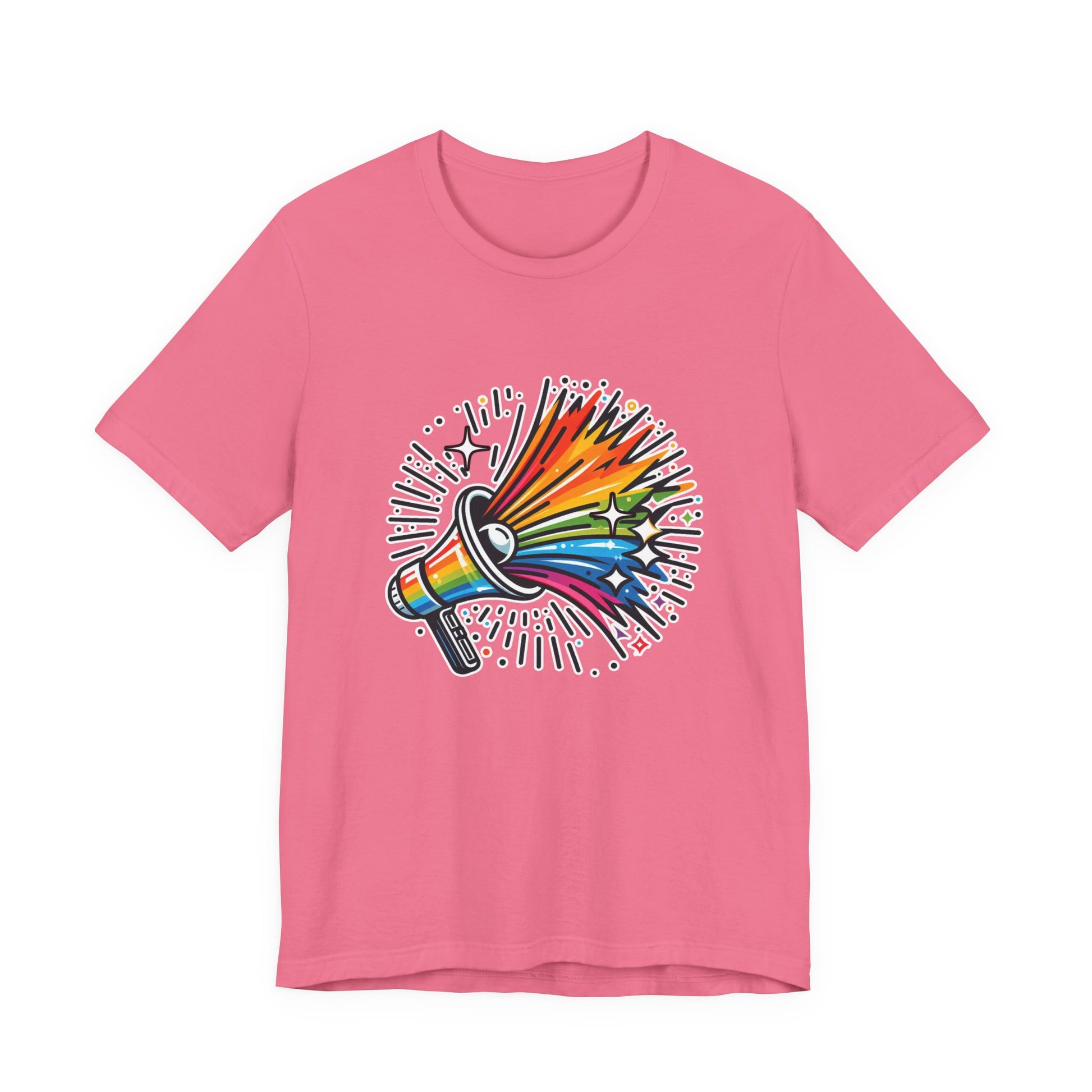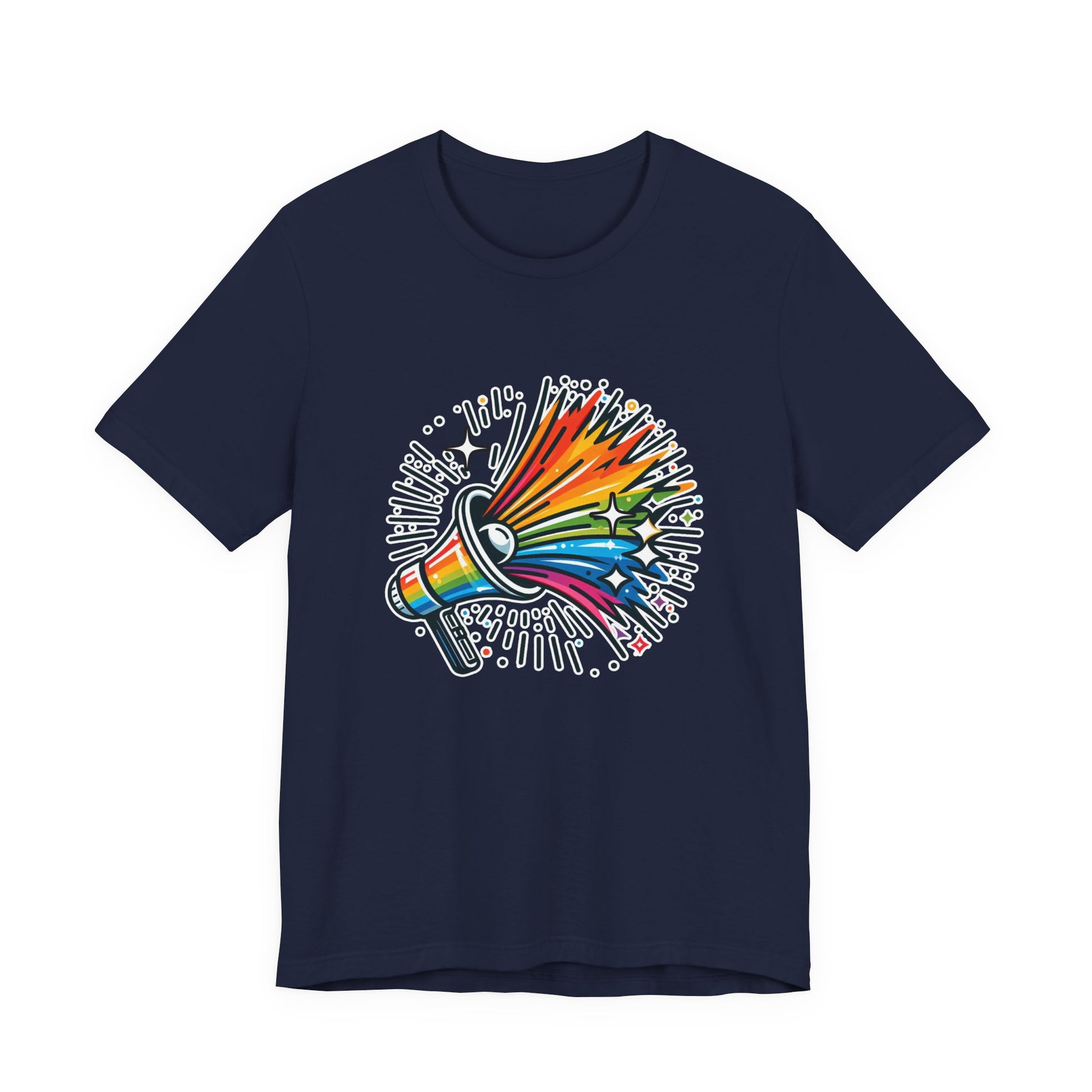 Proud & Loud – Colorful Handheld Speaker with Exploding Stars Graphic T-Shirt