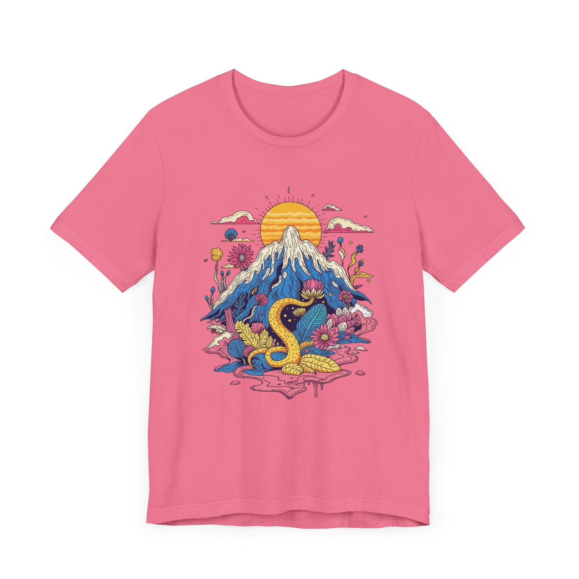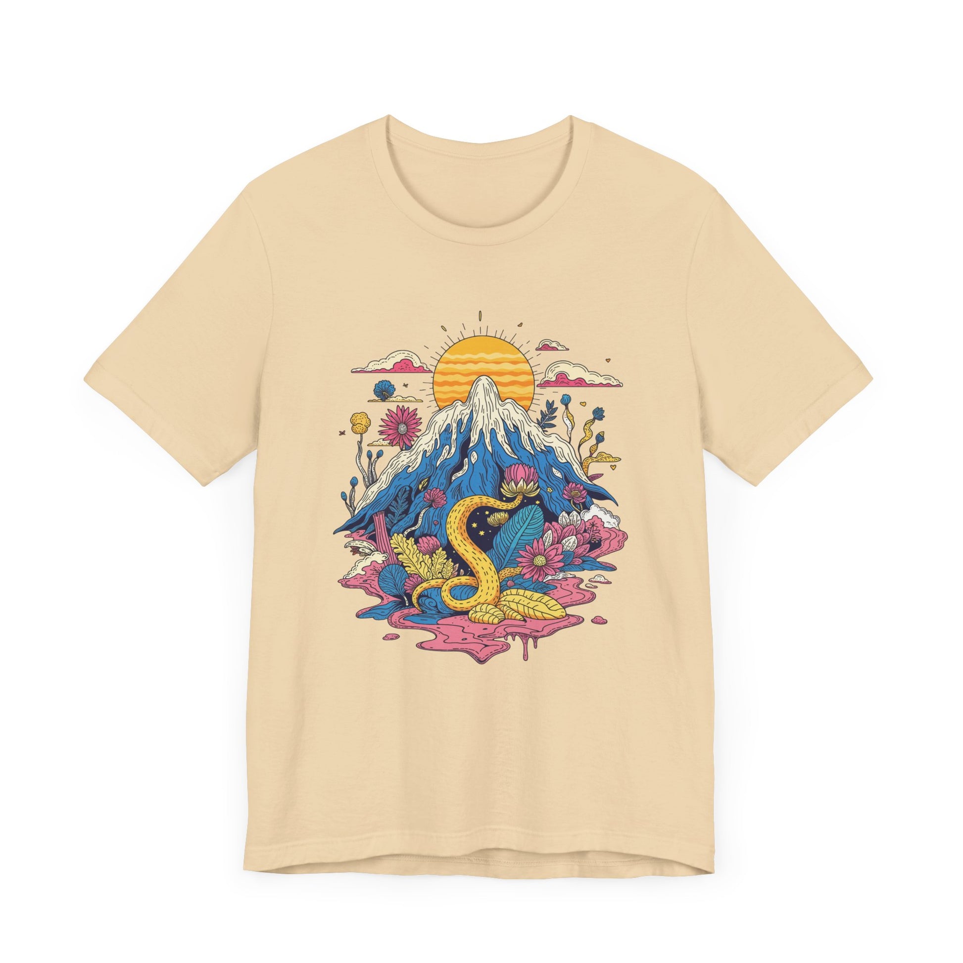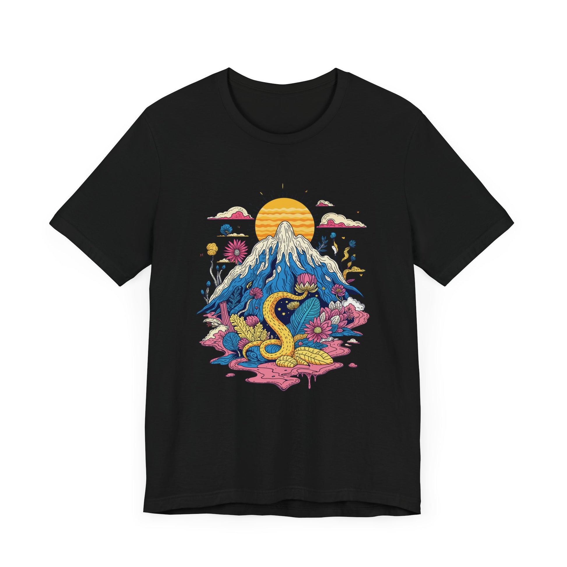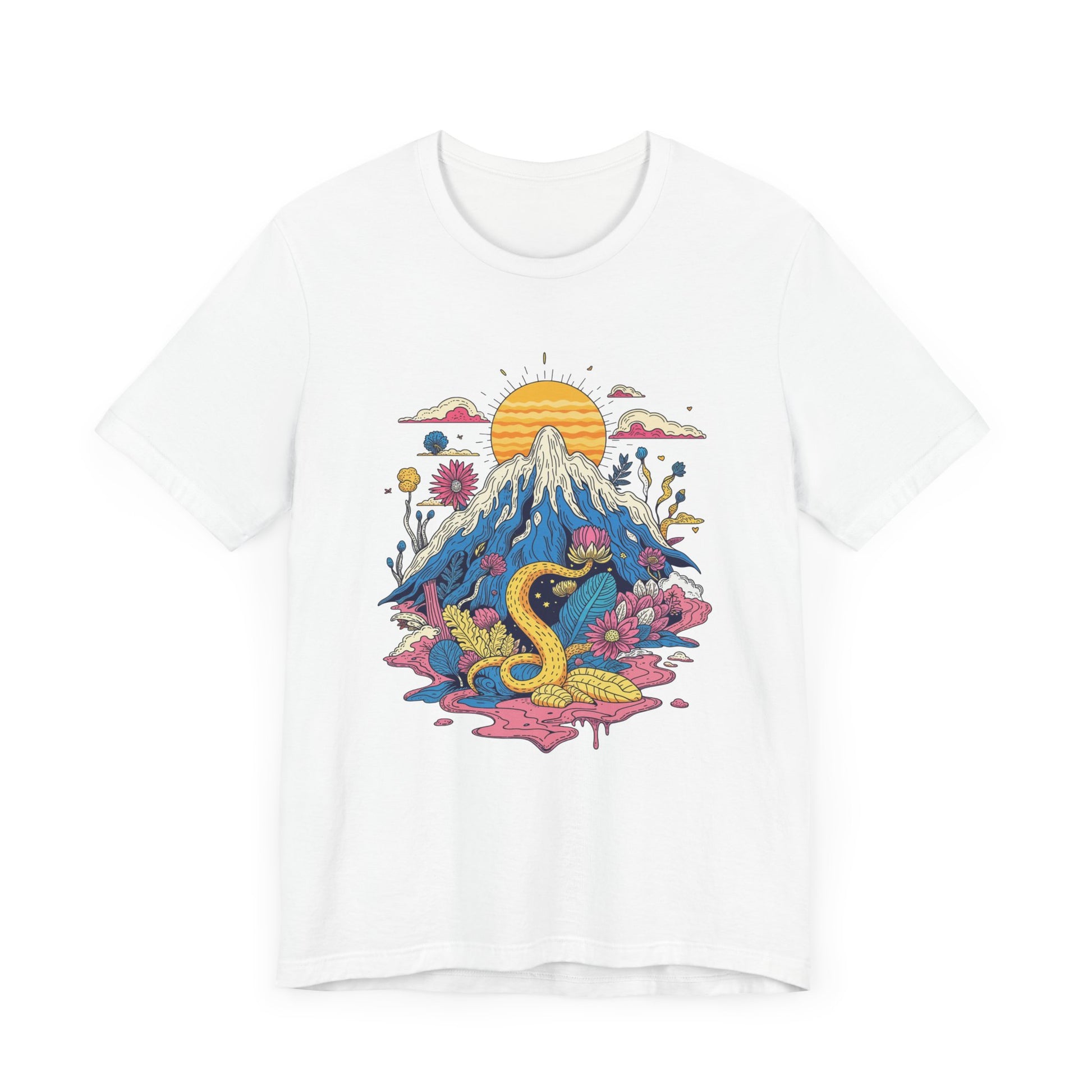 Immerse yourself in vibrant adventure with this psychedelic t-shirt featuring a lush jungle scene, a bold mountain rising at the center, and a massive sun enveloping the peak in radiant color. The design bursts with swirling, trippy details and a palette of intense hues, capturing the energy of a psychological jungle landscape and the mystique of a sun-soaked mountain. Perfect for fans of psychedelic art, festival style, and nature-inspired graphics, this shirt is crafted from soft, high-quality fabric for standout comfort and visual impact