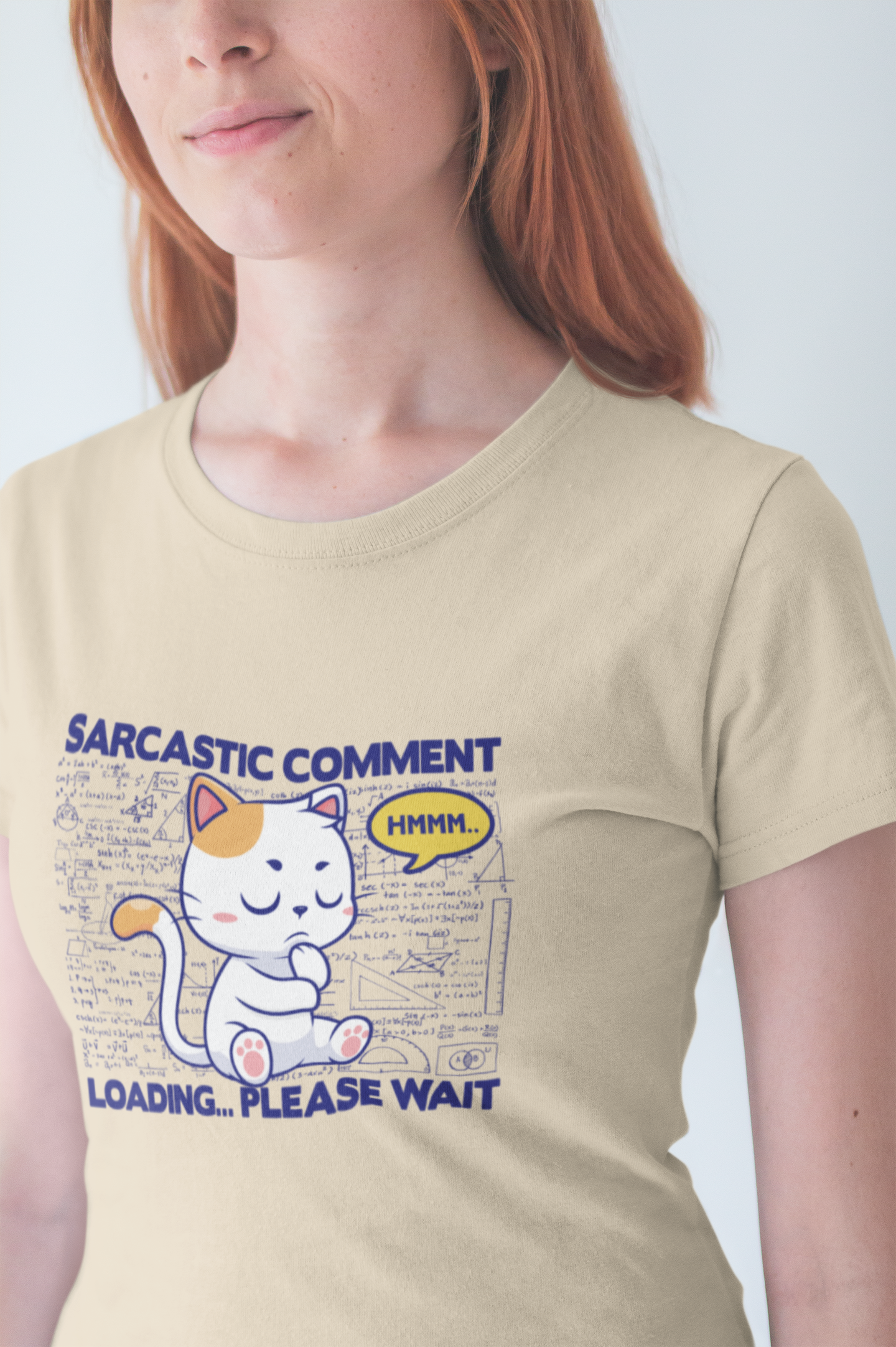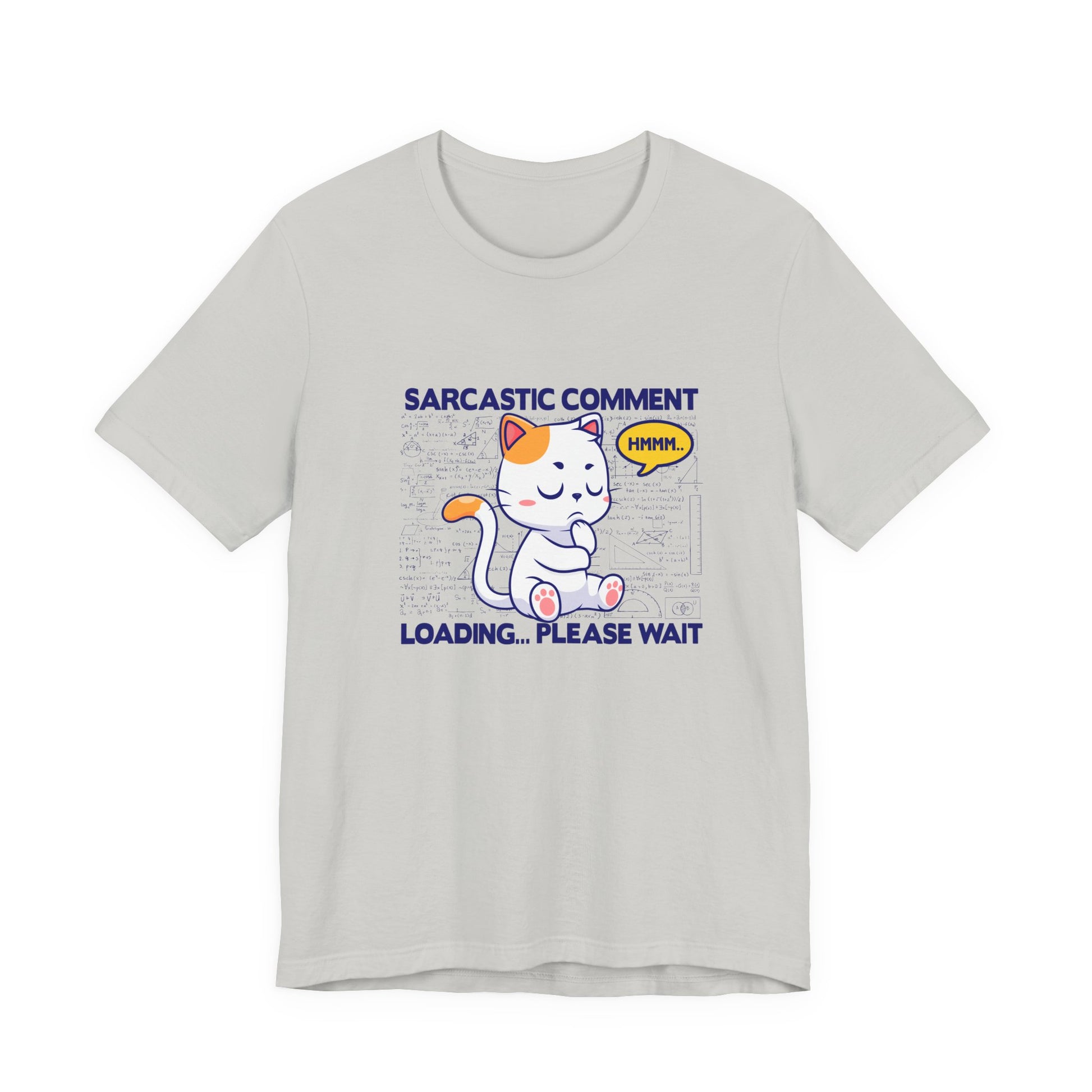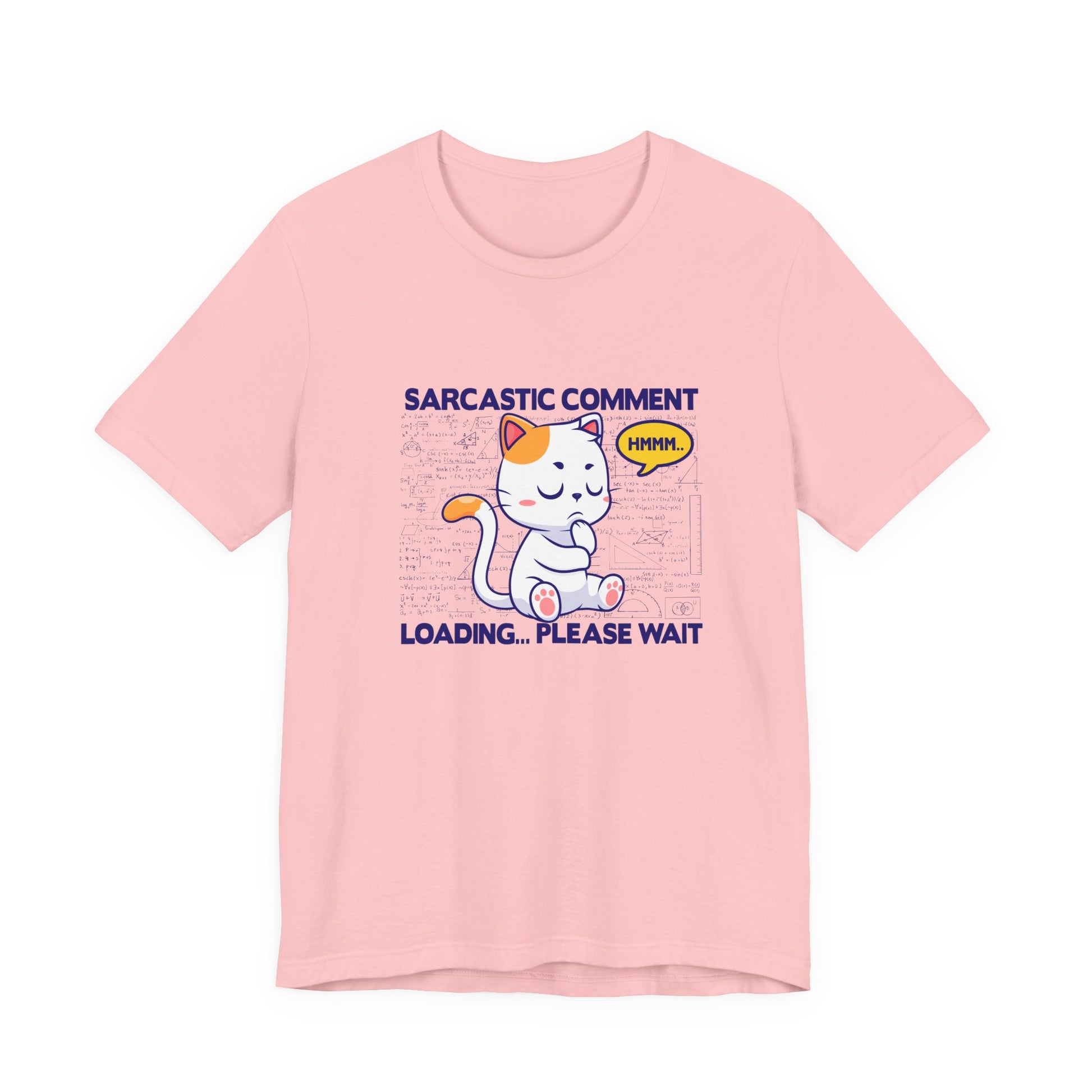 Show your witty side with this clever tshirt featuring a cat with a thought bubble reading "HMMM..." set against a background filled with complex math diagrams and formulas. The large, bold text "Sarcastic Comment Loading please wait" adds humor and personality, perfect for those who appreciate sarcasm, clever humor, and a touch of nerdy charm. Ideal for math lovers, cat enthusiasts, students, teachers, or anyone who enjoys playful, intelligent graphic tees. This comfortable and eye-catching tshirt is great for casual wear, gifts, or making a smart, humorous statement wherever you go.
