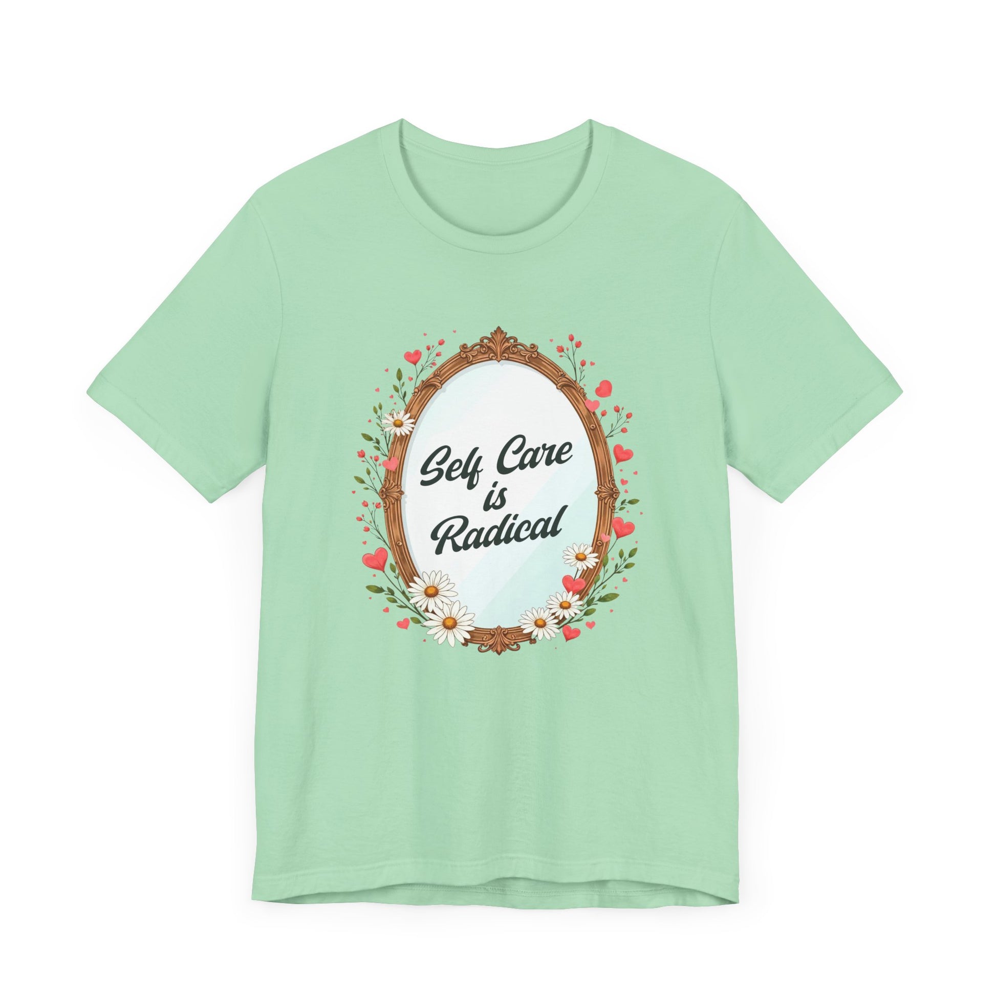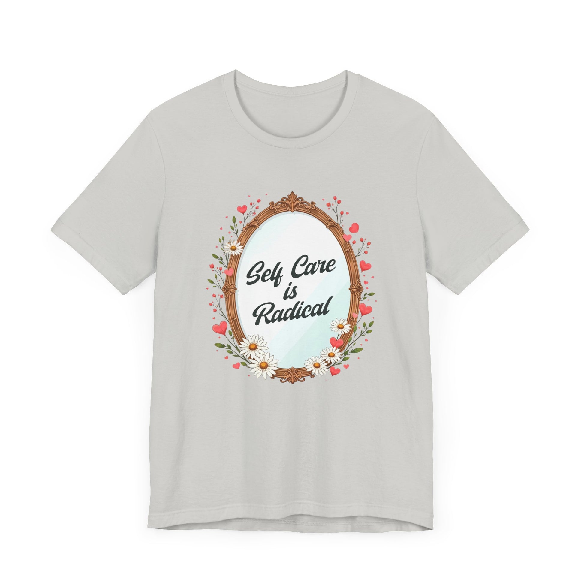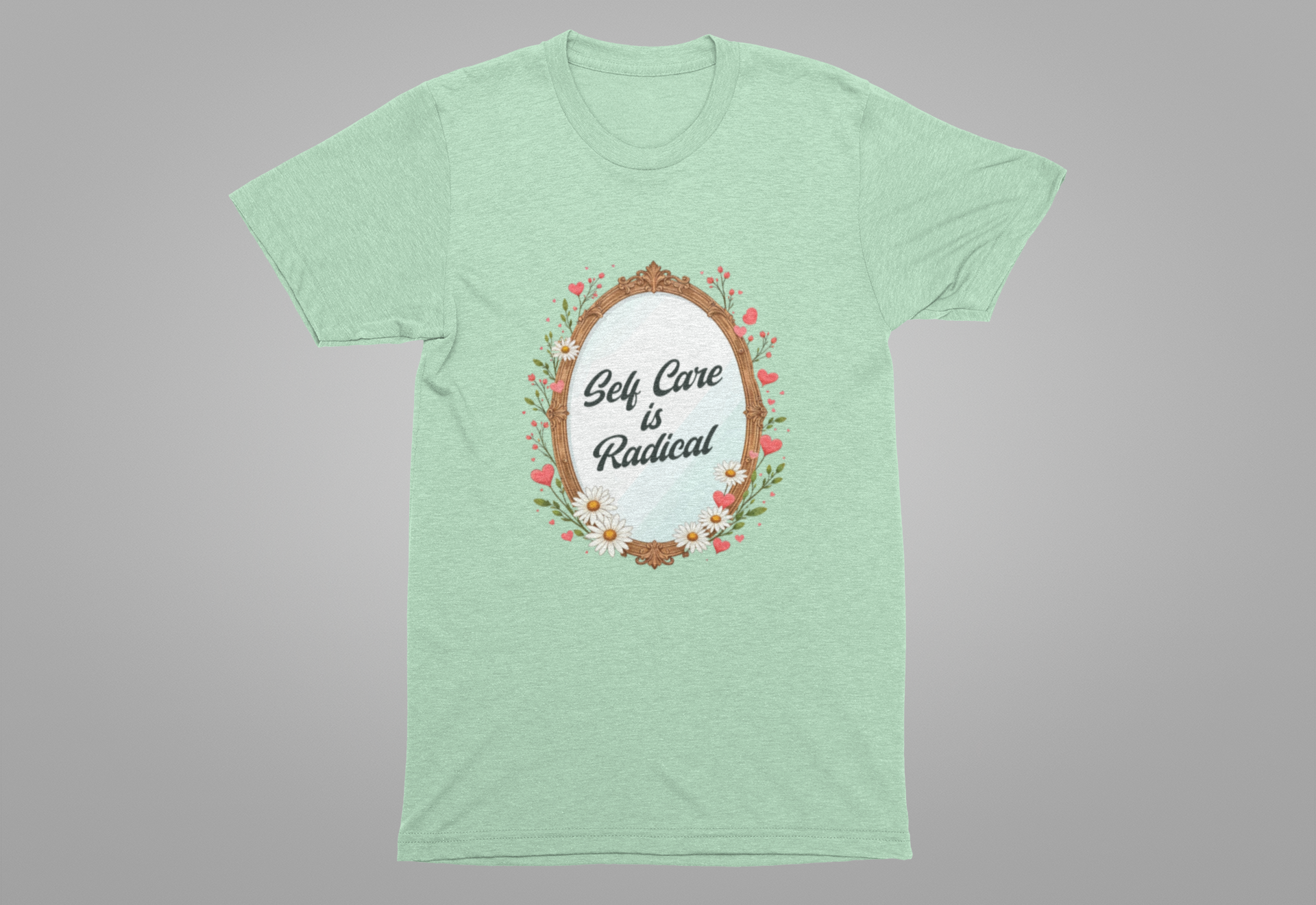 Celebrate the revolutionary power of self-care with this inspiring t-shirt featuring the bold text "Self Care is Radical" positioned above a large, elegant oval mirror. The mirror is beautifully adorned with delicate flowers surrounding its frame, symbolizing growth, reflection, and nurturing your well-being. This design is a perfect reminder that prioritizing yourself is a powerful and transformative act. Crafted from soft, high-quality fabric, this tee blends meaningful messaging with stylish aesthetics, ideal for anyone embracing self-love and mental wellness.