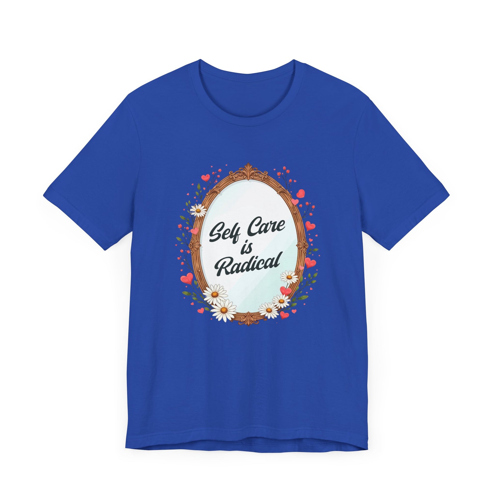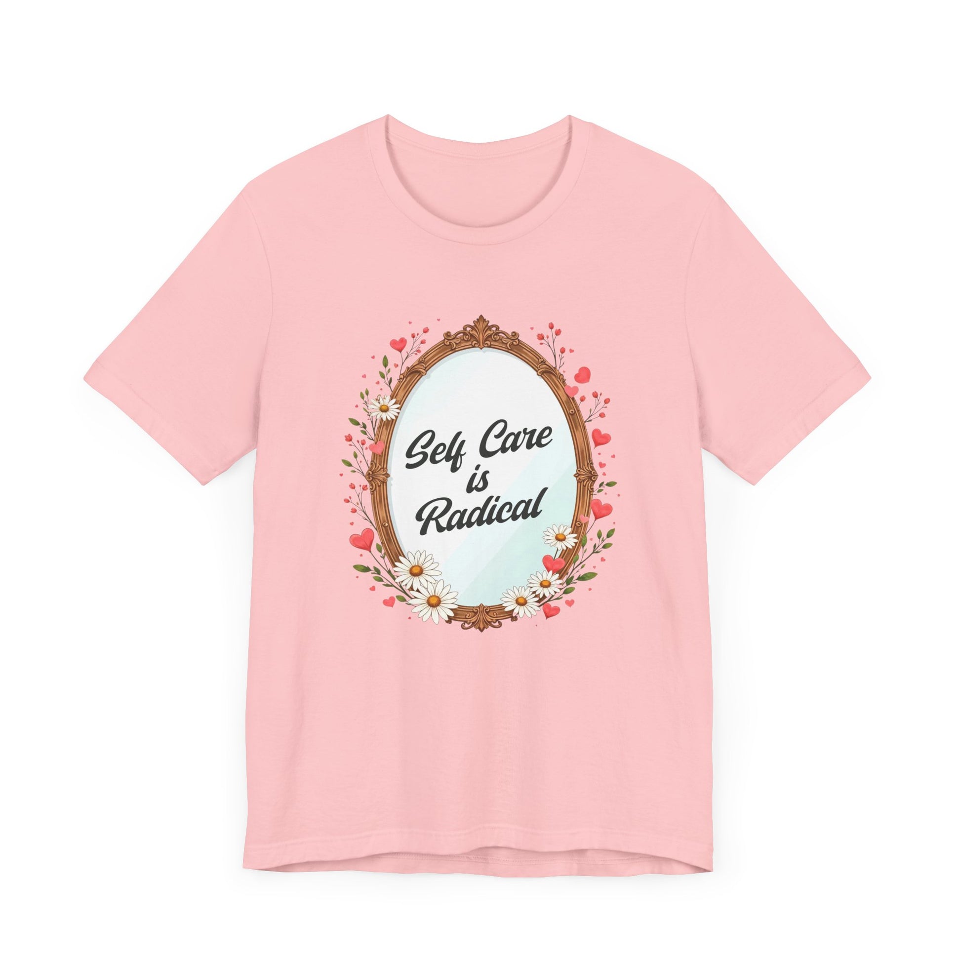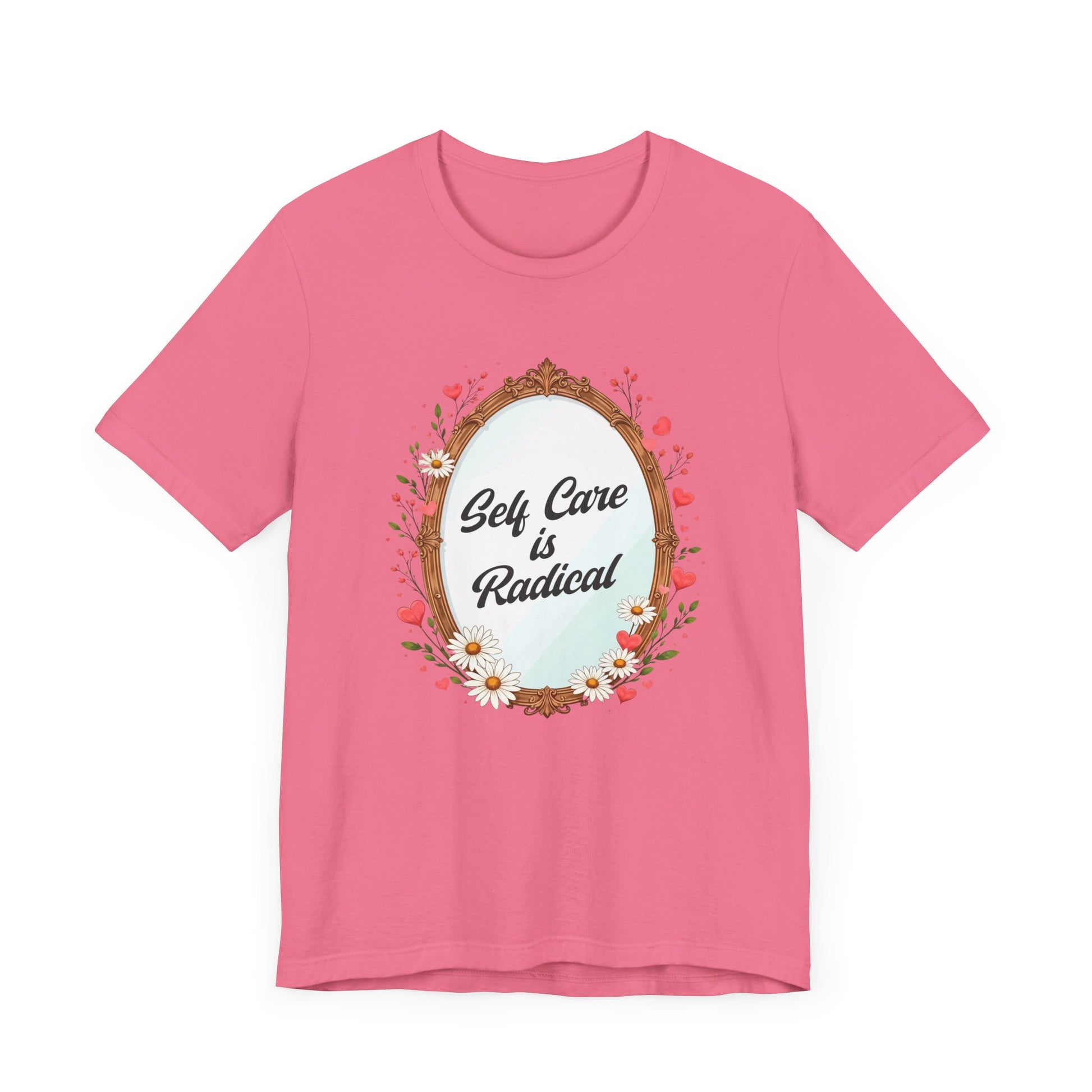 Celebrate the revolutionary power of self-care with this inspiring t-shirt featuring the bold text "Self Care is Radical" positioned above a large, elegant oval mirror. The mirror is beautifully adorned with delicate flowers surrounding its frame, symbolizing growth, reflection, and nurturing your well-being. This design is a perfect reminder that prioritizing yourself is a powerful and transformative act. Crafted from soft, high-quality fabric, this tee blends meaningful messaging with stylish aesthetics, ideal for anyone embracing self-love and mental wellness.