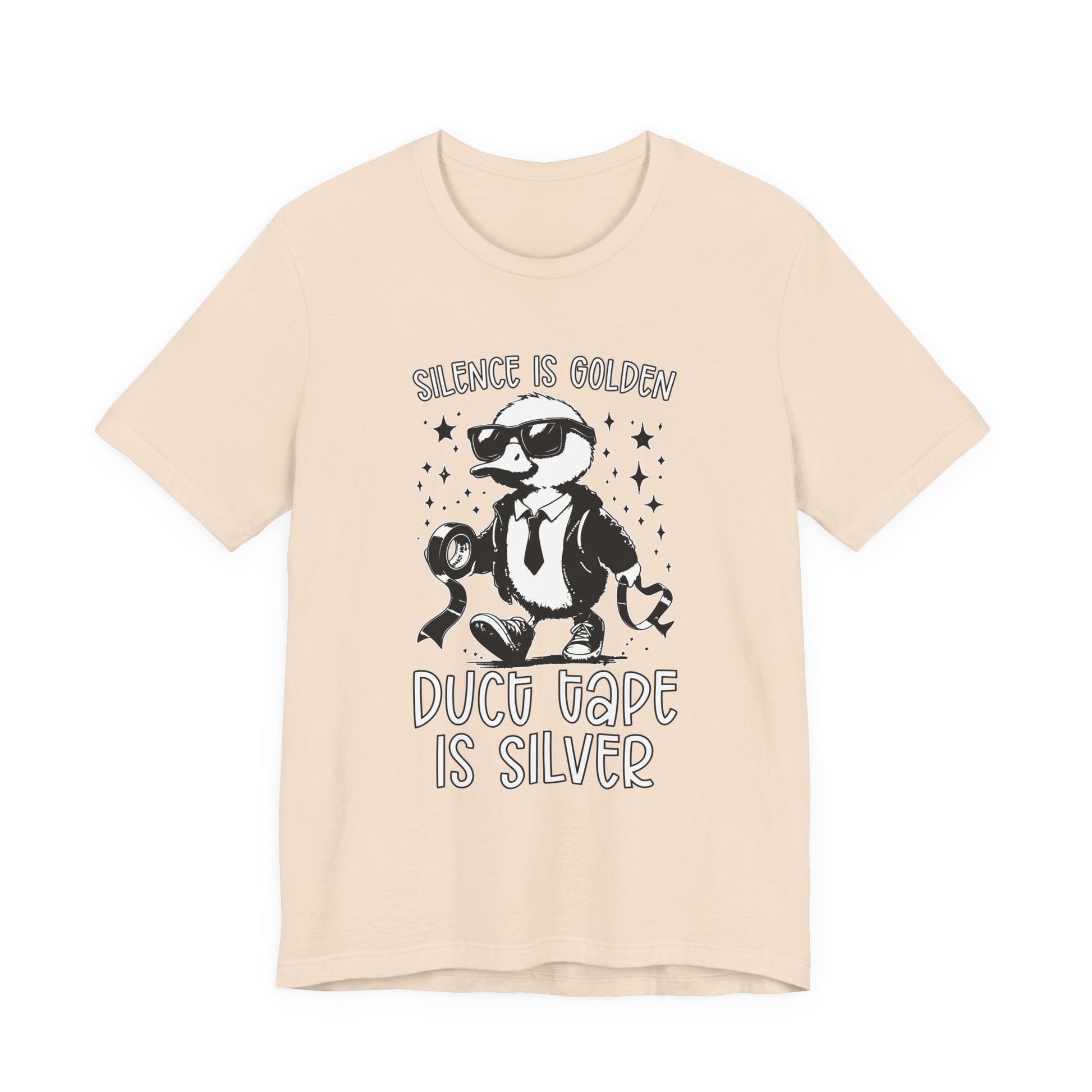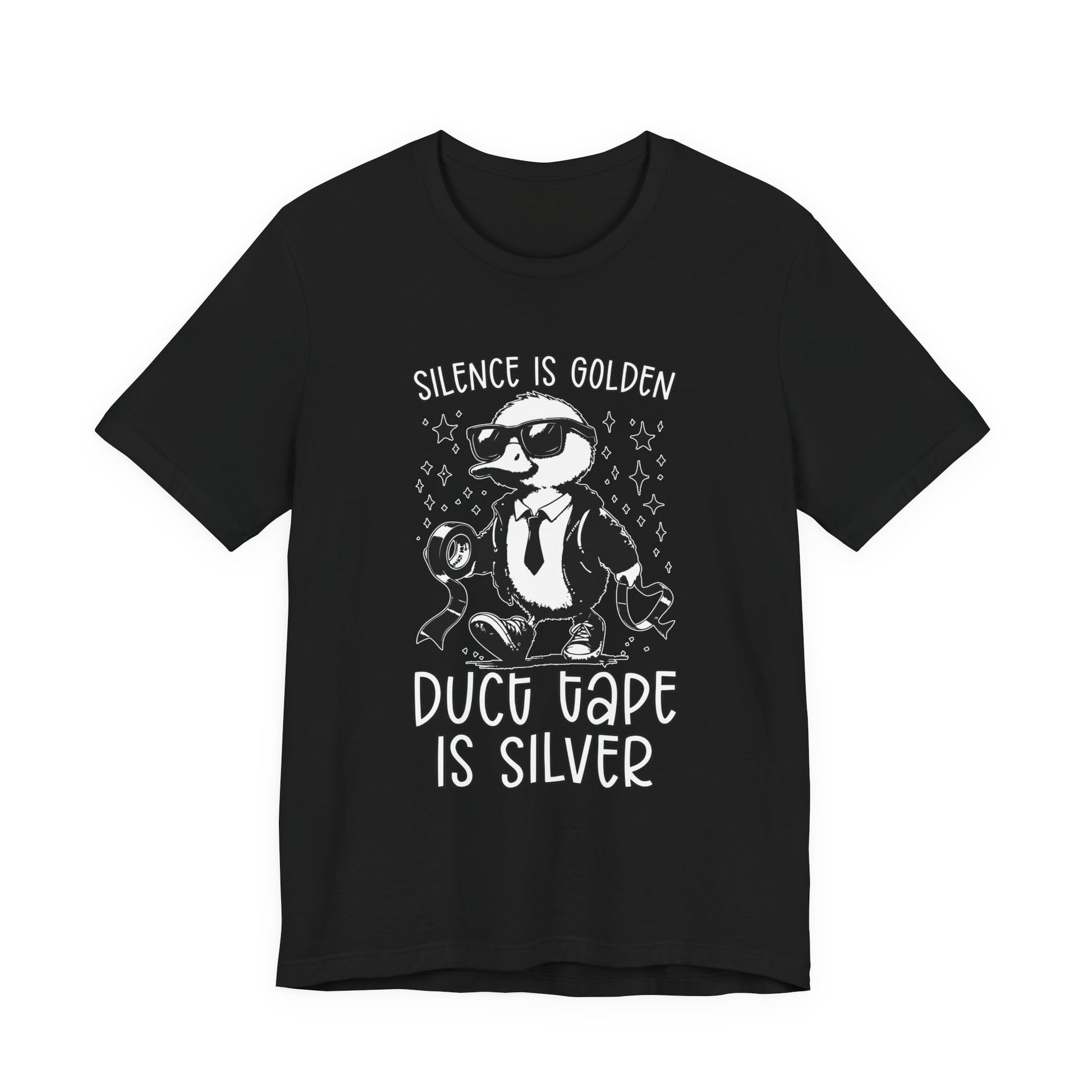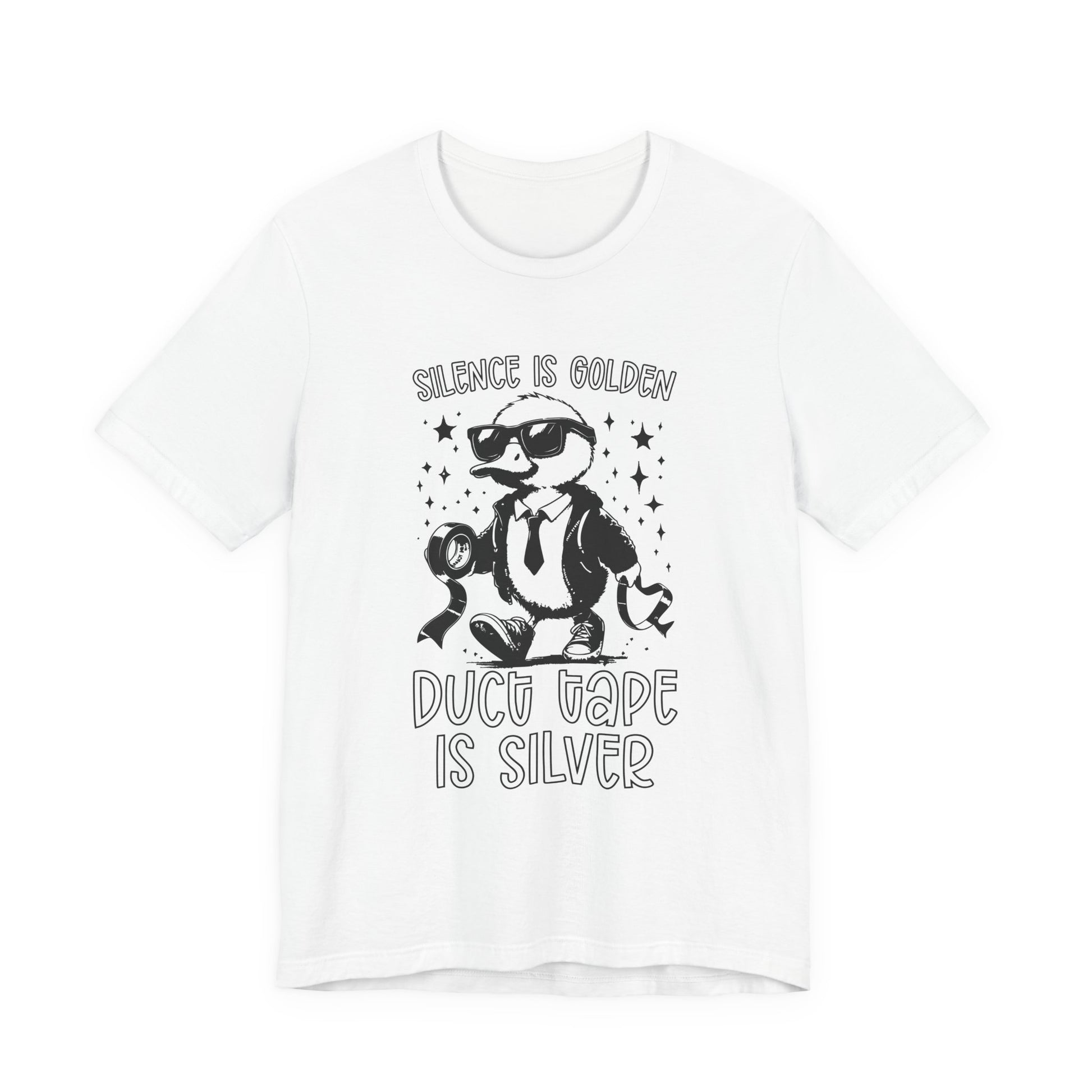 Keep things quiet and under control with this playful T-shirt featuring a duck dressed in a suit and boots, holding duct tape, alongside the witty phrase “Silence is Golden, Duck Tape is Silver.” Perfect for those who appreciate lighthearted humor and clever wordplay. A great gift for anyone who knows the power of a little duck tape and a lot of silence!