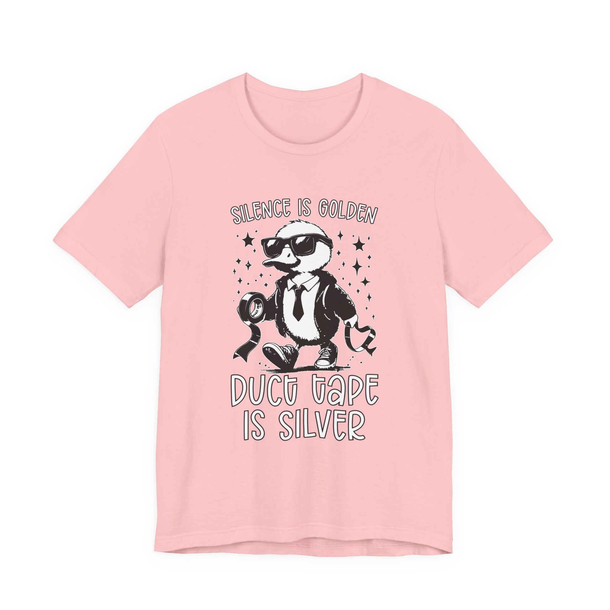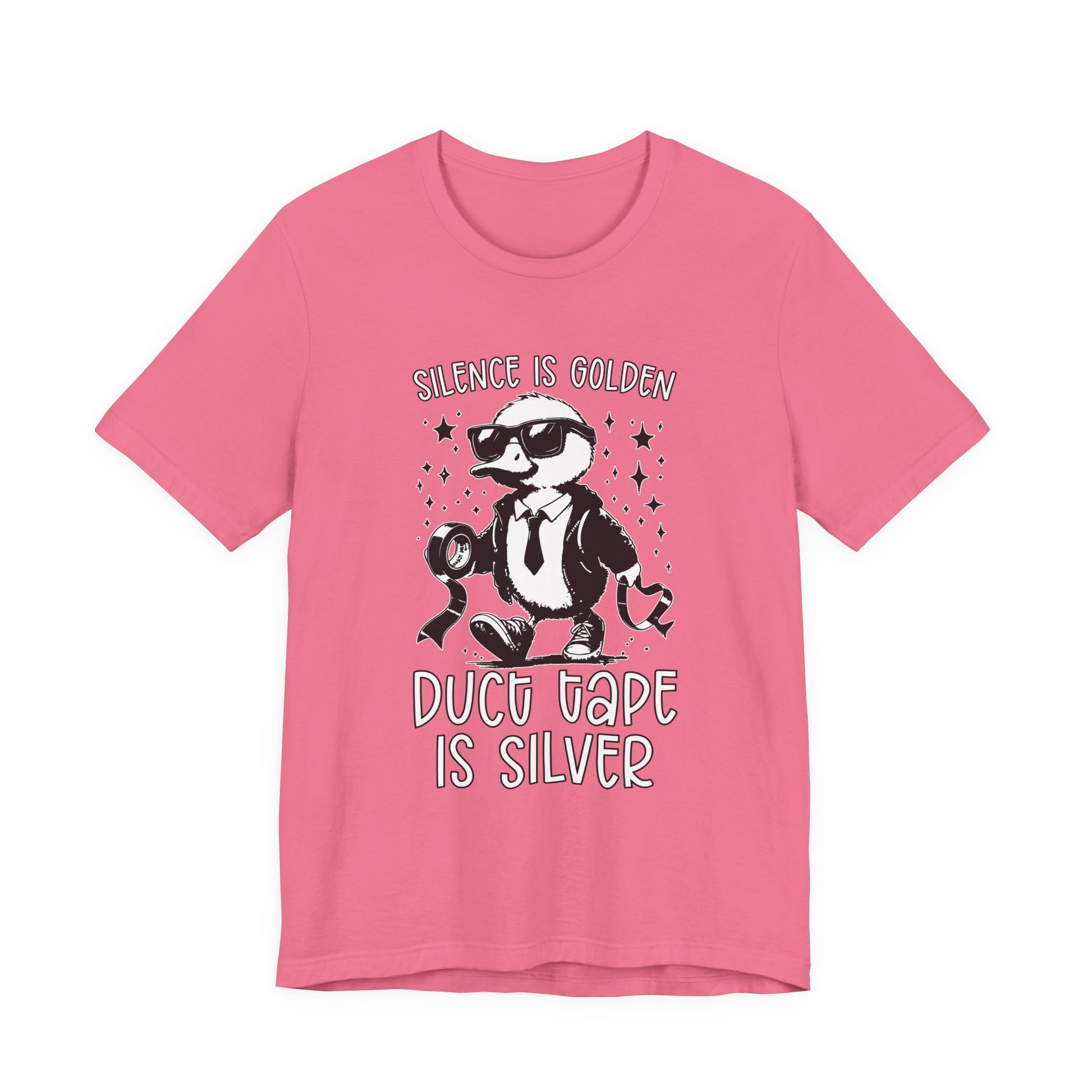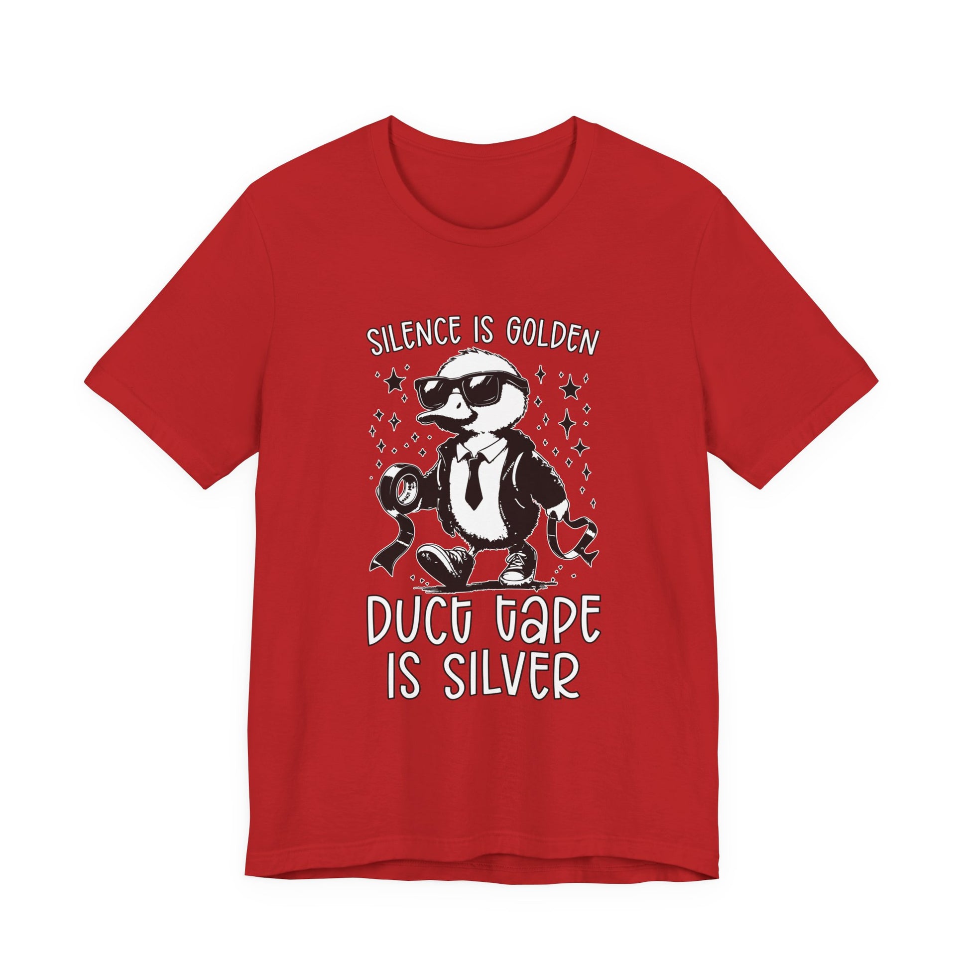 Keep things quiet and under control with this playful T-shirt featuring a duck dressed in a suit and boots, holding duct tape, alongside the witty phrase “Silence is Golden, Duck Tape is Silver.” Perfect for those who appreciate lighthearted humor and clever wordplay. A great gift for anyone who knows the power of a little duck tape and a lot of silence!