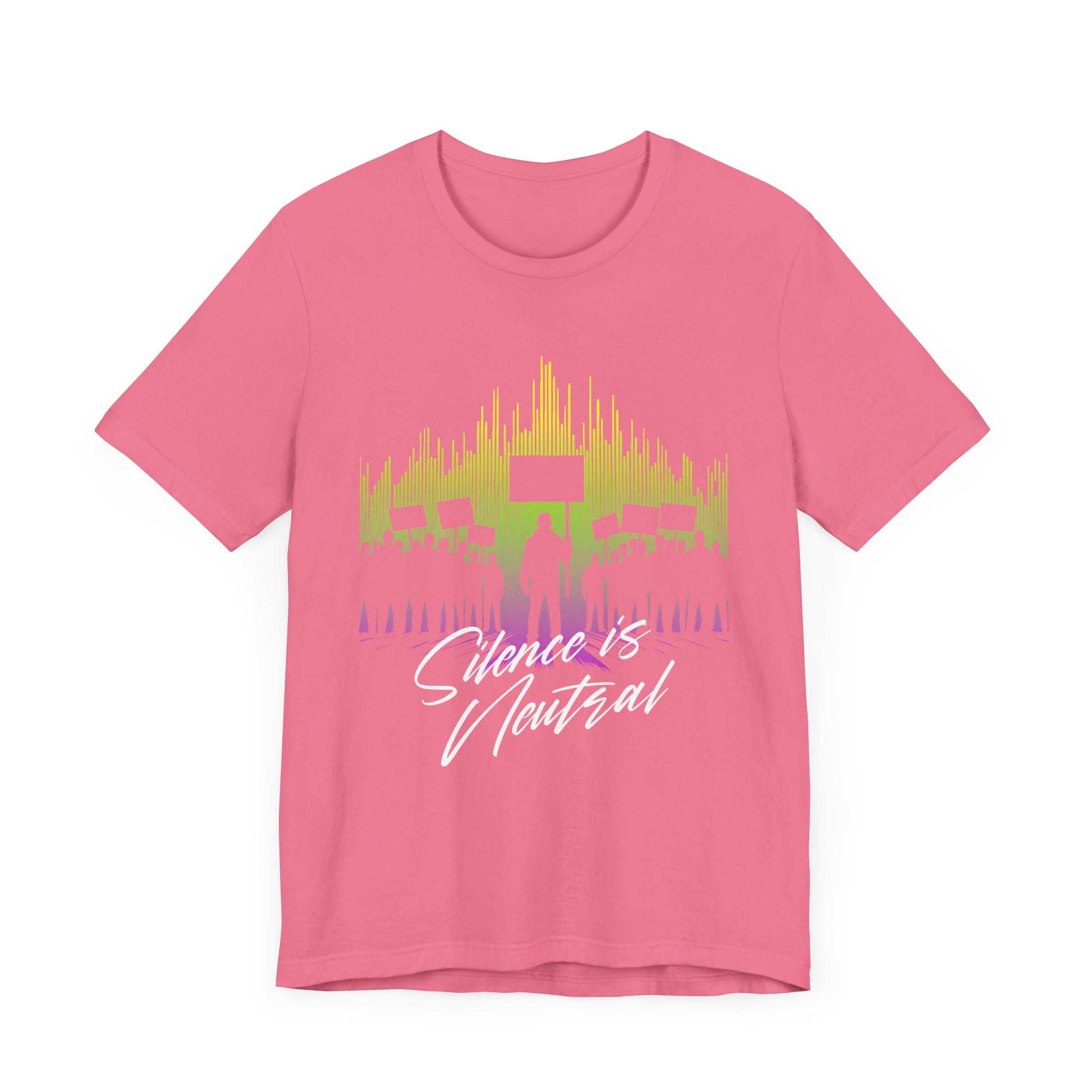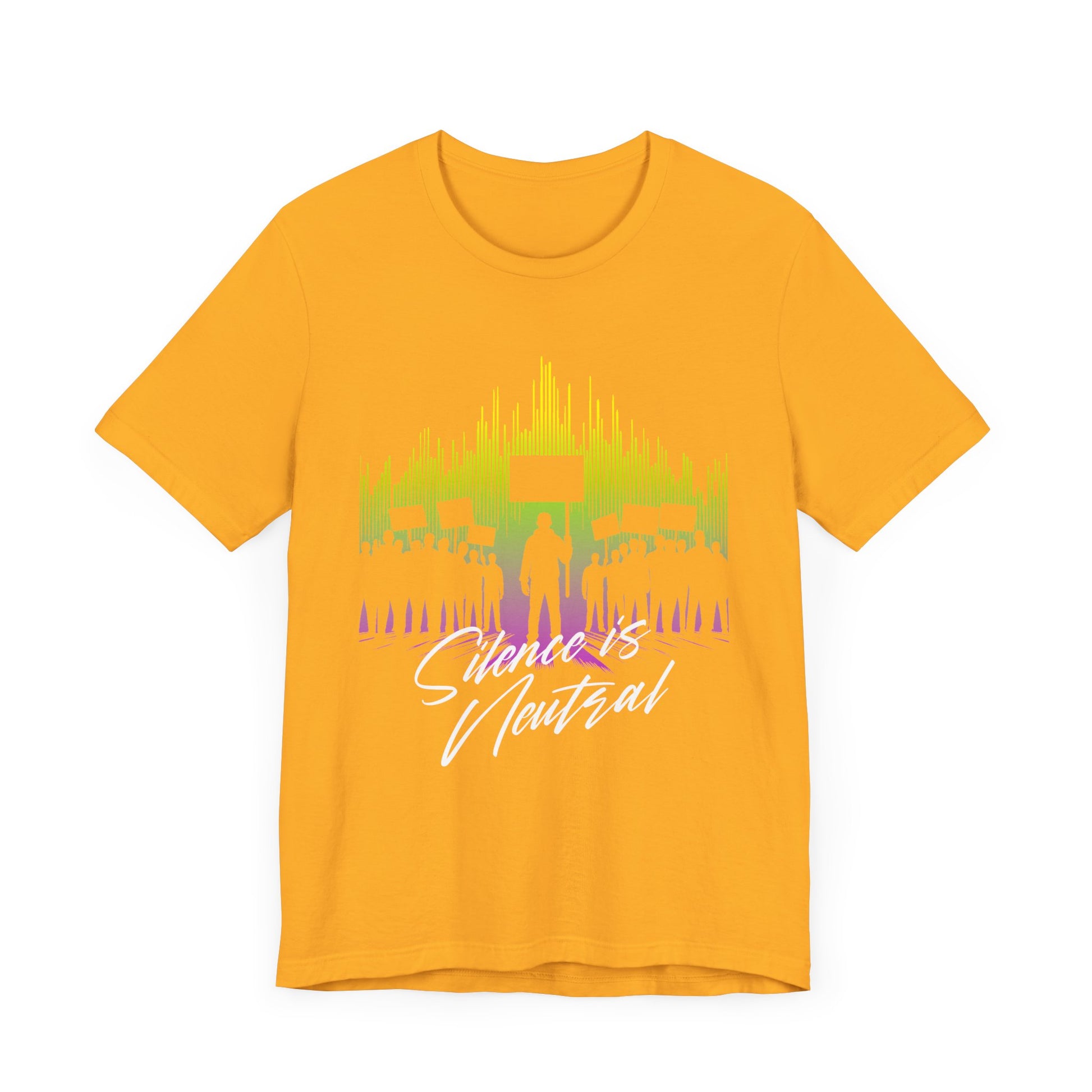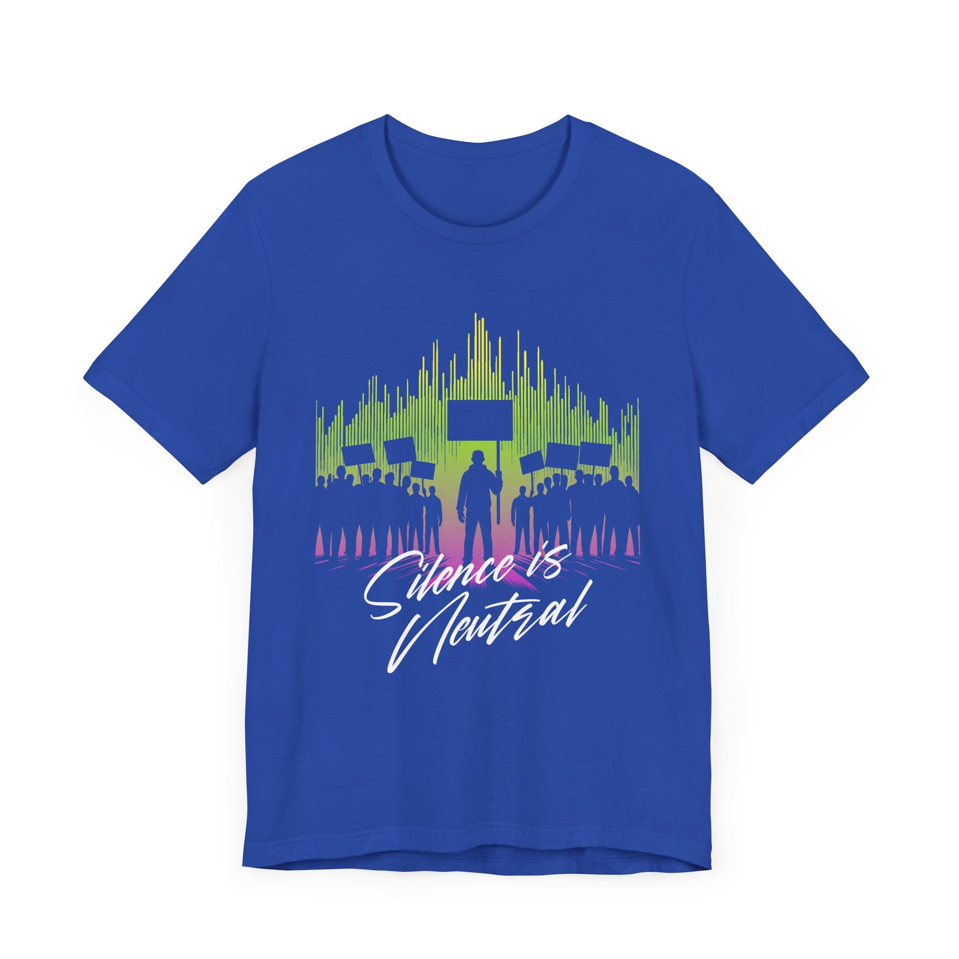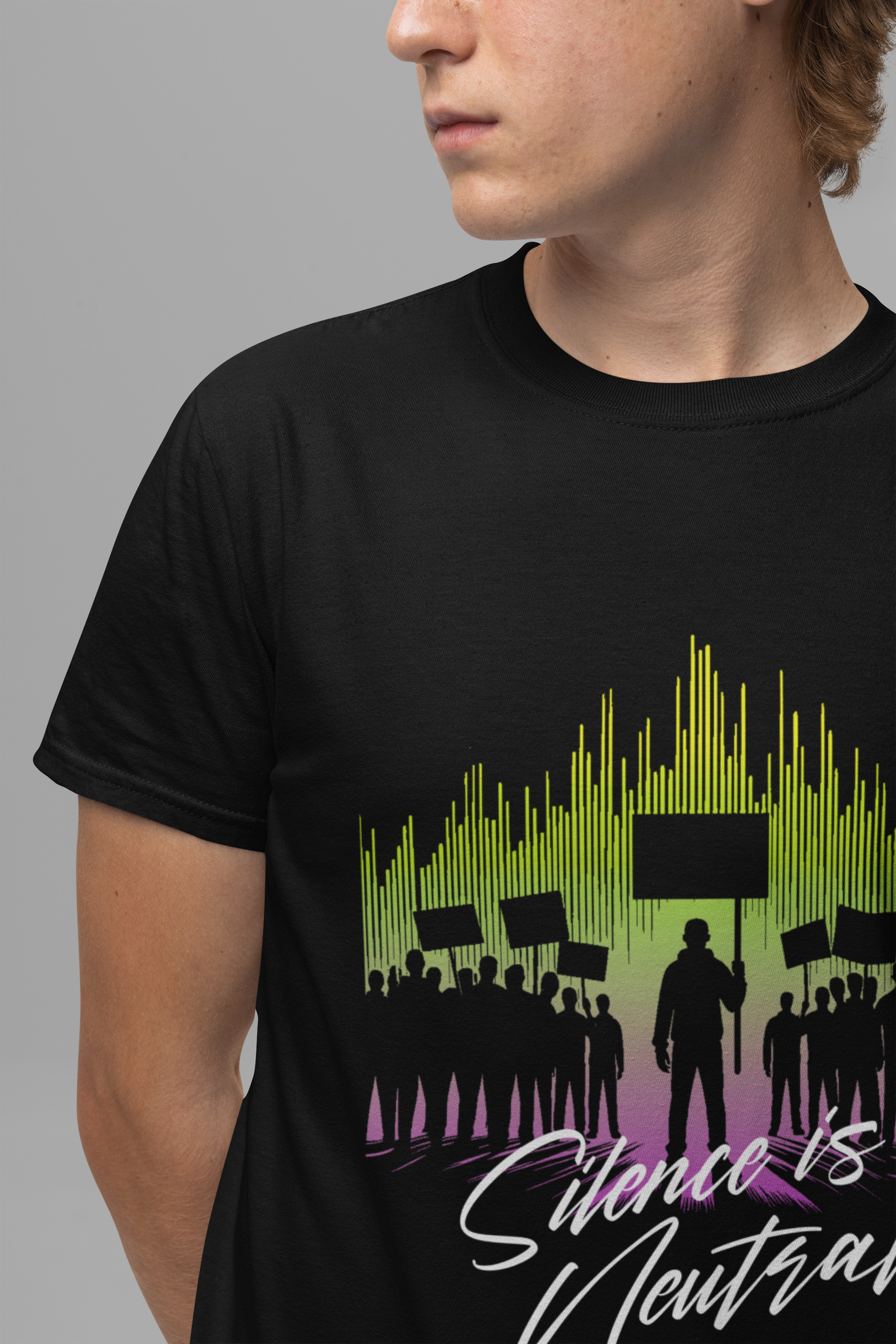 Make a statement with this "Silence is Neutral" t-shirt, featuring silhouettes of protesters holding boards in the background. This design highlights the message that choosing silence is a stance in itself, especially during moments of social action and protest. Perfect for activists, allies, and anyone who believes in the power of collective voices, this tee is crafted from comfortable, high-quality fabric for everyday wear or rallies. Let your shirt spark conversation and inspire awareness wherever you go.