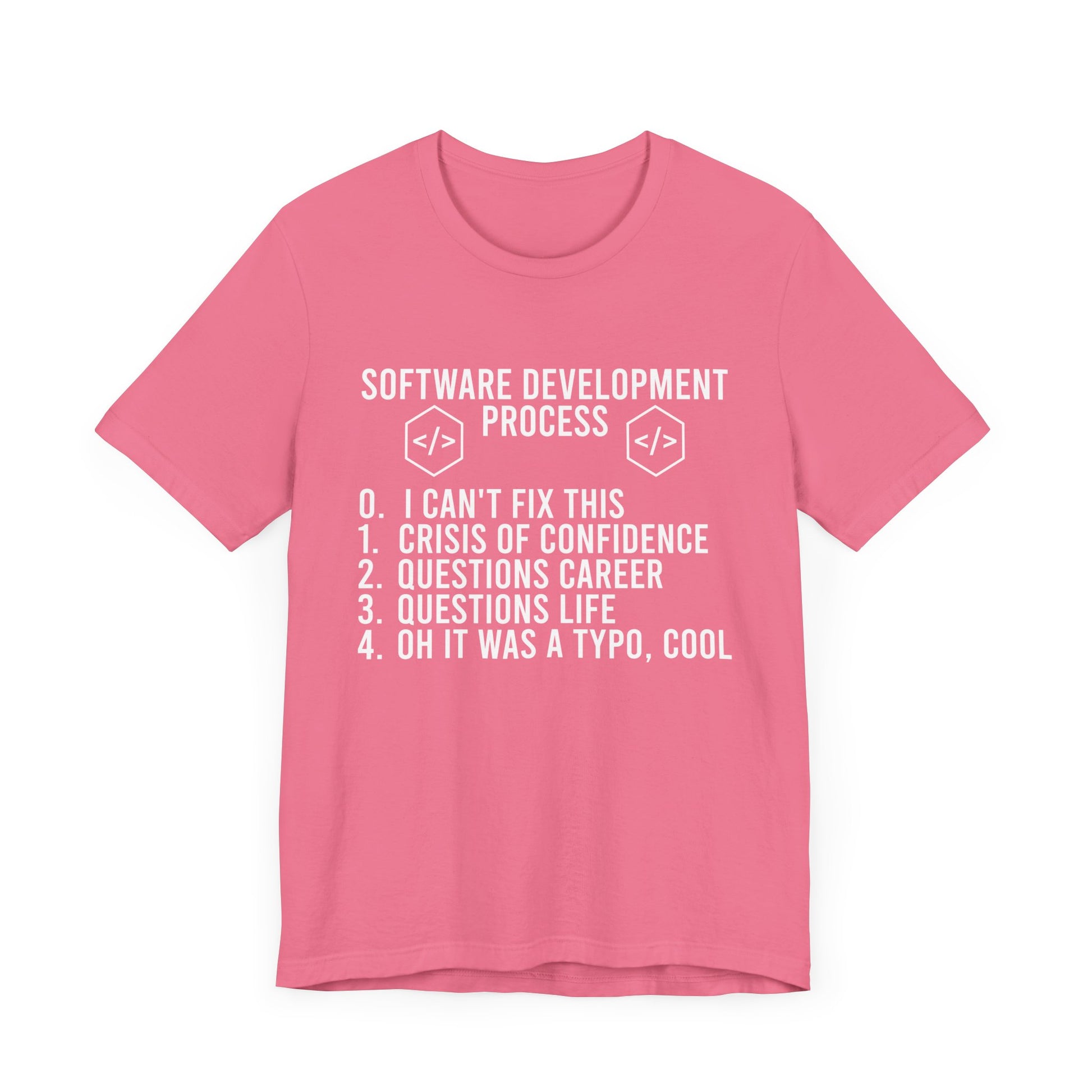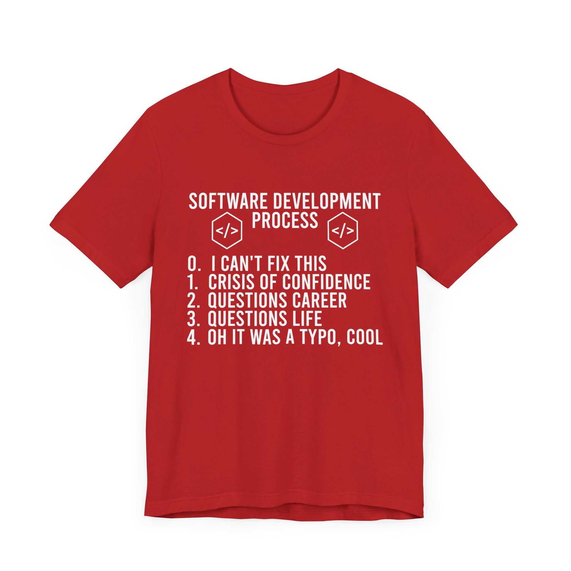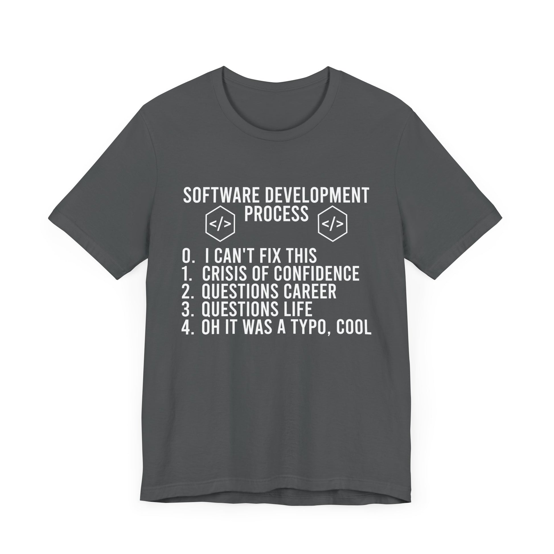 Celebrate the real journey of every coder with this hilarious “Software Development Process” t-shirt! Featuring the all-too-relatable stages: