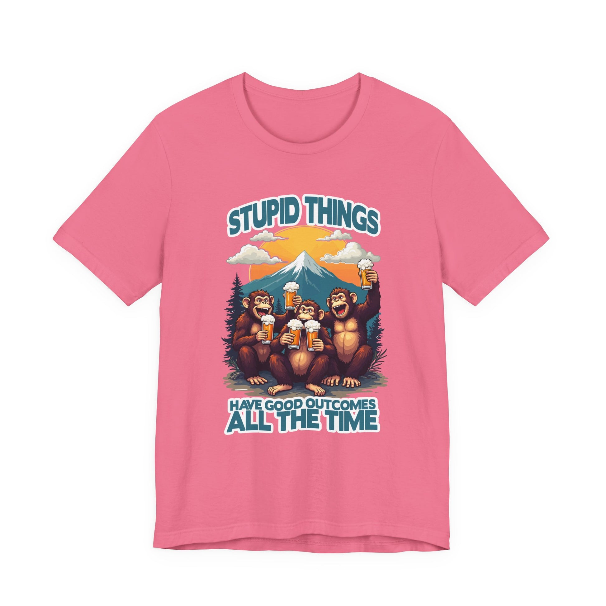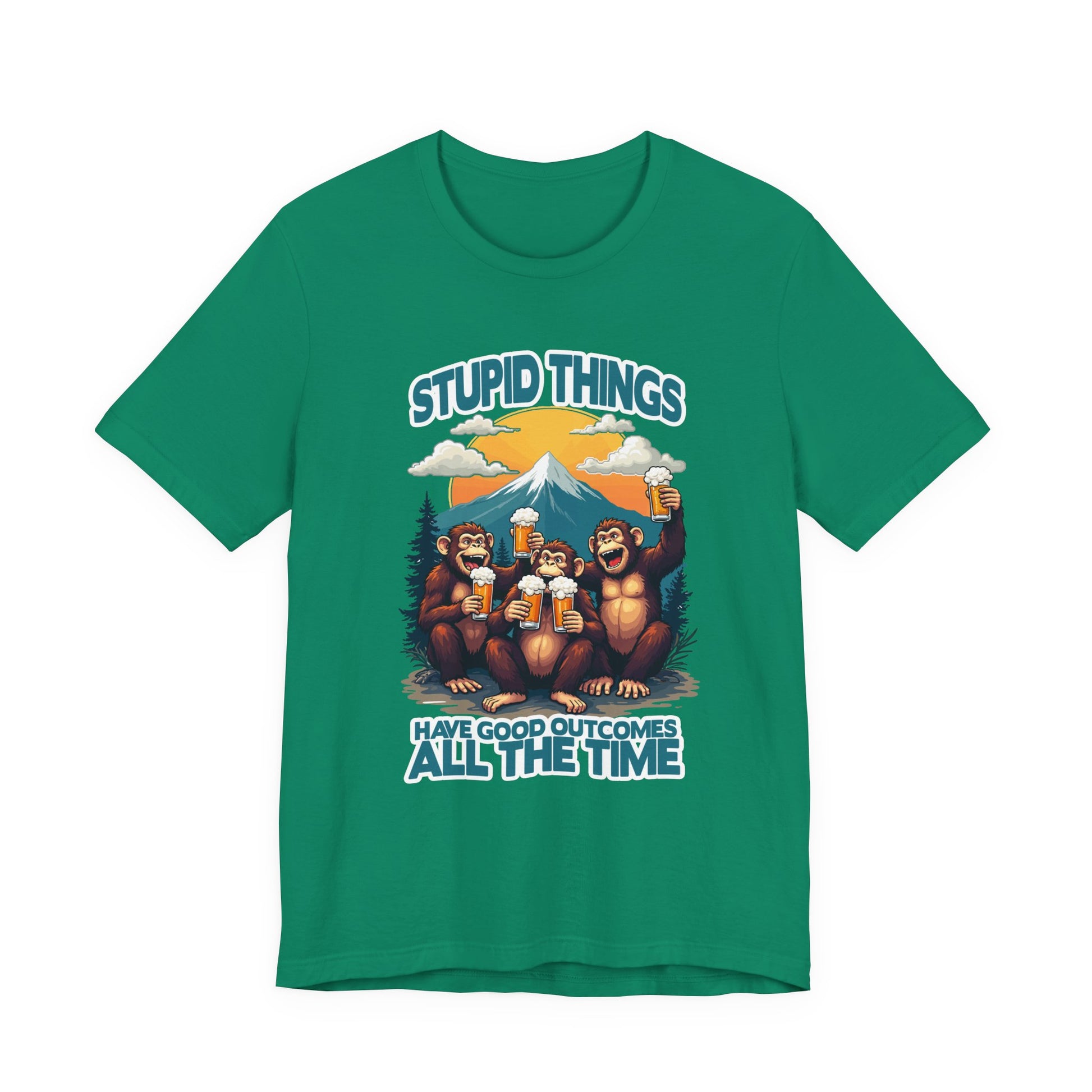 Raise a toast to good times and unexpected wins with this fun and vibrant tshirt featuring three jovial monkeys holding large beer mugs in both hands. Set against a scenic backdrop of a majestic mountain, fluffy clouds, and lush trees, the design perfectly captures the spirit of carefree adventures and friendship. Paired with the witty text "Stupid things have good outcomes all the time," this tshirt is ideal for party lovers, nature enthusiasts, and anyone who enjoys humor with a scenic twist. Perfect for casual outings, outdoor gatherings, or as a gift for friends who appreciate fun and positivity.