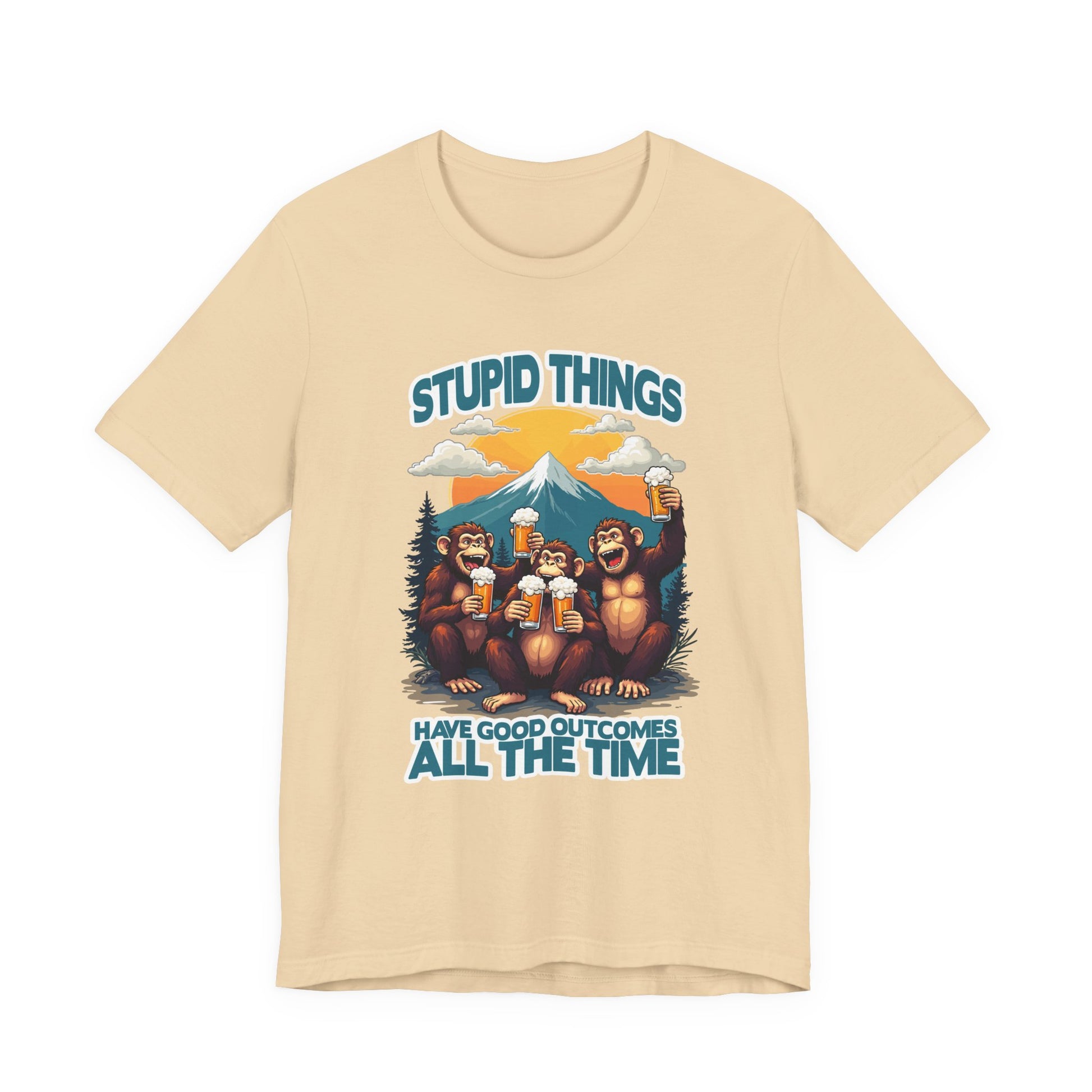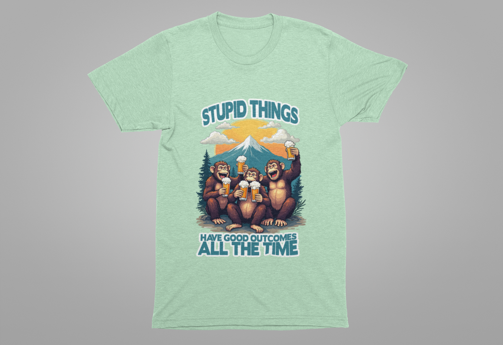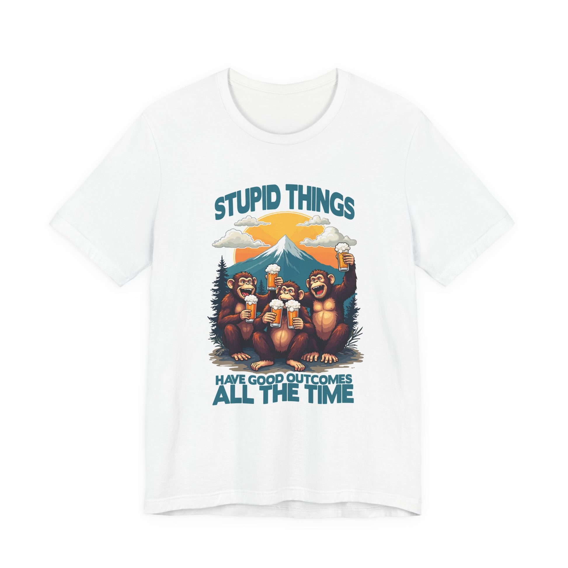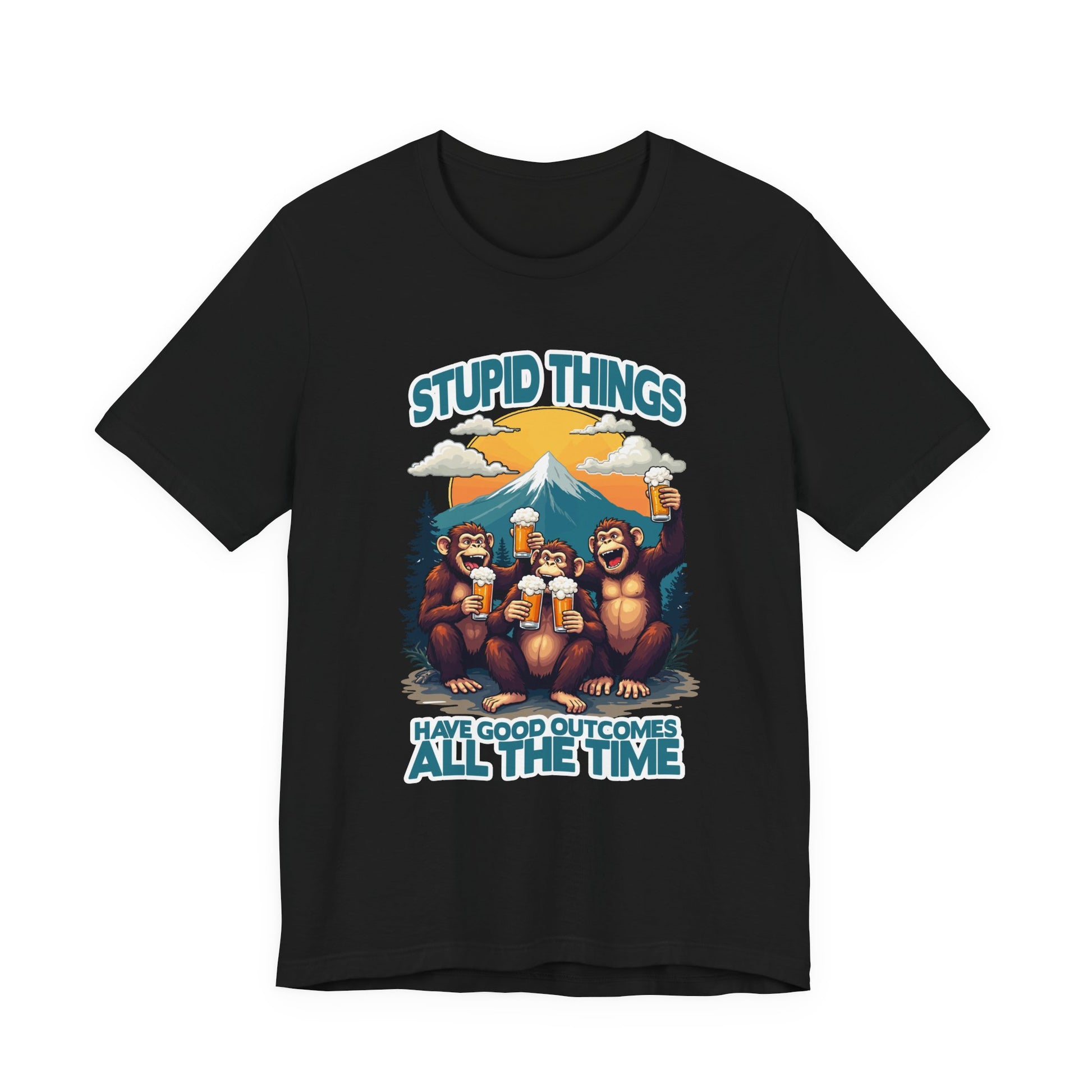 Stupid Things Have Good Outcomes Tshirt – Three Monkeys Cheers with Beer Mugs & Mountain Scene