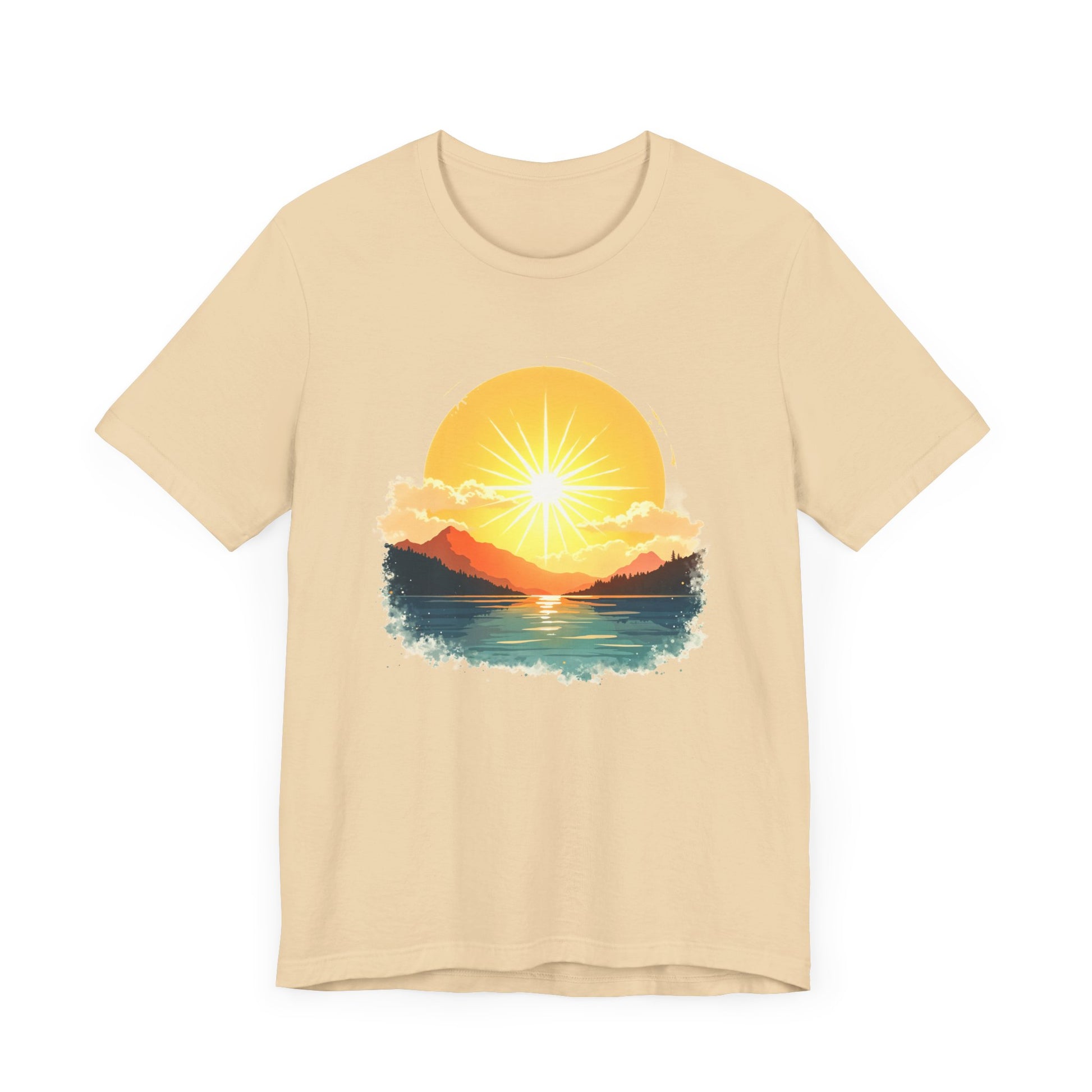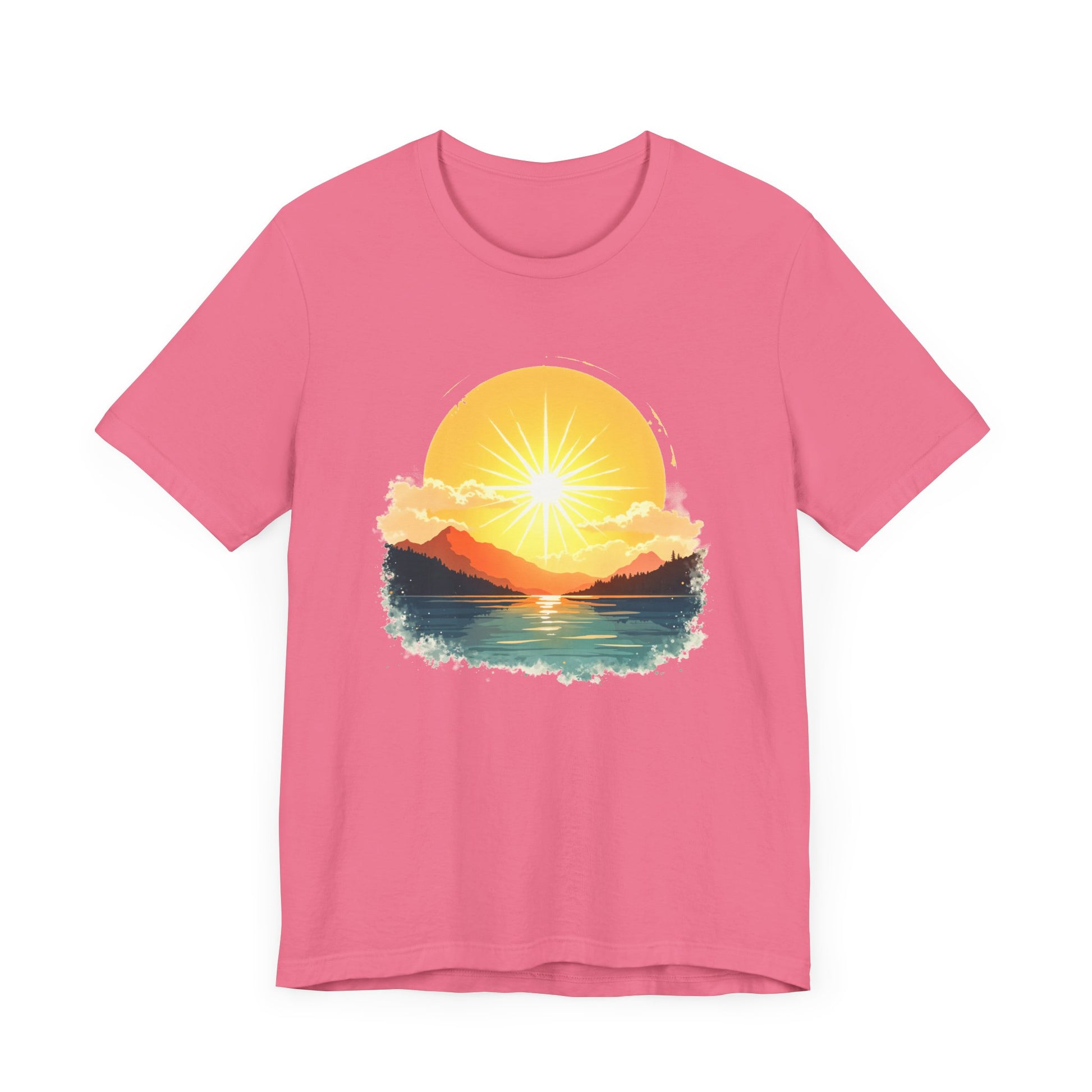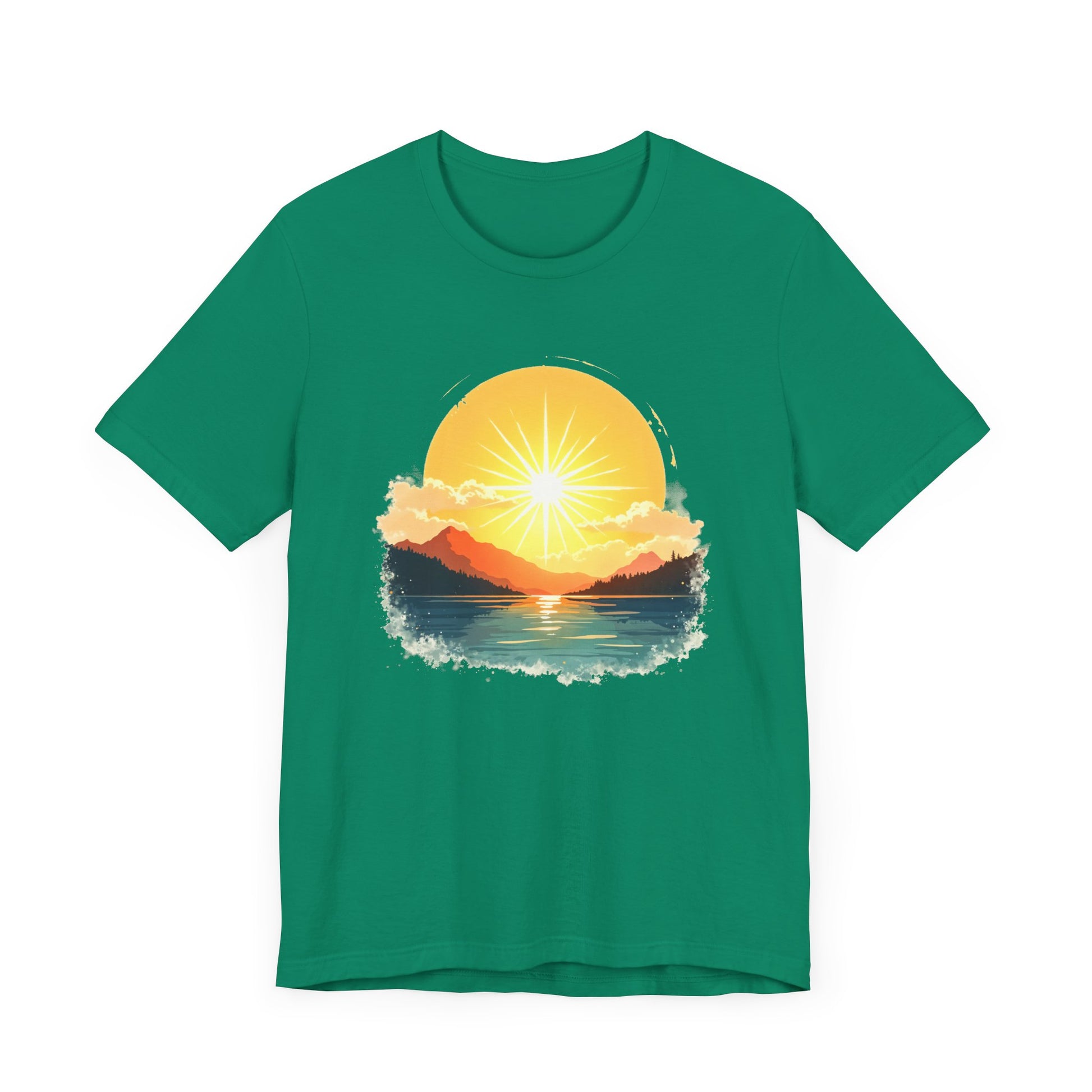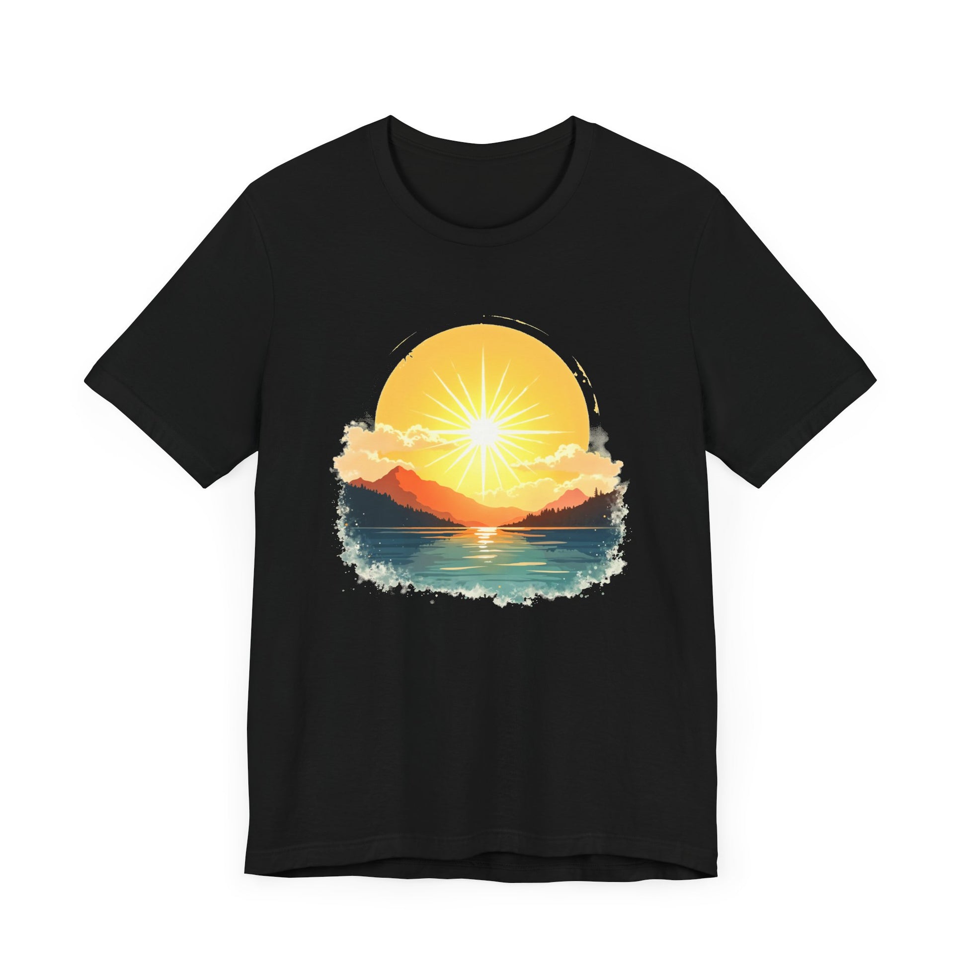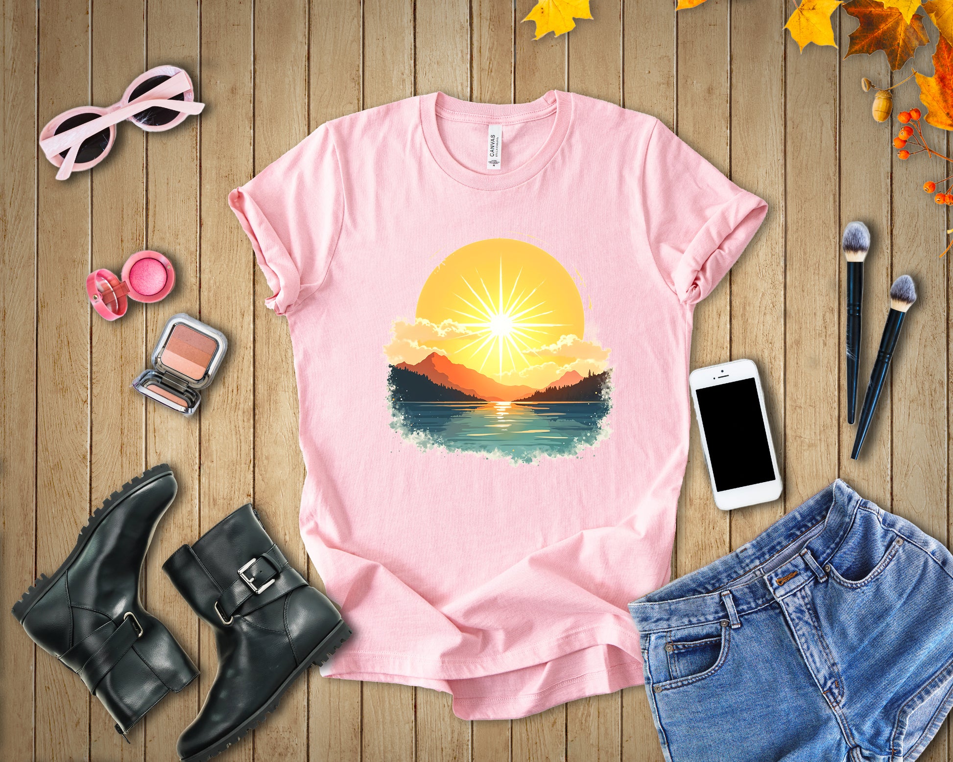 Experience the tranquil beauty of nature with this stunning t-shirt featuring a vibrant graphic of a sunset casting warm hues over majestic mountains and a serene fresh water body. The peaceful scene captures the perfect harmony between sky, mountain, and water, evoking a sense of calm and adventure. Ideal for outdoor lovers, hikers, and anyone who appreciates breathtaking landscapes, this shirt is made from soft, breathable fabric for all-day comfort and style.
