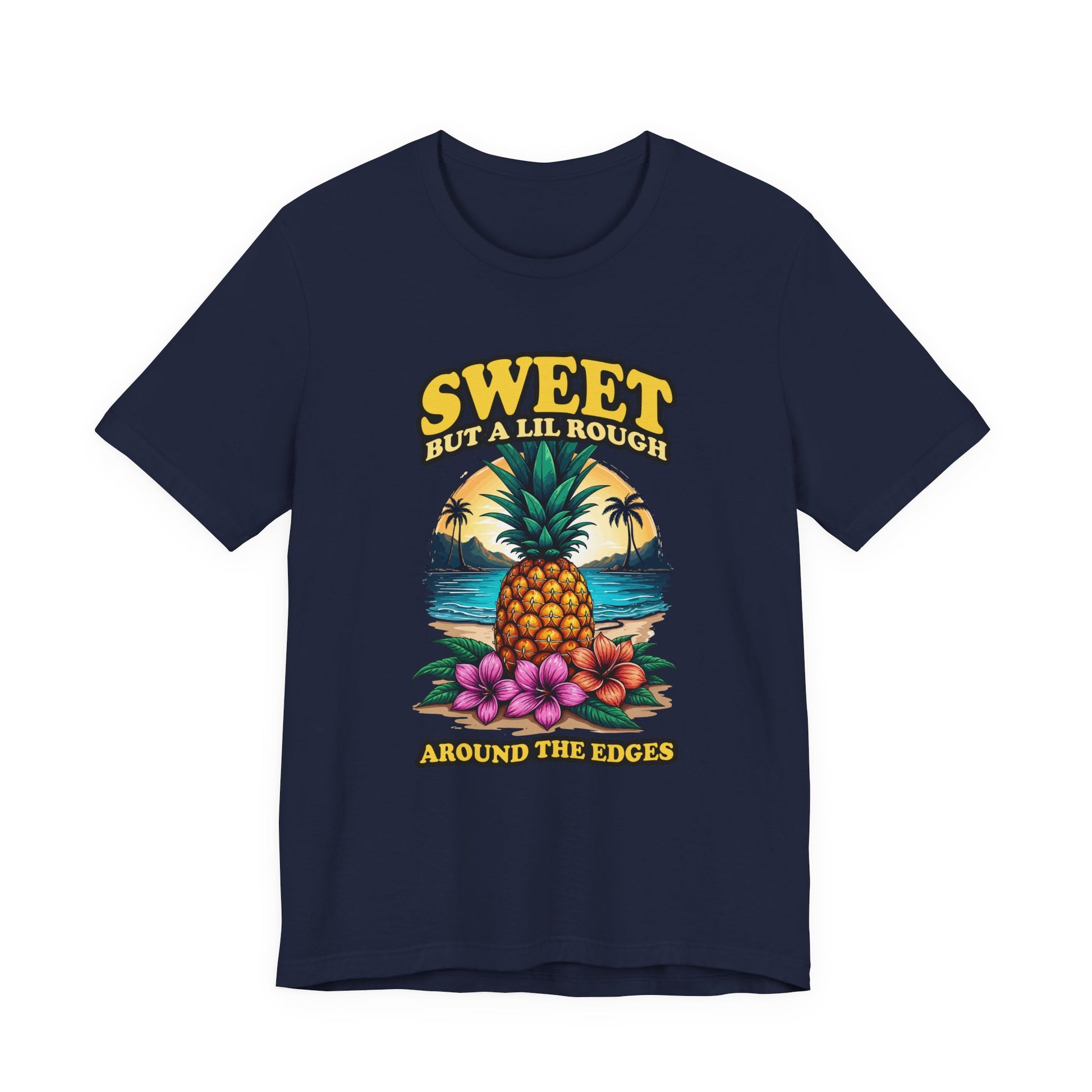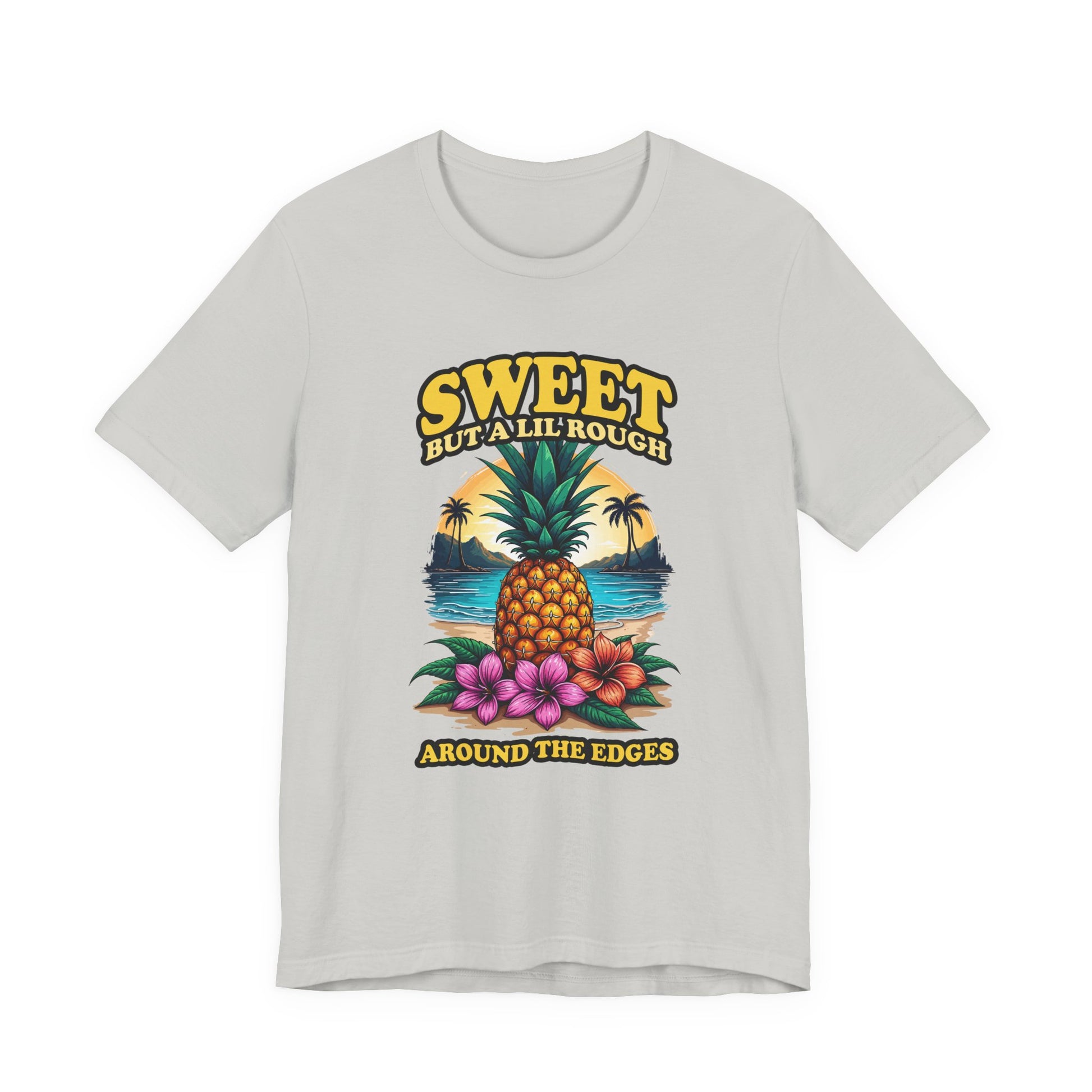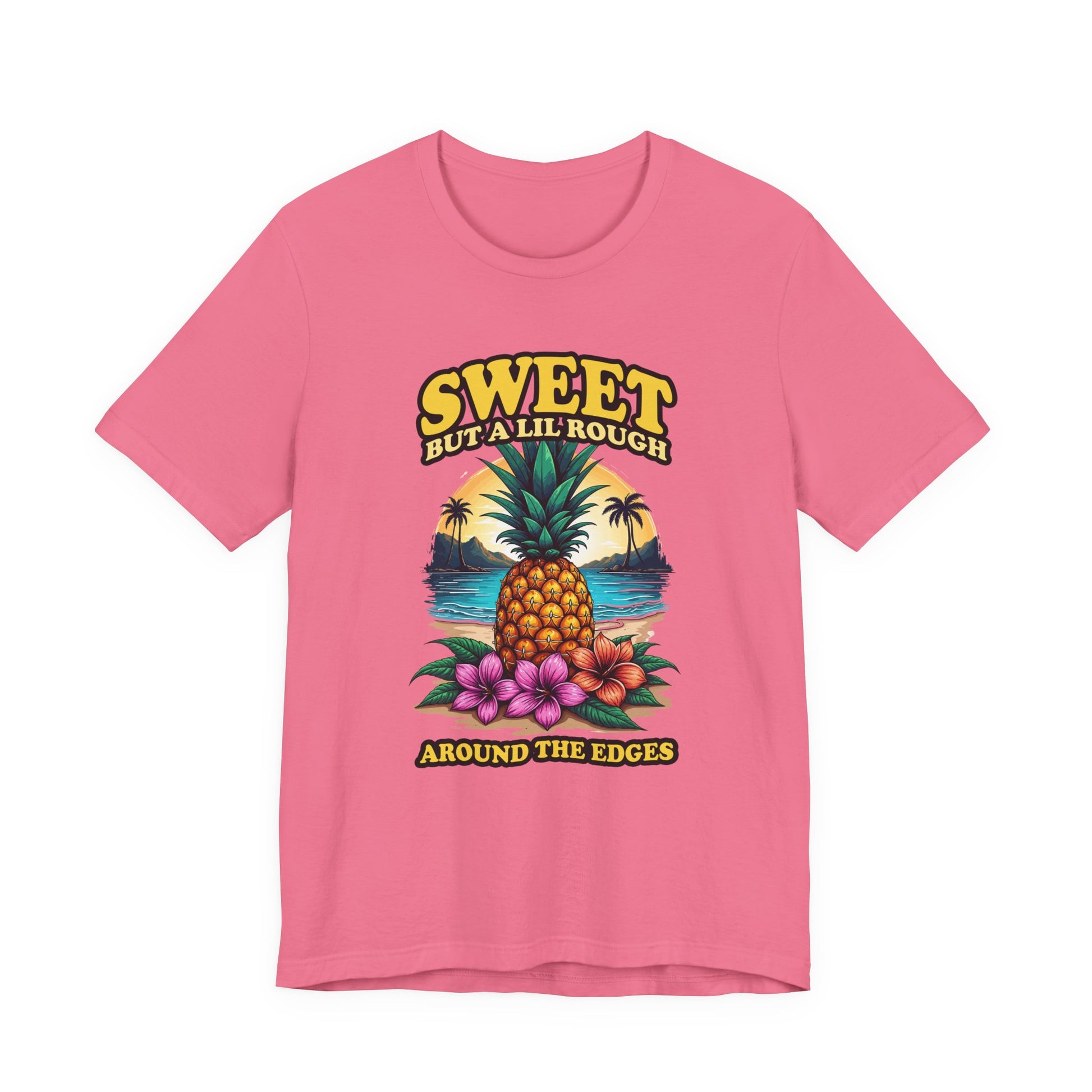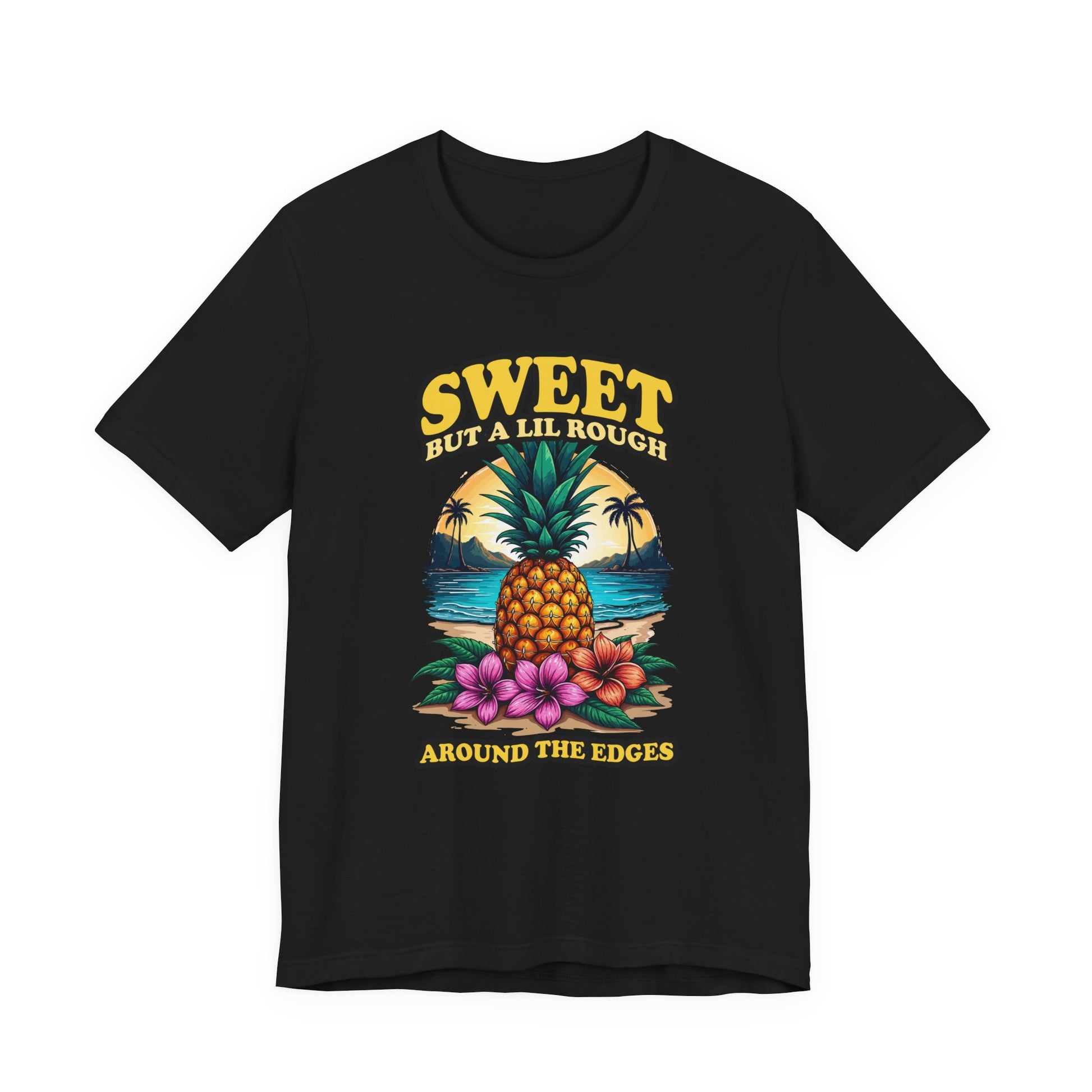 Celebrate the tropical vibes with this vibrant t shirt featuring a very large pineapple set in a lush beach environment. Surrounded by sand, clear water, mountains, palm trees, and colorful flowers, this lively design perfectly captures the beauty and spirit of island life. The playful text "SWEET but a lil rough around the edges" adds a charming personality, making it ideal for those who love tropical themes and bold self-expression. Comfortable and eye-catching, this tee is perfect for beach lovers, vacationers, or anyone who embraces a sweet yet edgy attitude.