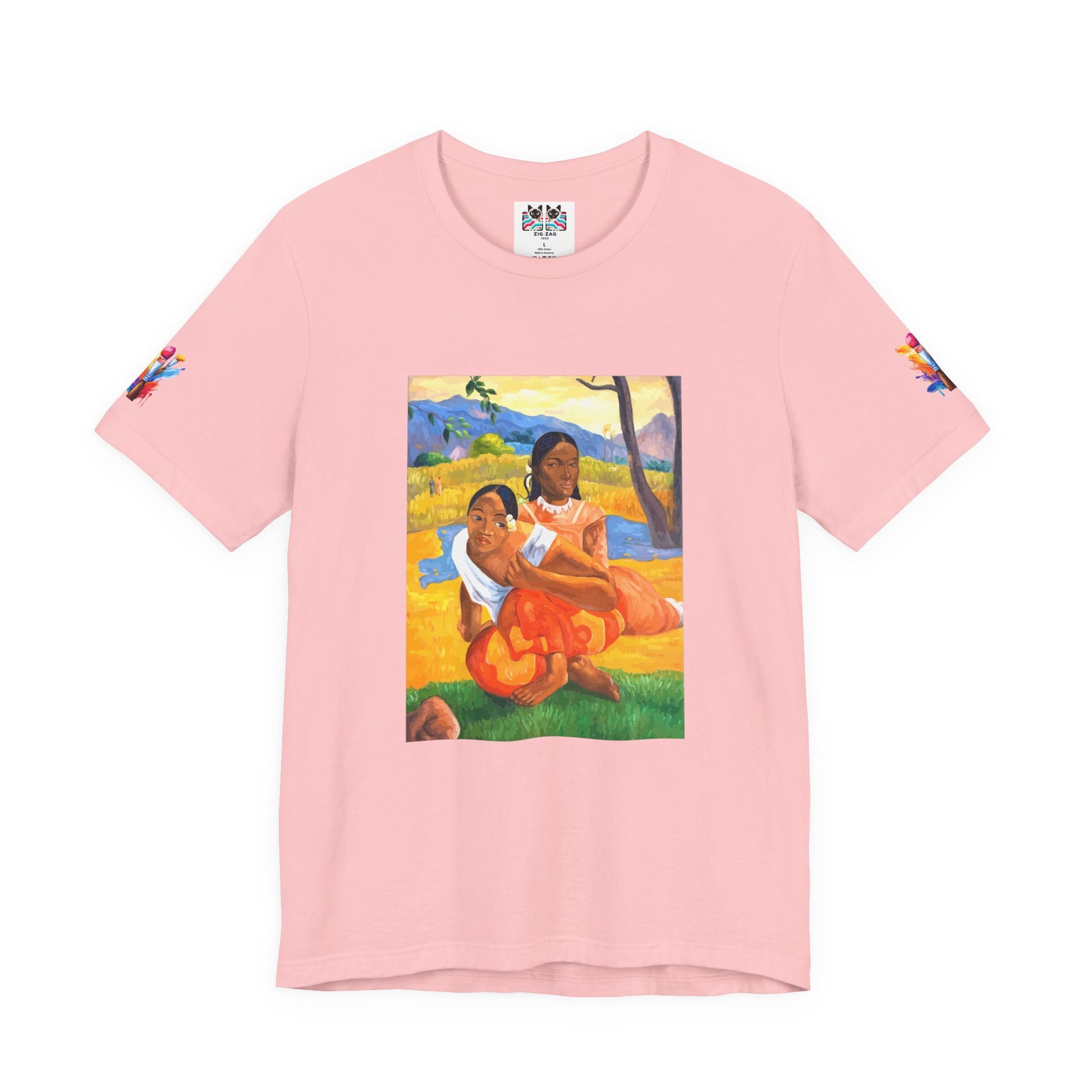Transport yourself to the vibrant beauty of French Polynesia with this stunning Post-Impressionist art t-shirt. This design features a celebrated painting depicting two Tahitian women in a tropical landscape, rendered in bold colors of yellow, orange, blue, and green. The composition showcases the artist's fascination with exotic cultures and his revolutionary use of flat planes of color and simplified forms that helped pave the way for modern art.