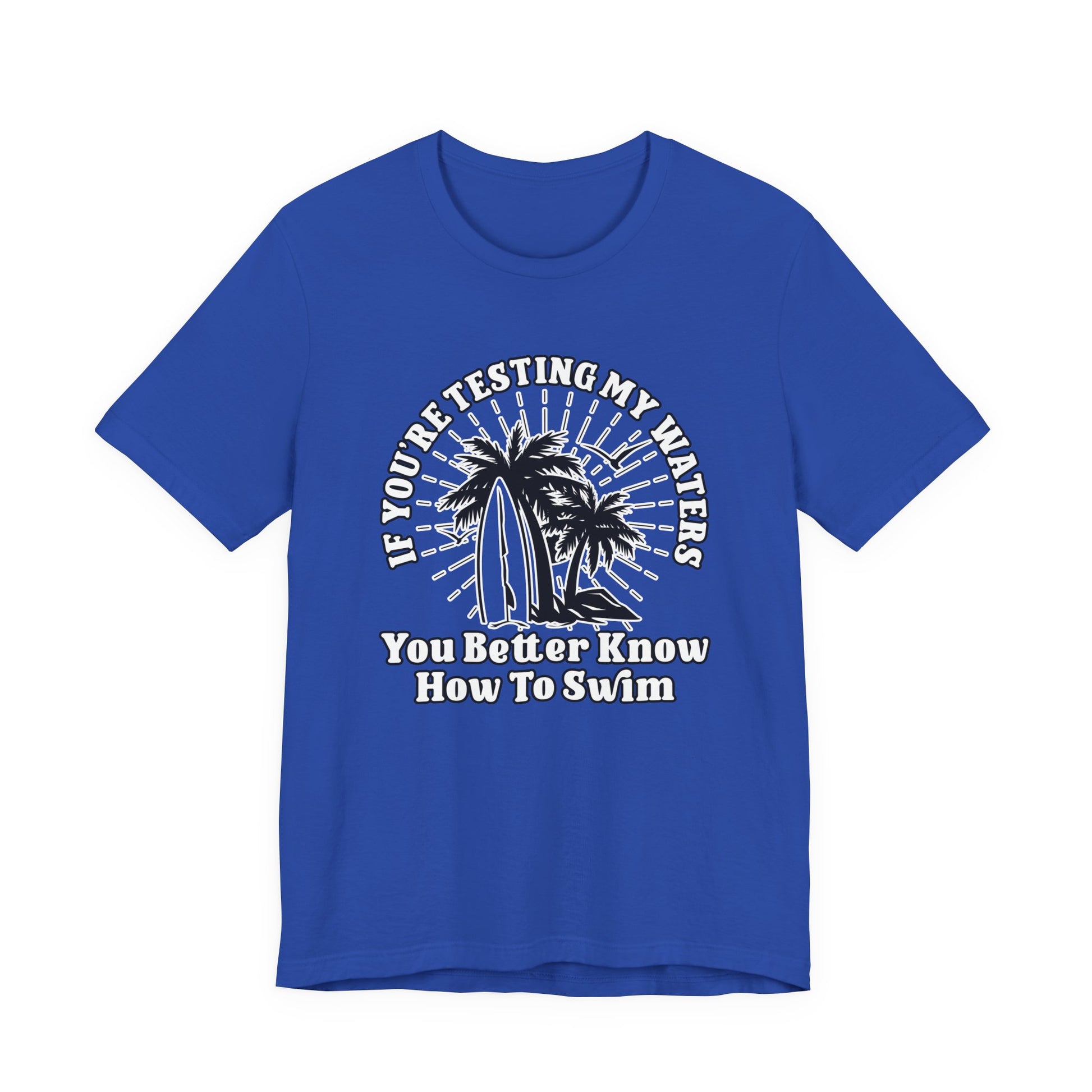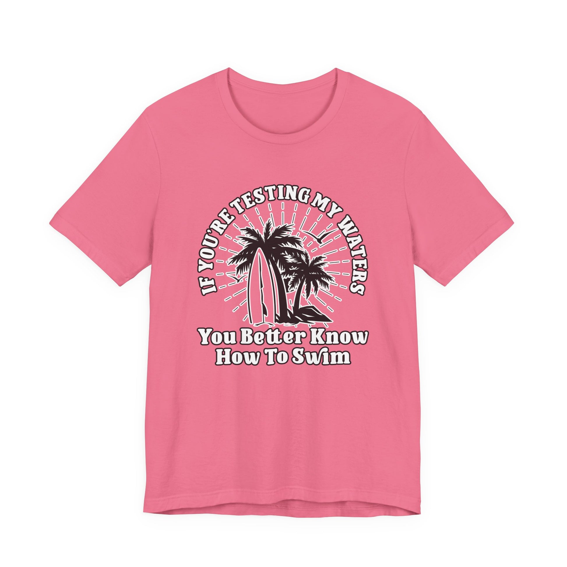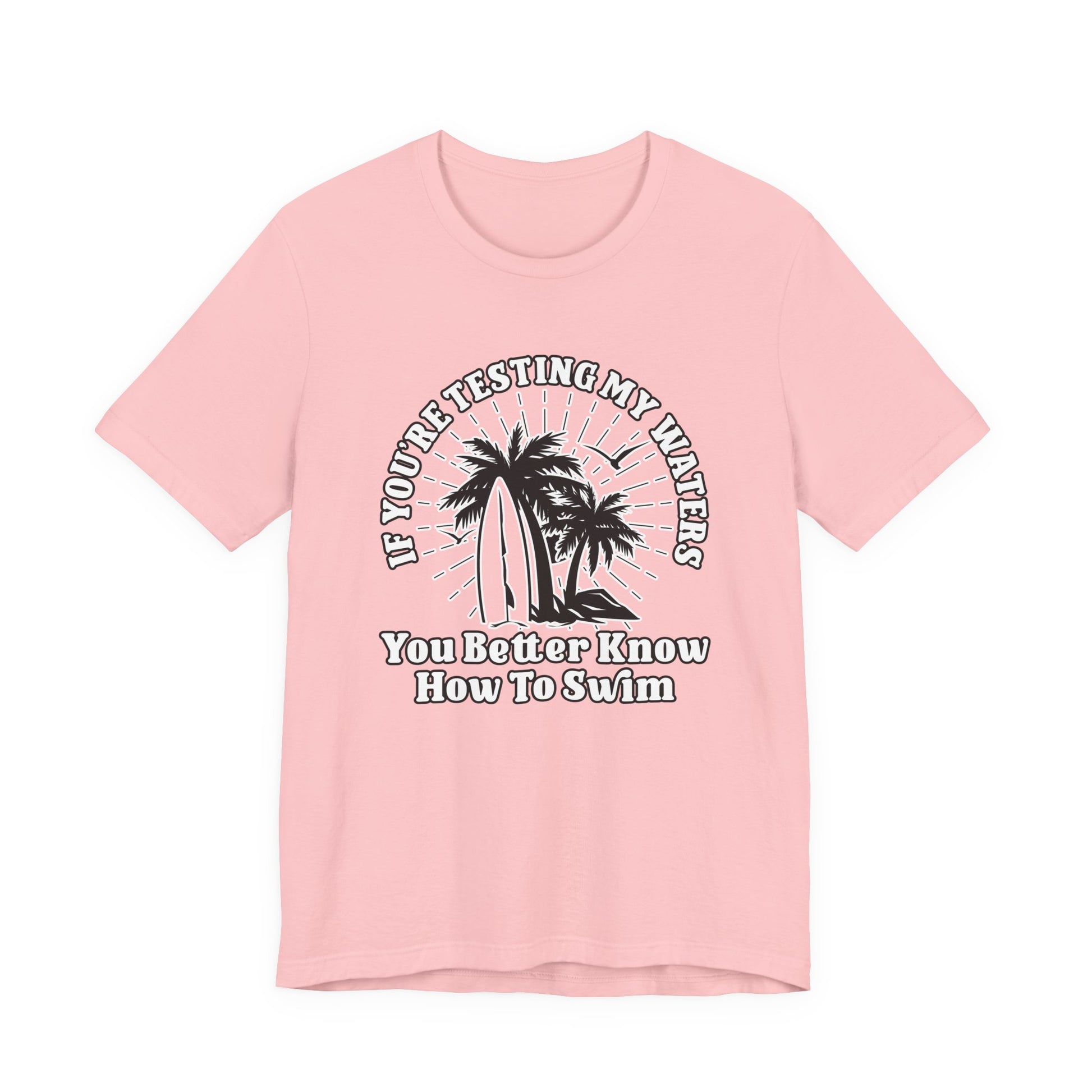 Make a splash with this standout “If you are testing my waters, you better know how to swim” T-shirt featuring a vibrant surfboard beach scene with palm trees and rocks. Perfect for anyone with a wild side, love for the ocean, or a playful approach to life’s challenges. This tee brings vacation vibes and a fierce spirit—an awesome gift for surfers, swimmers, or those who aren’t afraid to dive in deep.