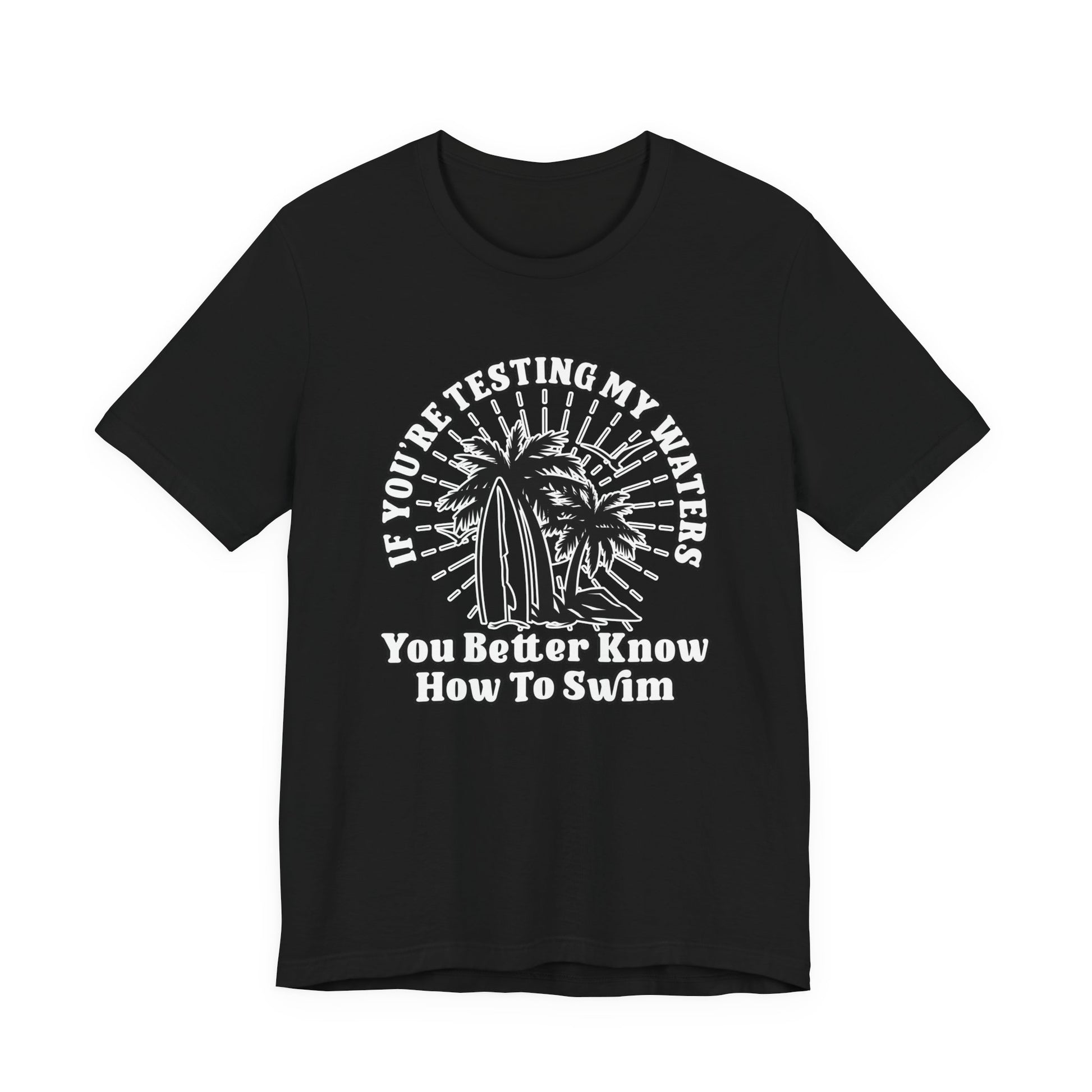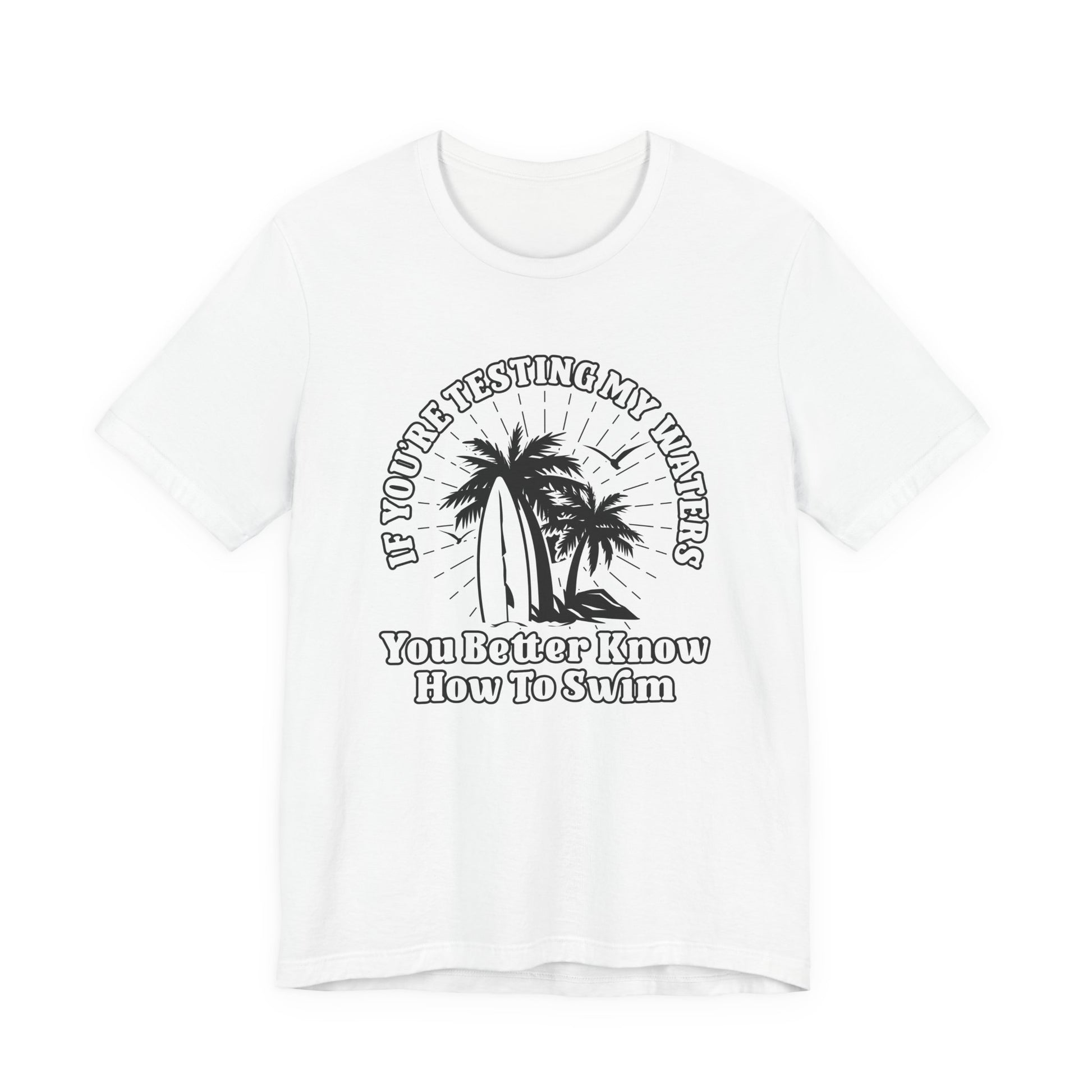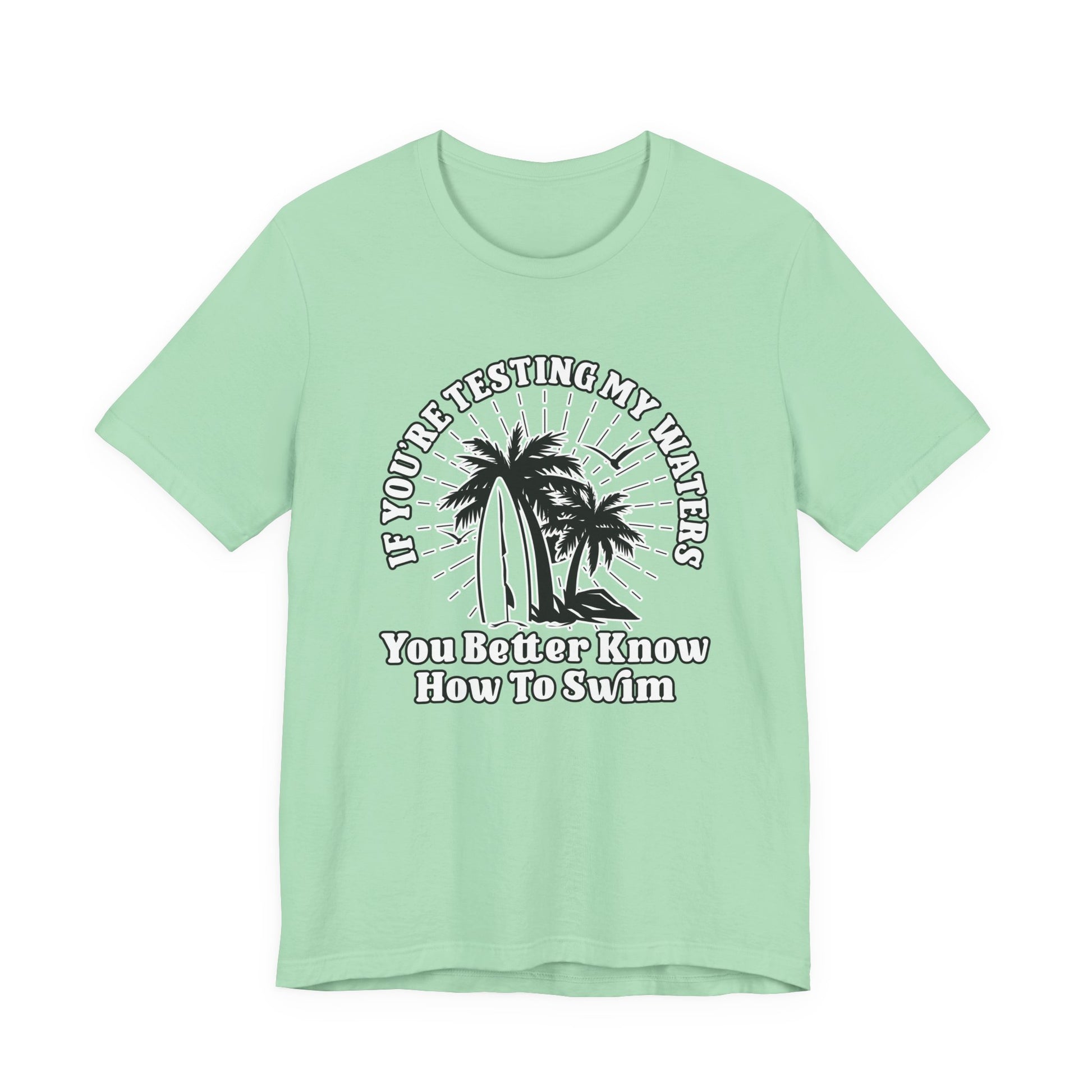Test My Waters Surf T-Shirt – Beach Palm Trees & Rocks Graphic with Bold Quote