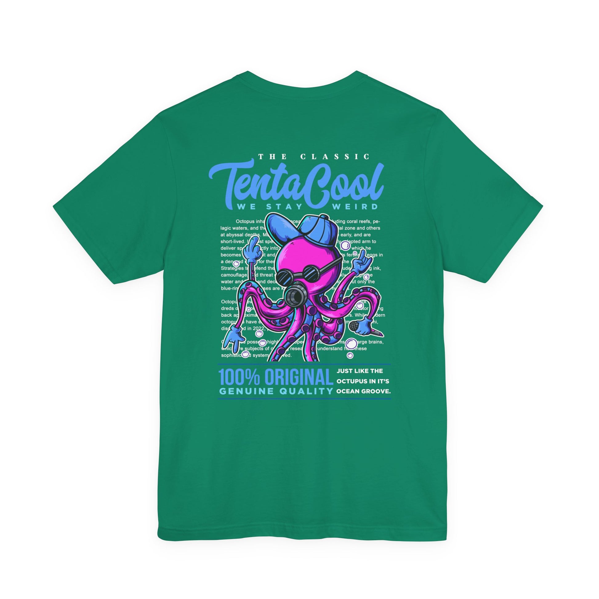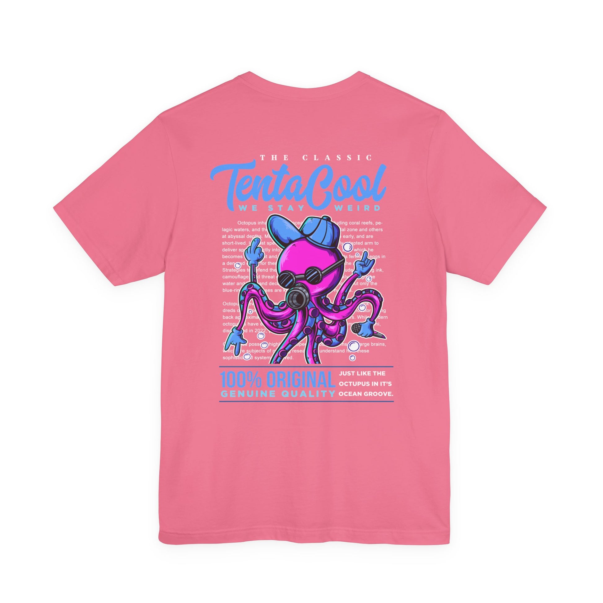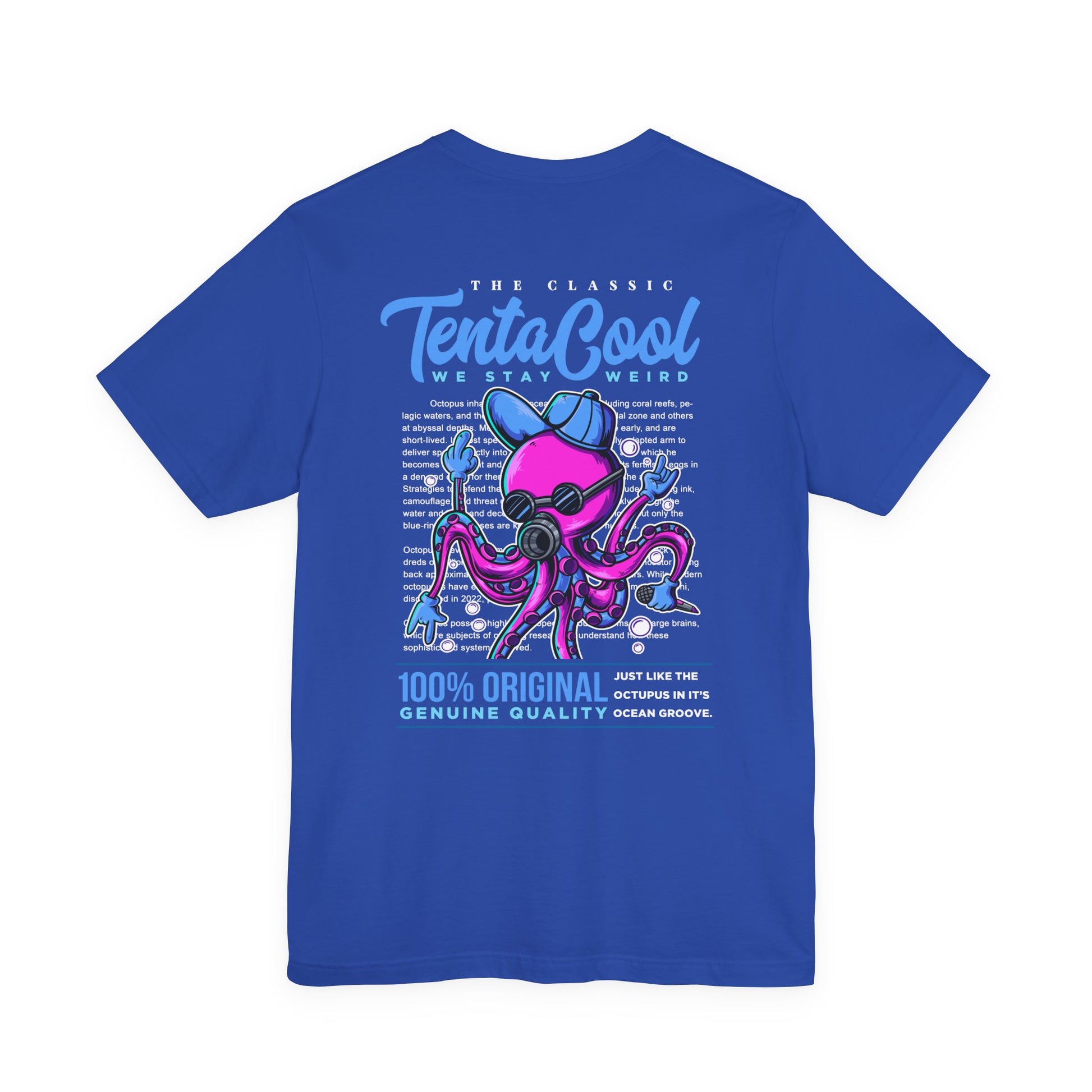 Stand out with this futuristic tshirt featuring a large purple robotic octopus wearing a cap and gloves, holding a microphone with its tentacles surrounded by playful bubbles. The bold text on top reads: “The Classic Tentacool we stay weird,” complemented by small background text sharing interesting facts about the octopus. Perfect for fans of quirky, tech-inspired art and those who embrace their unique style unapologetically.
