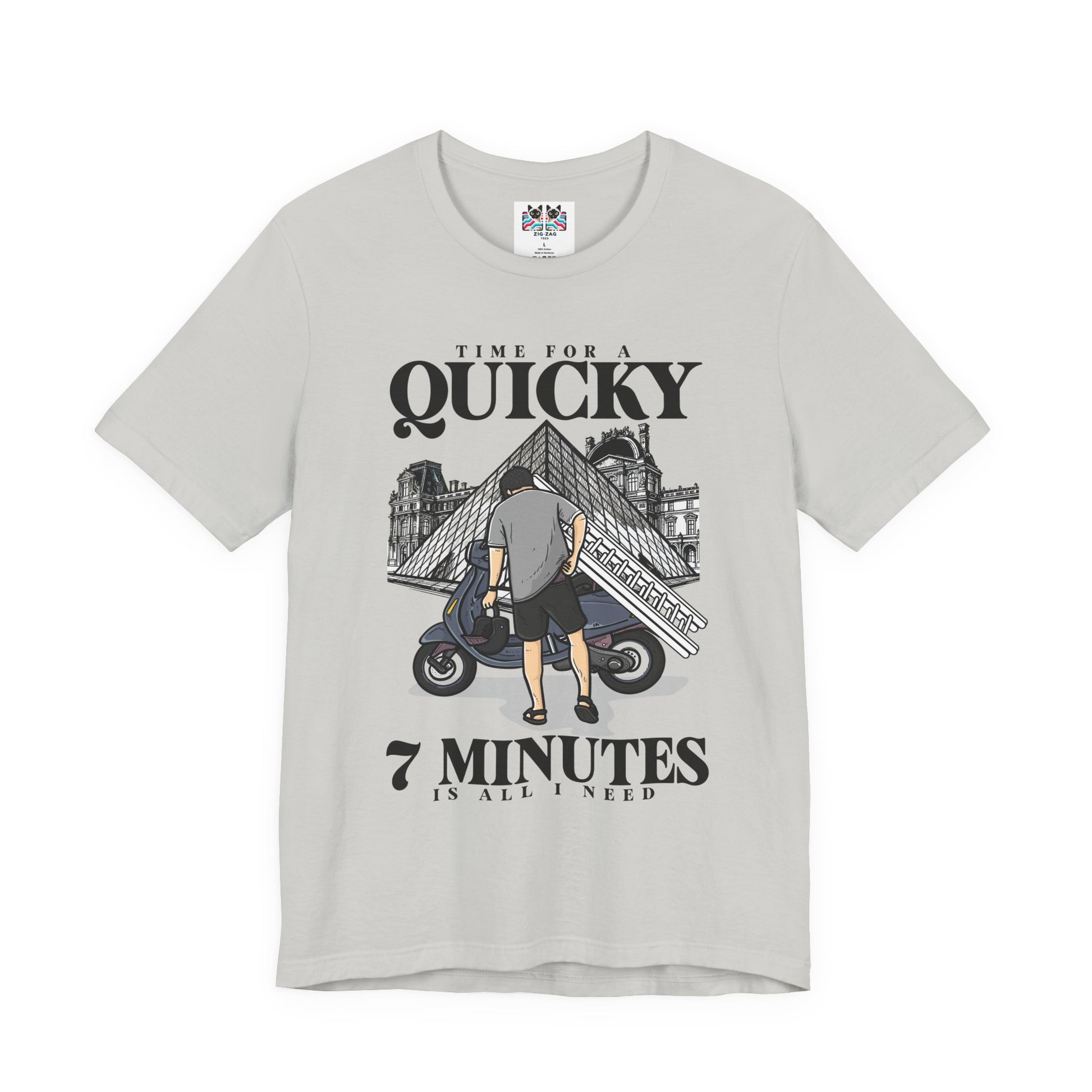 Get a laugh with this bold and clever t-shirt featuring a cartoon illustration of a man confidently walking towards a scooter rigged with a ladder, helmet in hand, set against the iconic Louvre Museum backdrop. Above the scene, large script proclaims "Time for a Quicky"—with the mischievous caption "7 minutes is all I need" underneath. This playful design is perfect for anyone who appreciates art-inspired humor, fast getaways, or French caper culture.
