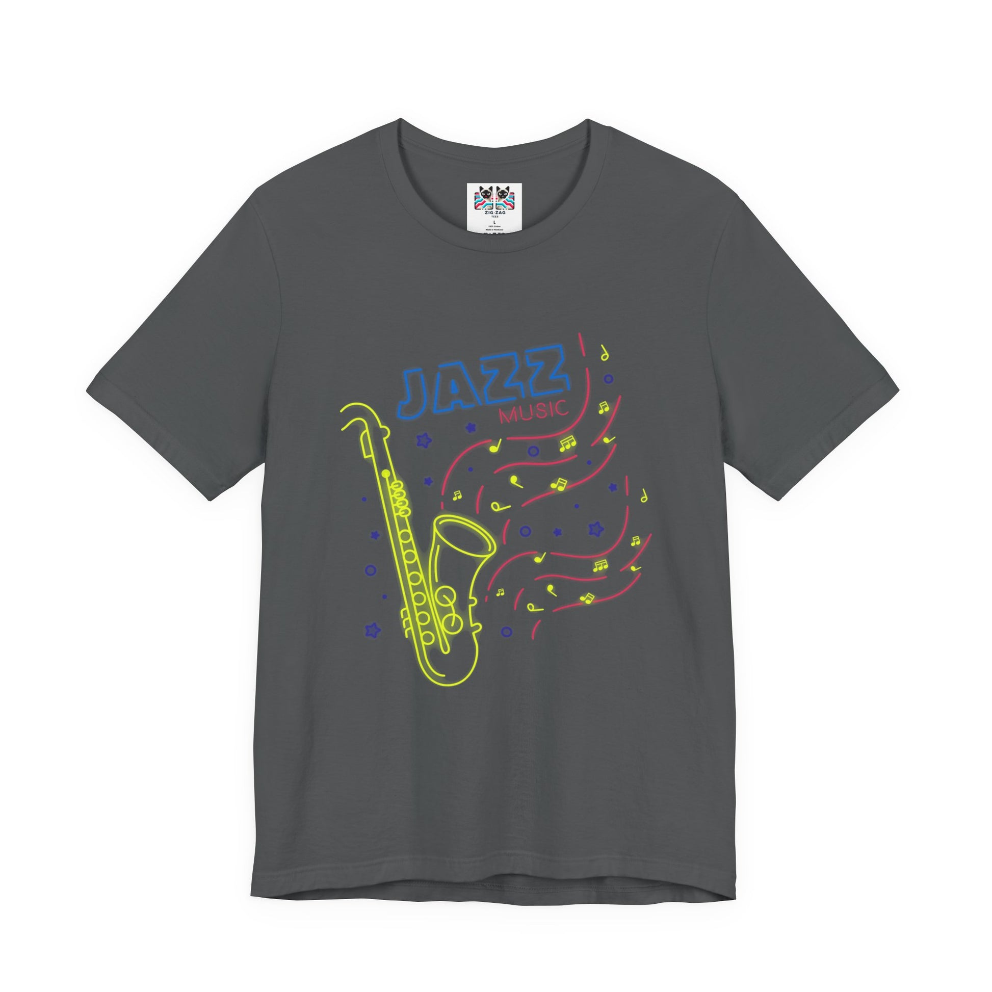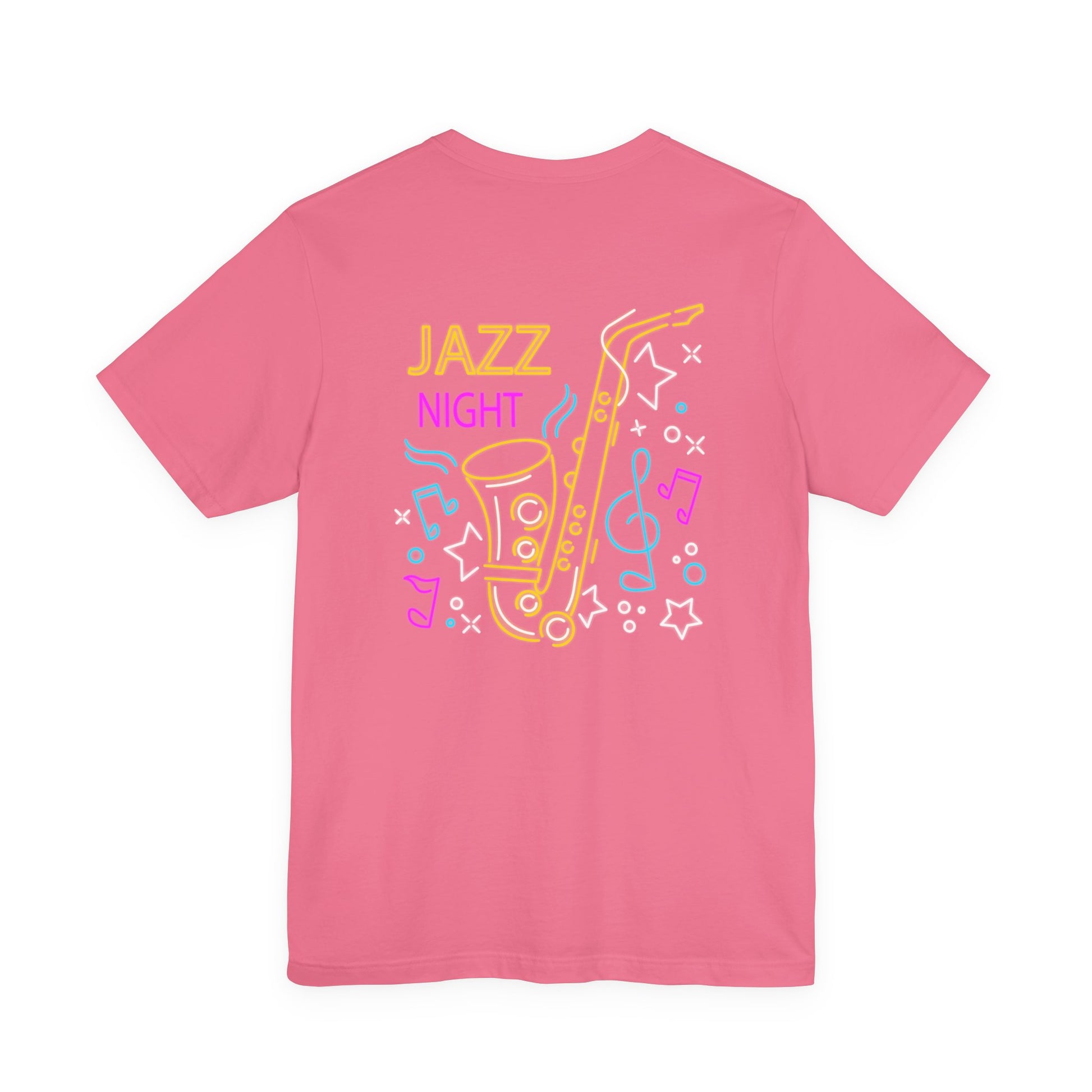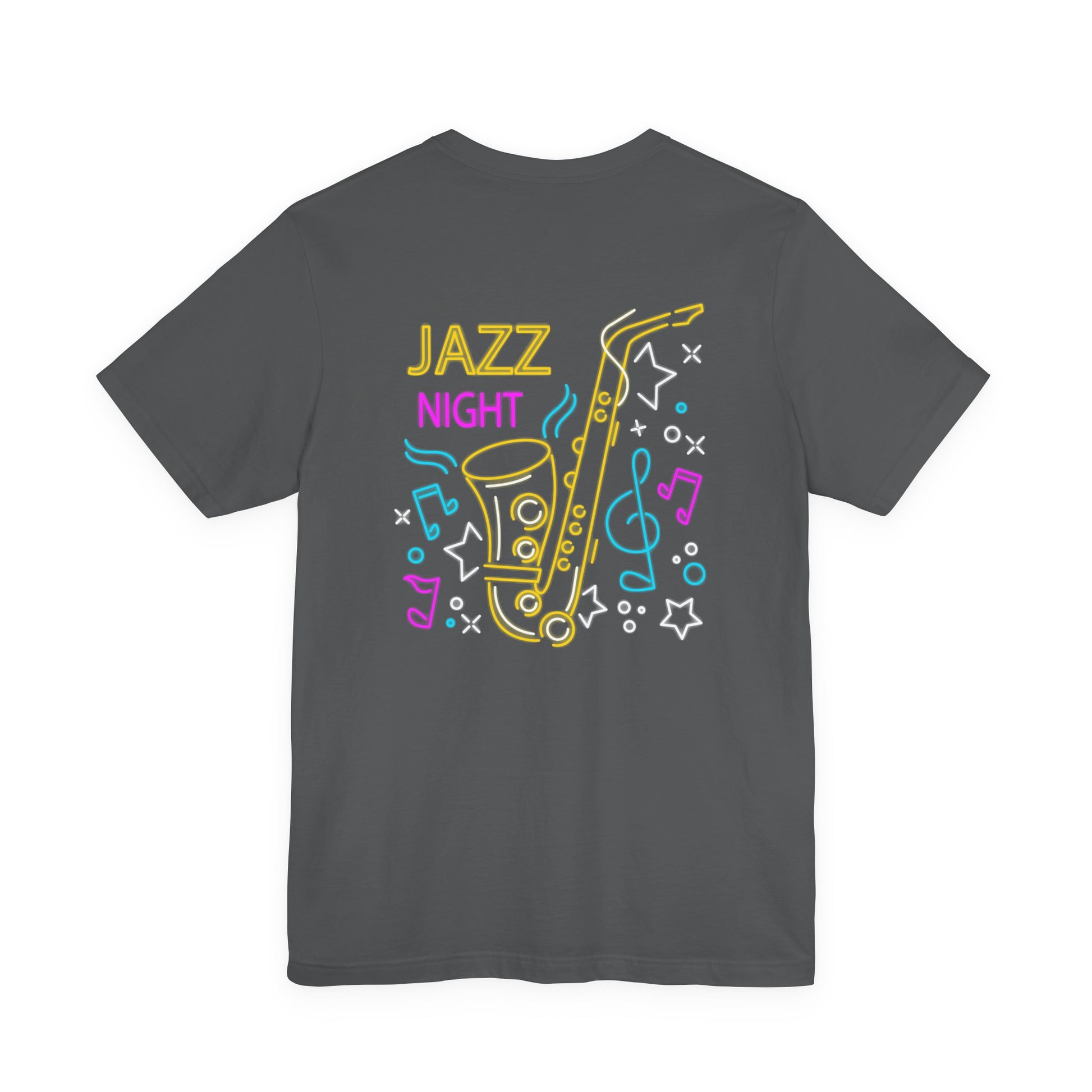 Description: Light up the night with this neon-style Jazz Night t-shirt featuring a vibrant saxophone surrounded by colorful music notes and stars on both front and back. Perfect for jazz lovers, musicians, saxophone players, and concert-goers, this bold graphic tee captures the energy of live music and late-night jam sessions. Ideal for gigs, festivals, jazz clubs, or as a unique gift for any music fan who loves smooth sax sounds and retro neon vibes.
