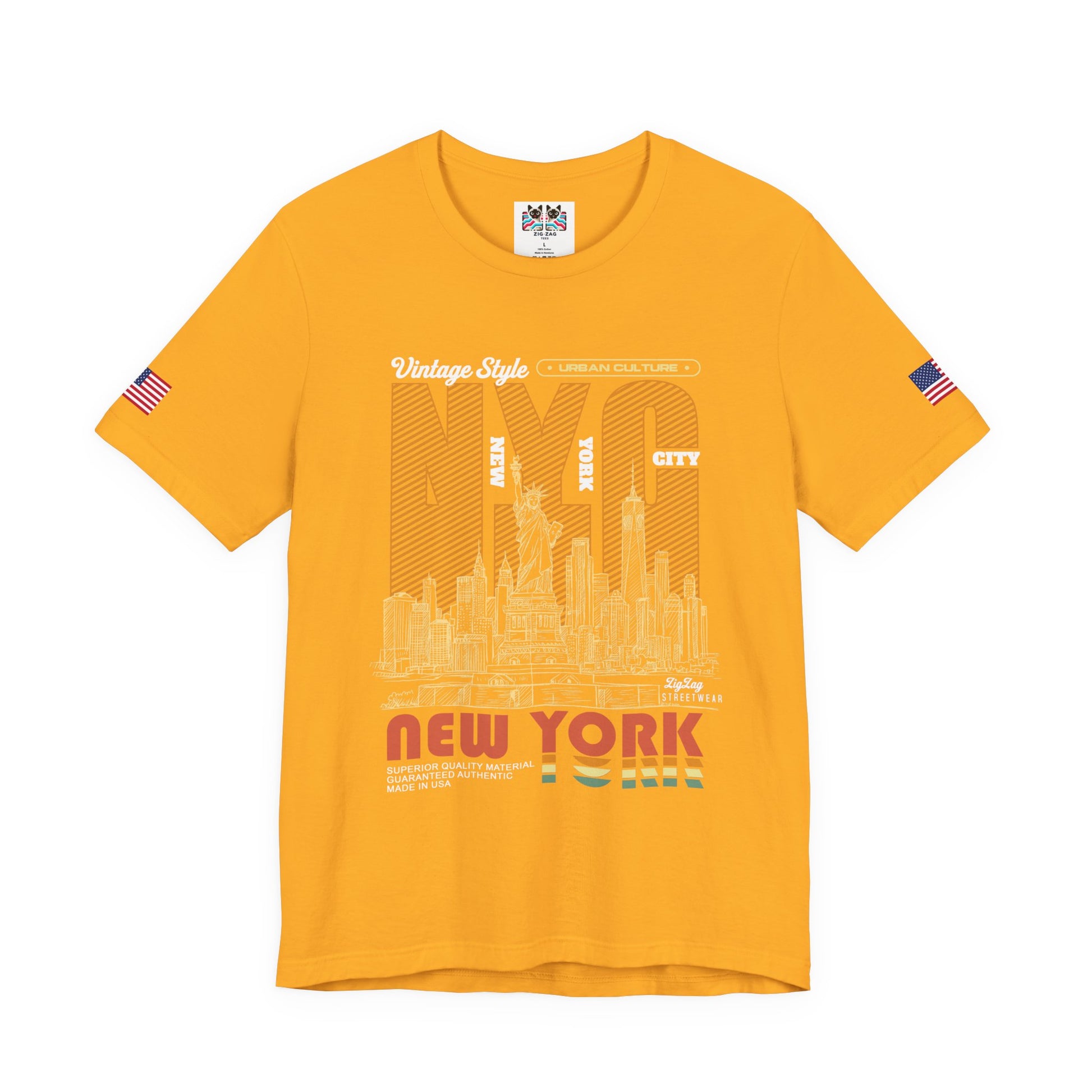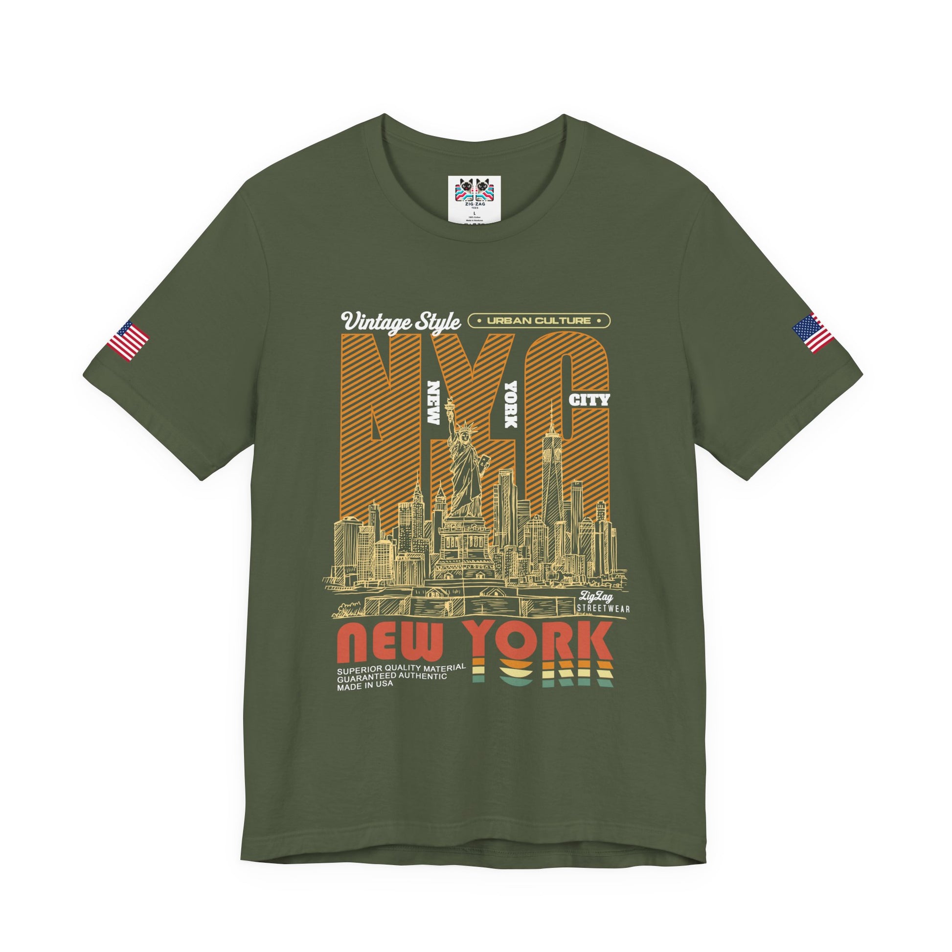 Step back in time with this vintage-style New York City t-shirt featuring retro orange and yellow striped typography spelling "NYC" with the Statue of Liberty incorporated into the design. The bottom features "New York" in colorful retro rainbow lettering reminiscent of 1970s design. Text includes "Vintage Style - URBAN CULTURE - CITY - NEW YORK YORK - SUPERIOR QUALITY MATERIAL GUARANTEED AUTHENTIC MADE IN USA - ZigZag Streetwear." The detailed NYC skyline with bridges and buildings creates an authentic vintage NYC vibe. This black t-shirt with American flag sleeve patches is perfect for retro fashion lovers, vintage enthusiasts, hip-hop culture fans, and anyone who appreciates classic New York streetwear aesthetic from the golden era.