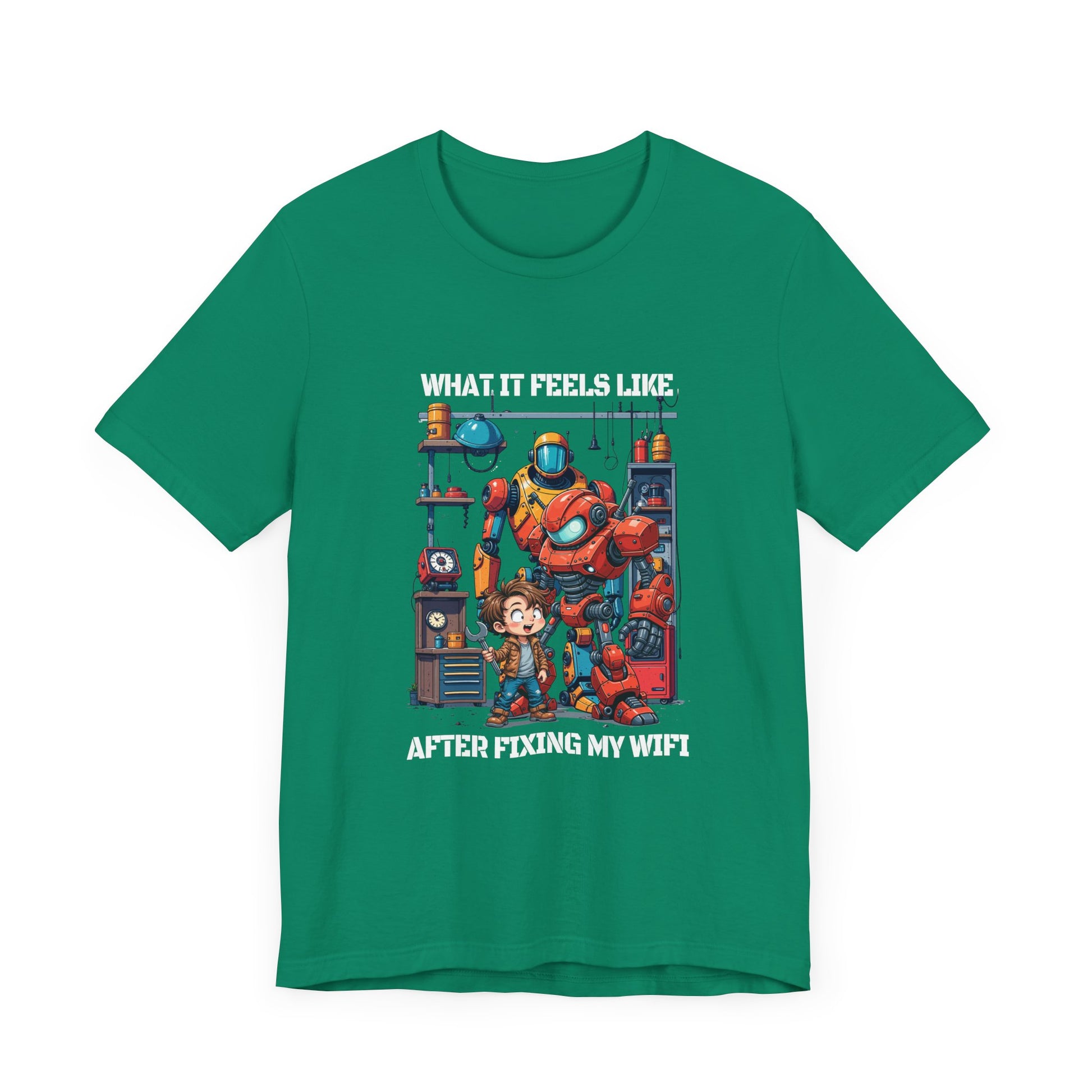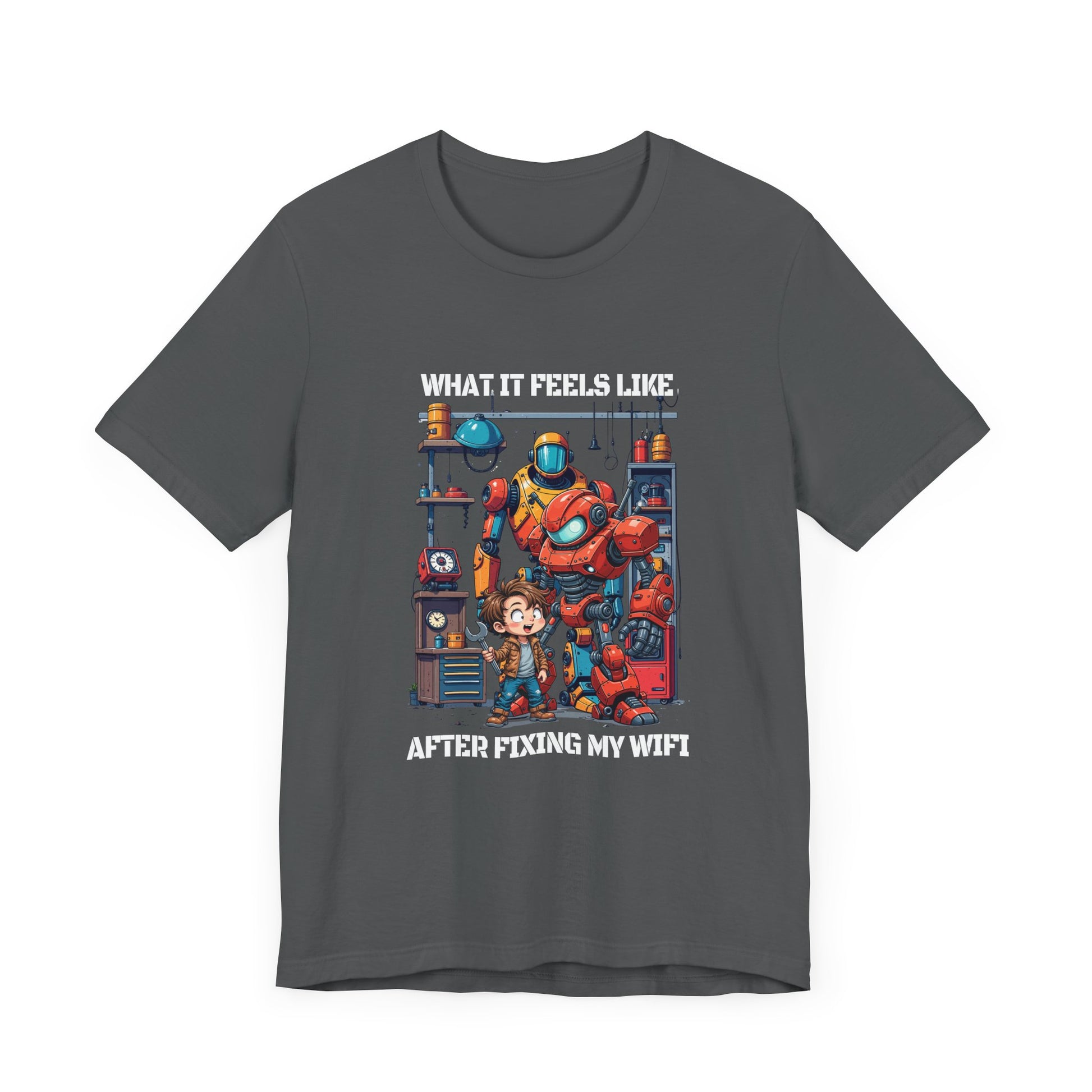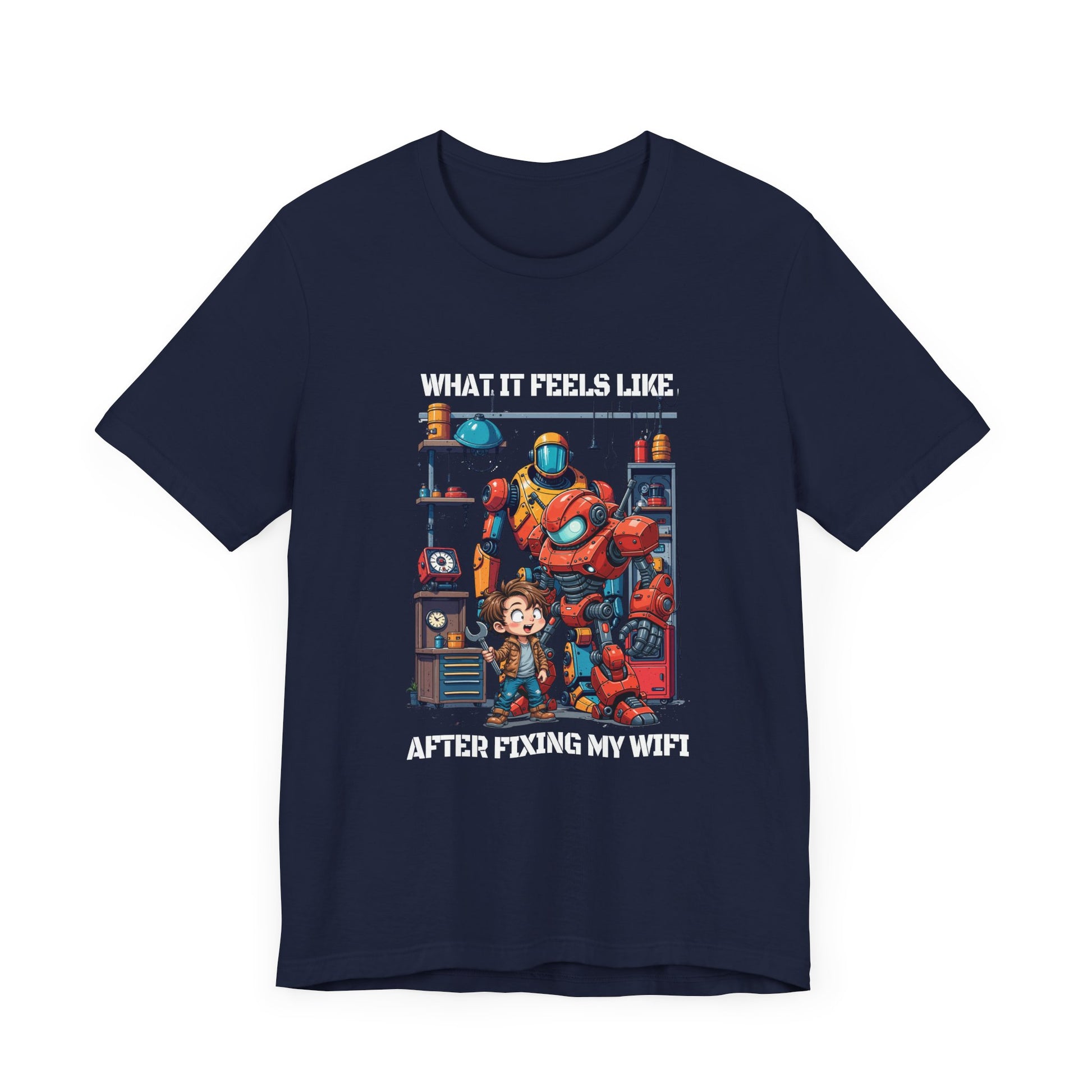 Celebrate the triumph of tech success with this playful "What It Feels Like After Fixing My WIFI" t-shirt, featuring a joyful little boy holding tools in a high-tech garage surrounded by transformers. Perfect for tech enthusiasts, DIY lovers, and anyone who’s experienced the sweet victory of solving a tricky WIFI problem. Made from soft, comfortable fabric, this tee combines humor and relatable tech pride, making it a great gift or casual wear choice for geeks, engineers, and problem solvers alike. Show off your inner tech hero with style and a smile!