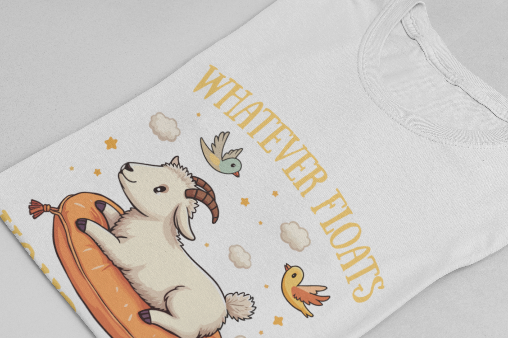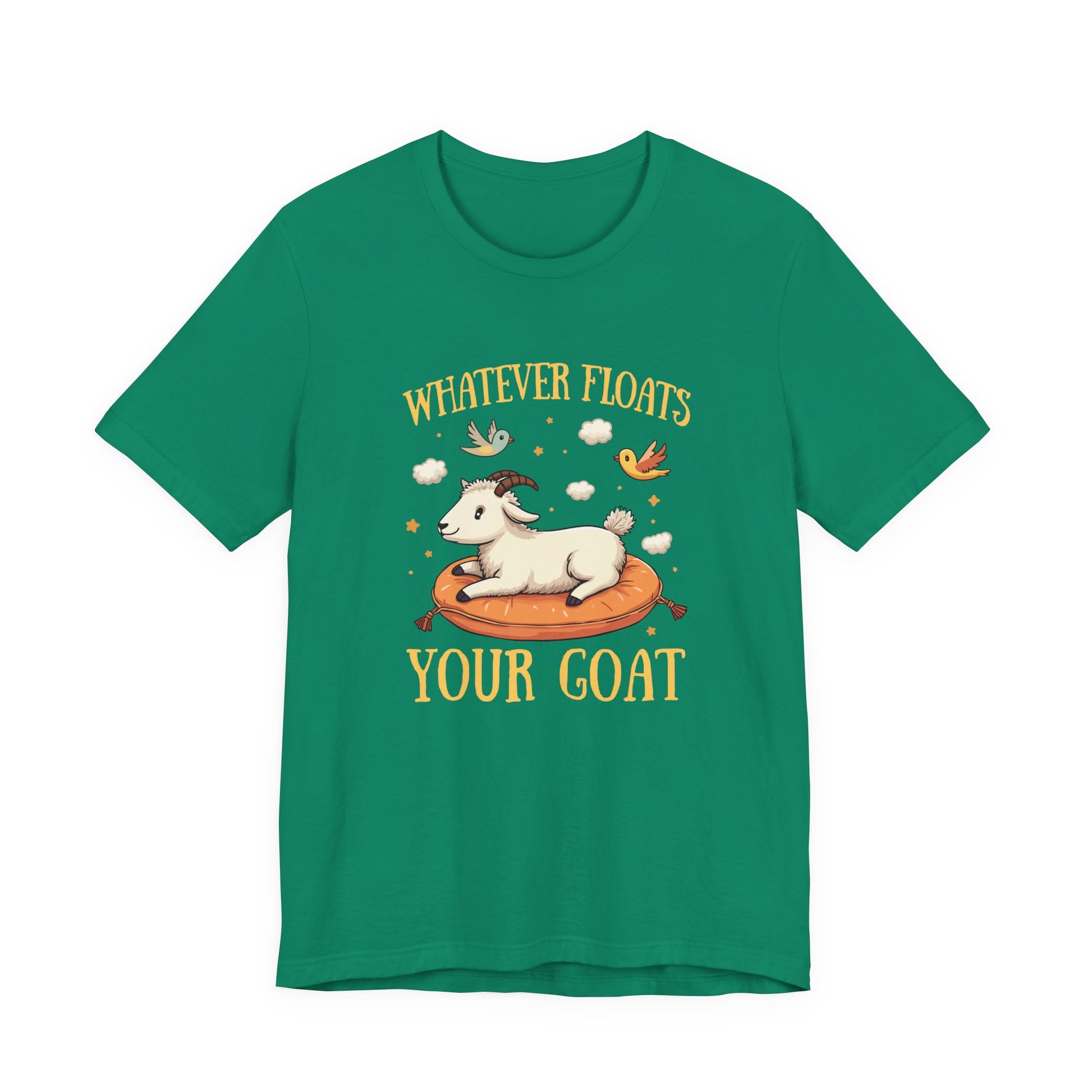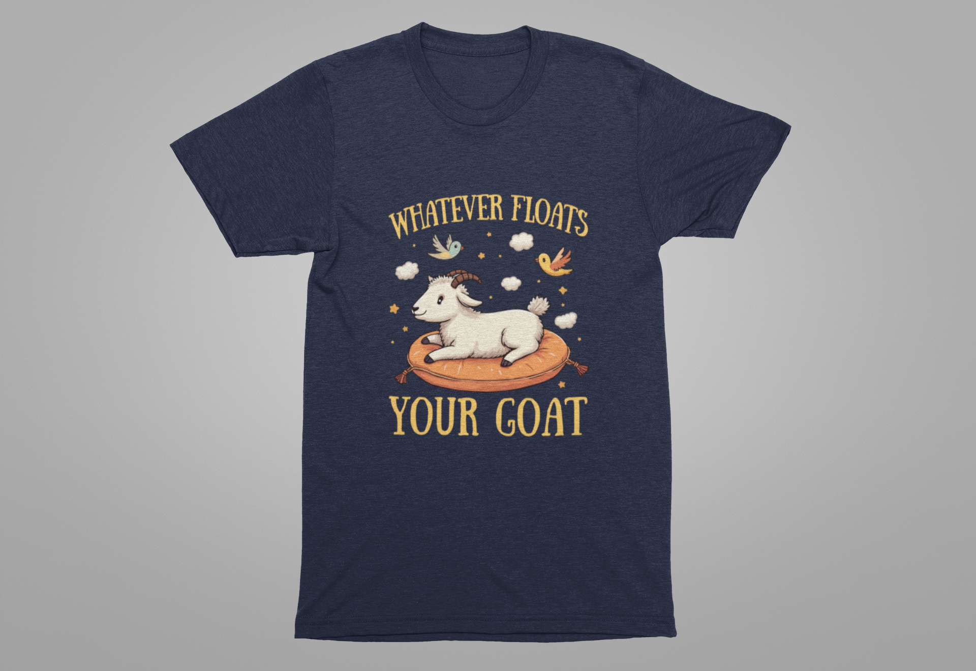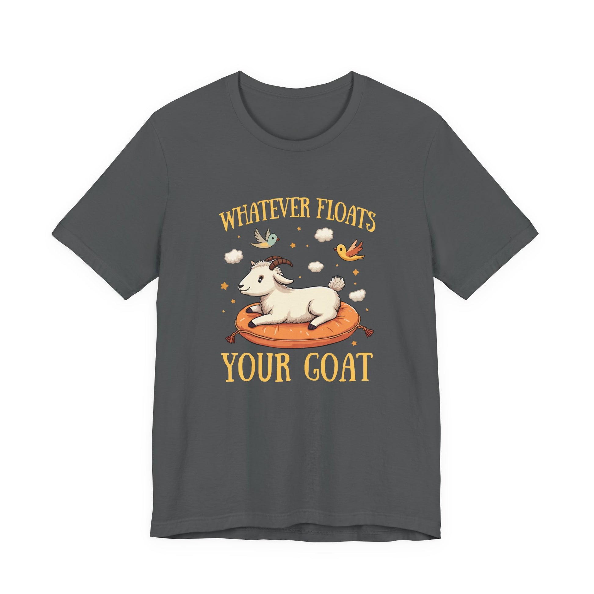 Add a playful twist to your style with this unique t shirt, featuring a goat happily floating in the air atop a comfortable, air-filled cushion. Surrounded by small clouds and cheerful birds, this whimsical scene captures carefree joy. The bold text "Whatever floats your goat" adds a humorous pun, making this tee perfect for animal lovers, those who appreciate fun sayings, or anyone seeking a lighthearted touch to their wardrobe. Made from soft, high-quality fabric, it's ideal for casual wear, gifts, or goat-themed events.