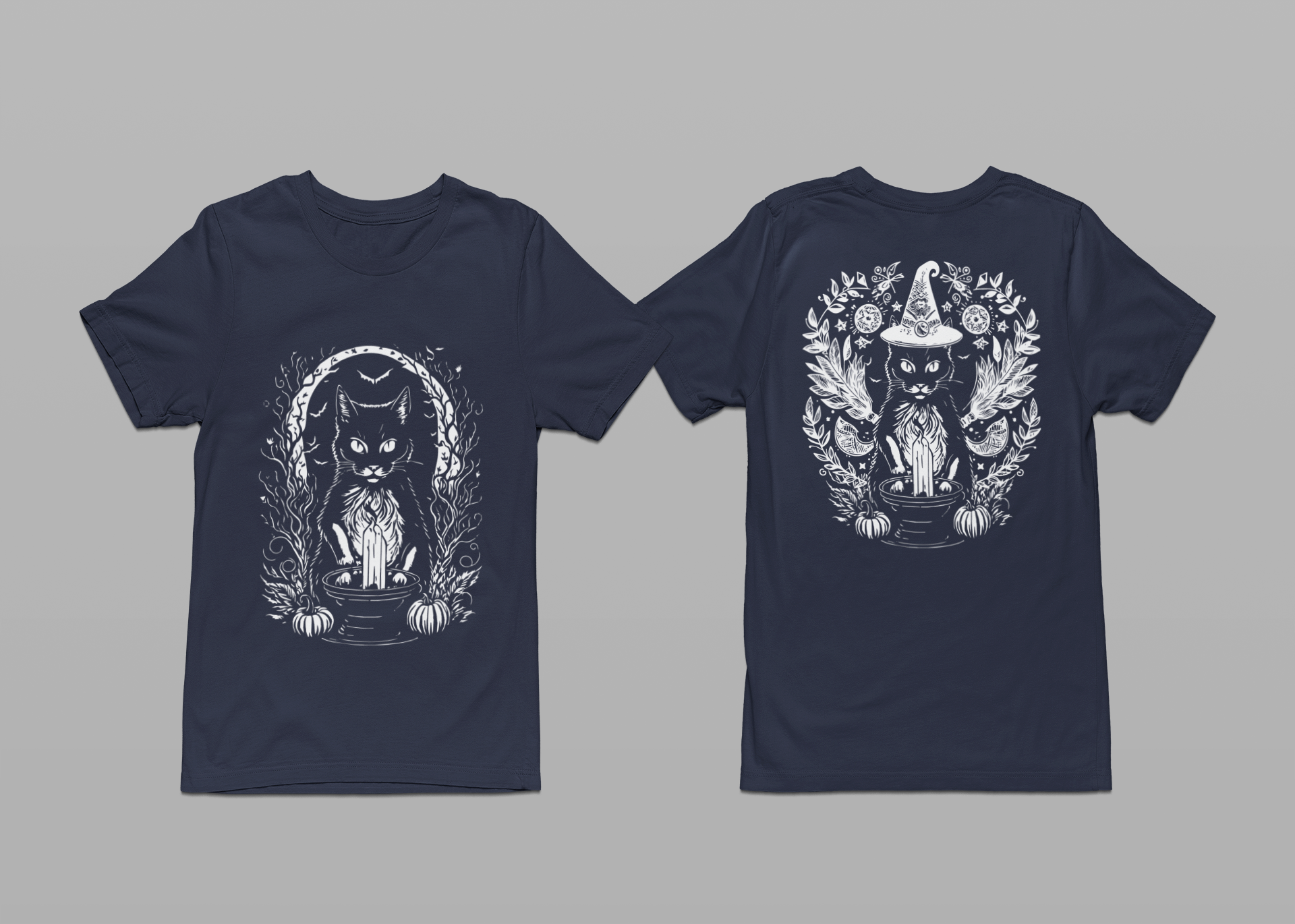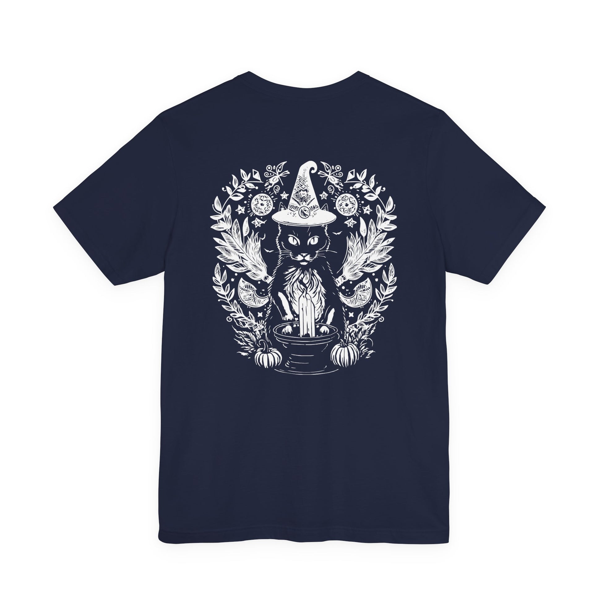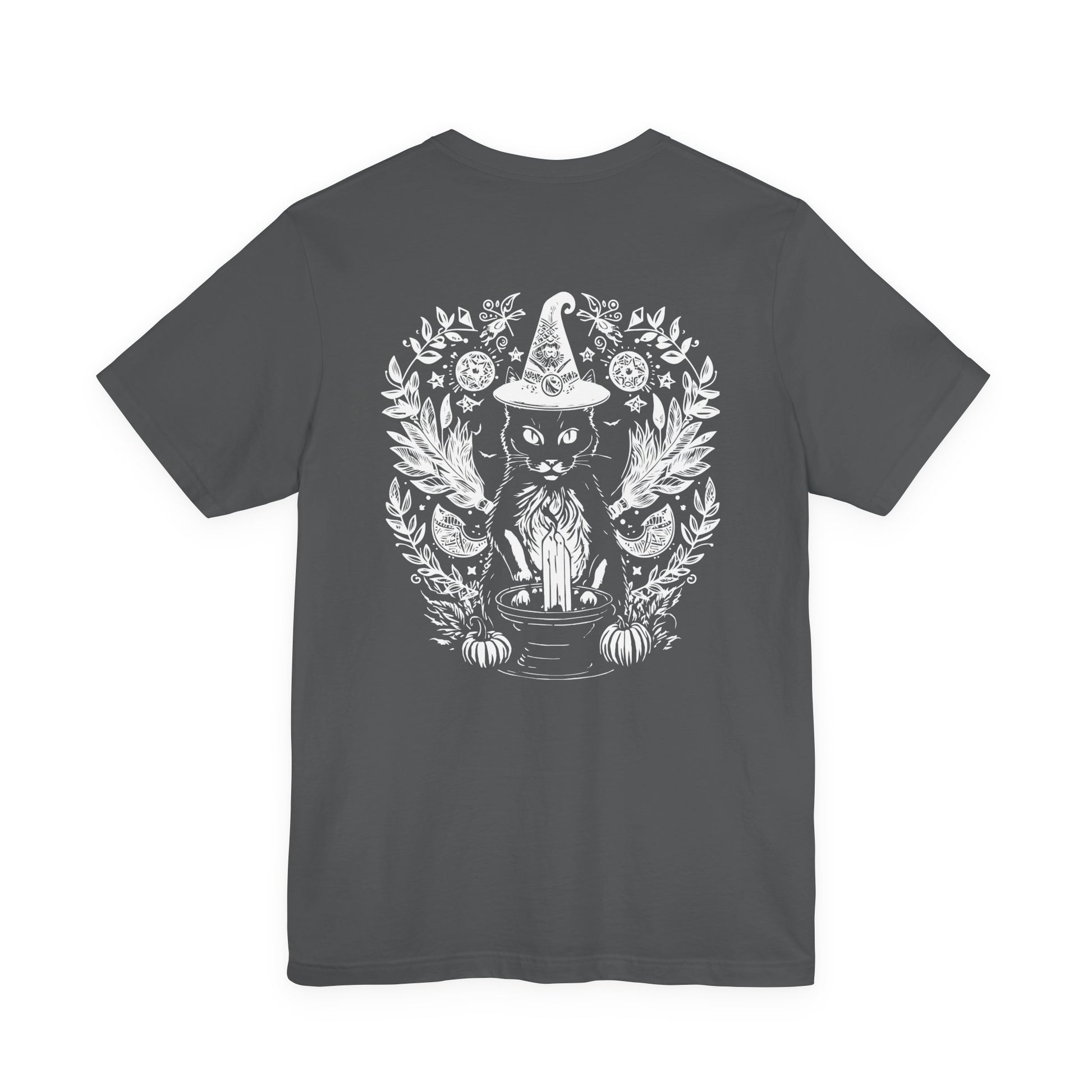 Add some mystical vibes to your wardrobe with this witchy black cat t-shirt featuring a magical cat sitting behind a tall candle, framed by a crescent moon, pumpkins, and swirling occult details on the front. The back design shows the same enchanting cat wearing a witch hat, surrounded by moons, herbs, and floral elements for a full spellcasting scene. Perfect for Halloween, witchcraft and occult fans, gothic style lovers, and cat enthusiasts, this dark yet cute graphic tee is great for rituals, parties, or everyday magic.