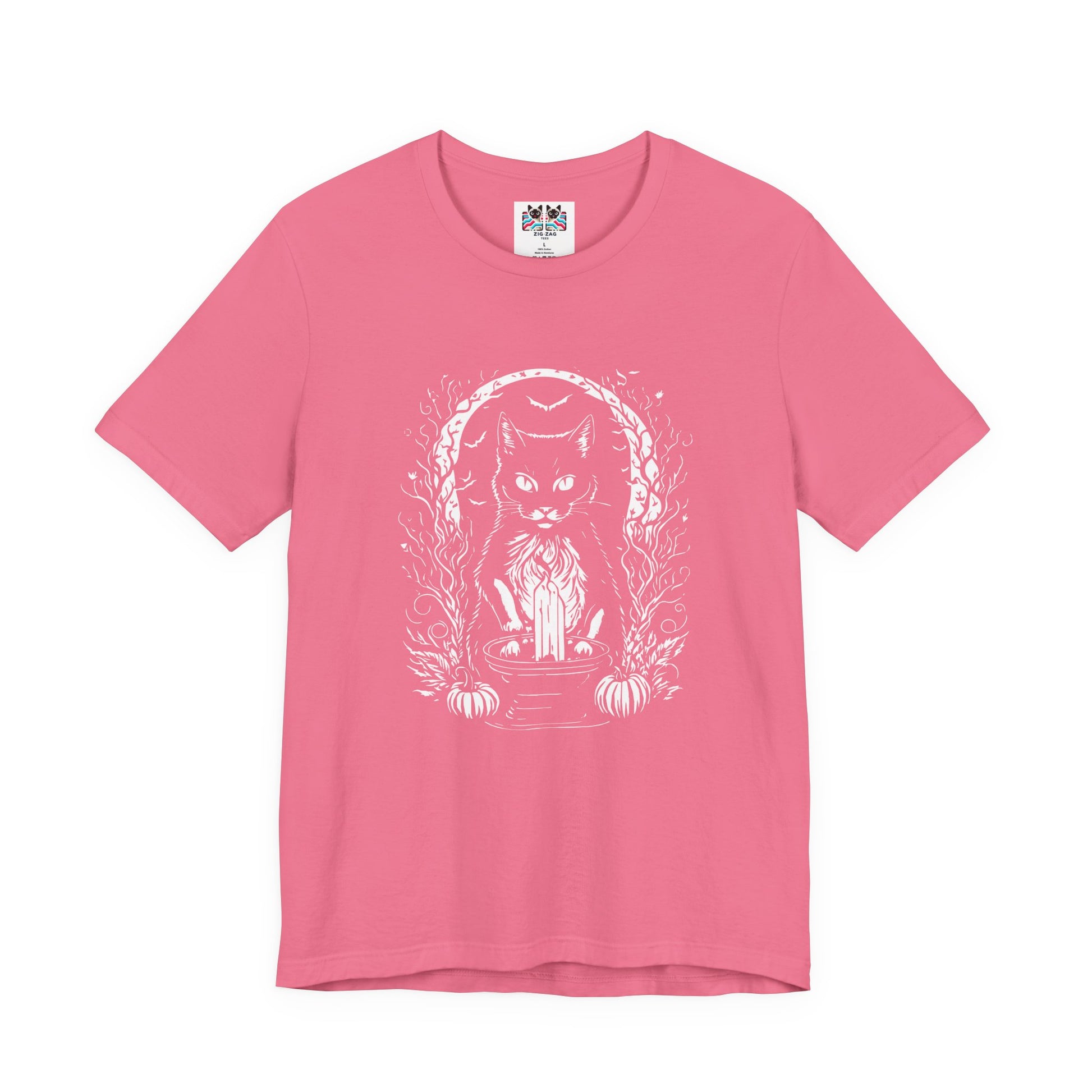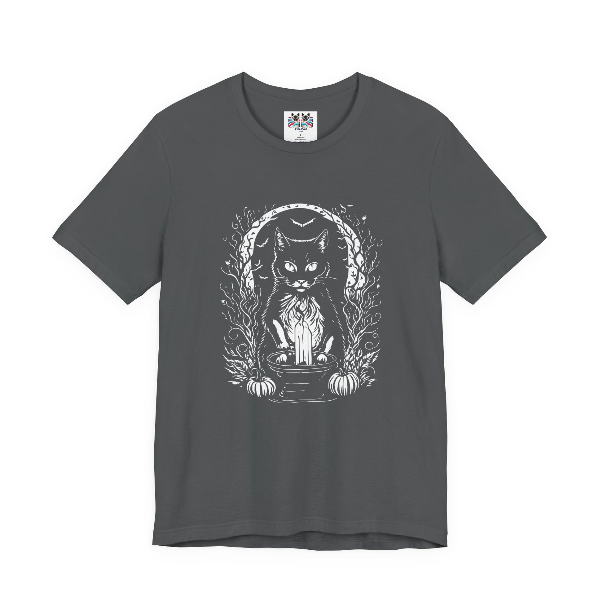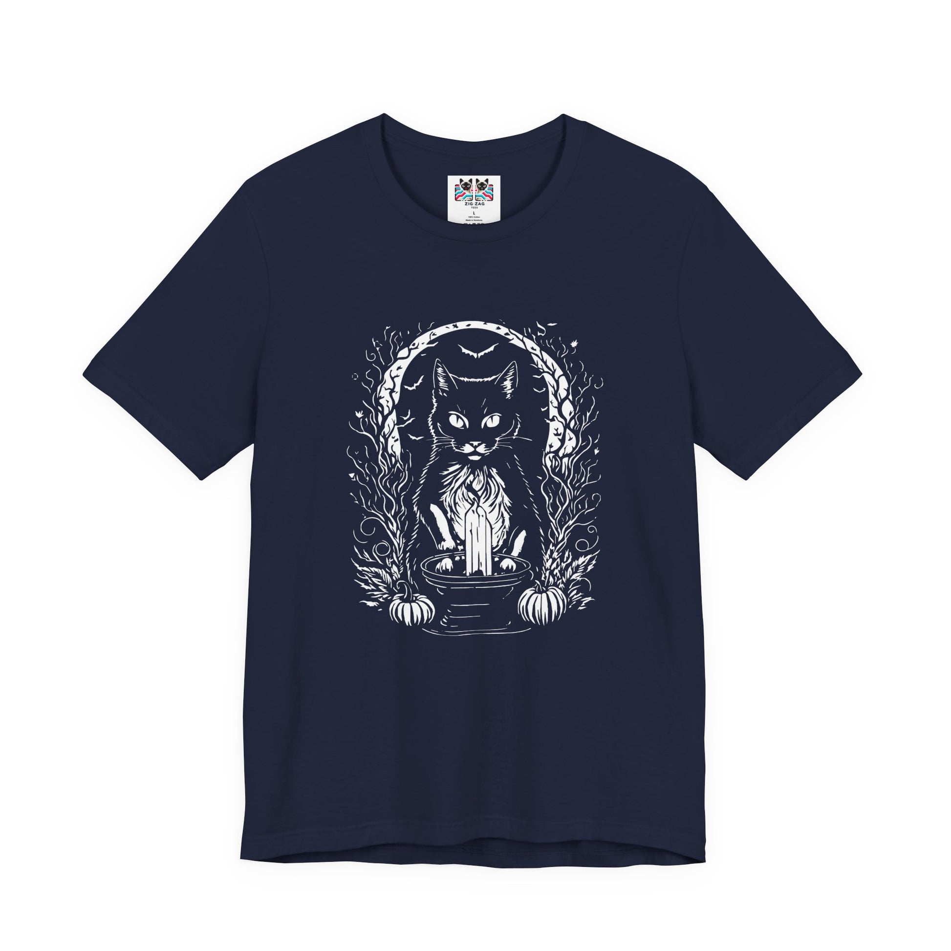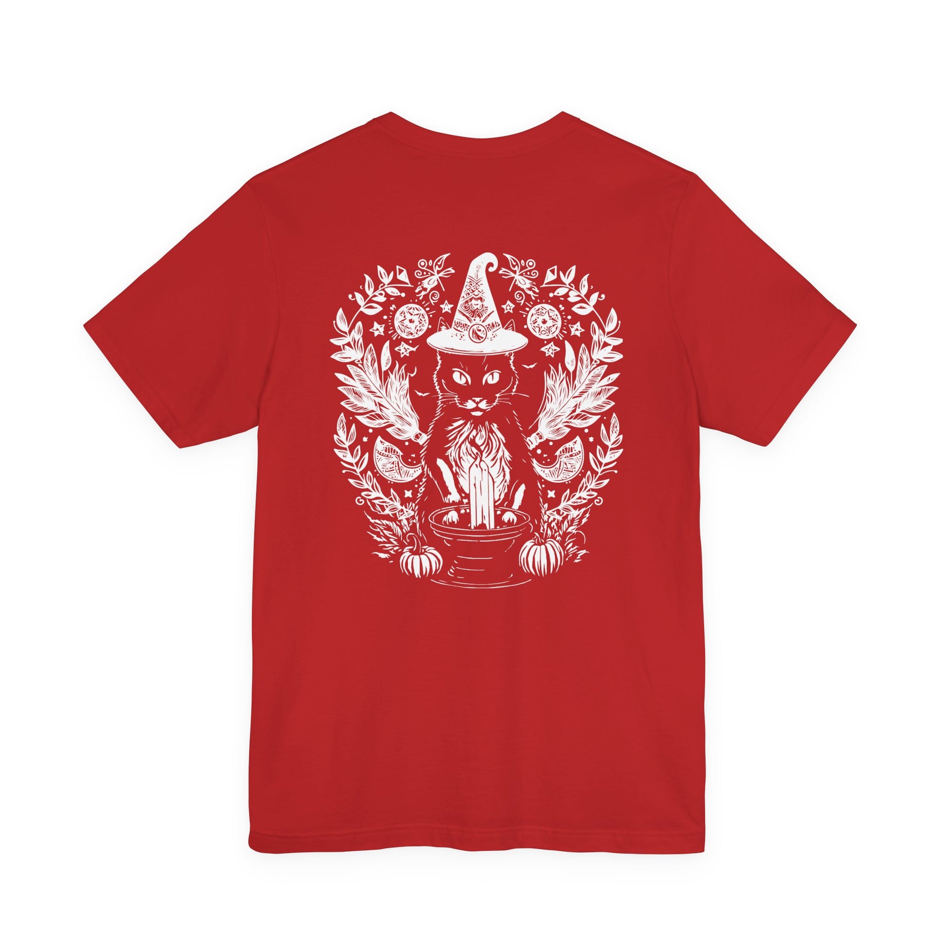 Add some mystical vibes to your wardrobe with this witchy black cat t-shirt featuring a magical cat sitting behind a tall candle, framed by a crescent moon, pumpkins, and swirling occult details on the front. The back design shows the same enchanting cat wearing a witch hat, surrounded by moons, herbs, and floral elements for a full spellcasting scene. Perfect for Halloween, witchcraft and occult fans, gothic style lovers, and cat enthusiasts, this dark yet cute graphic tee is great for rituals, parties, or everyday magic.