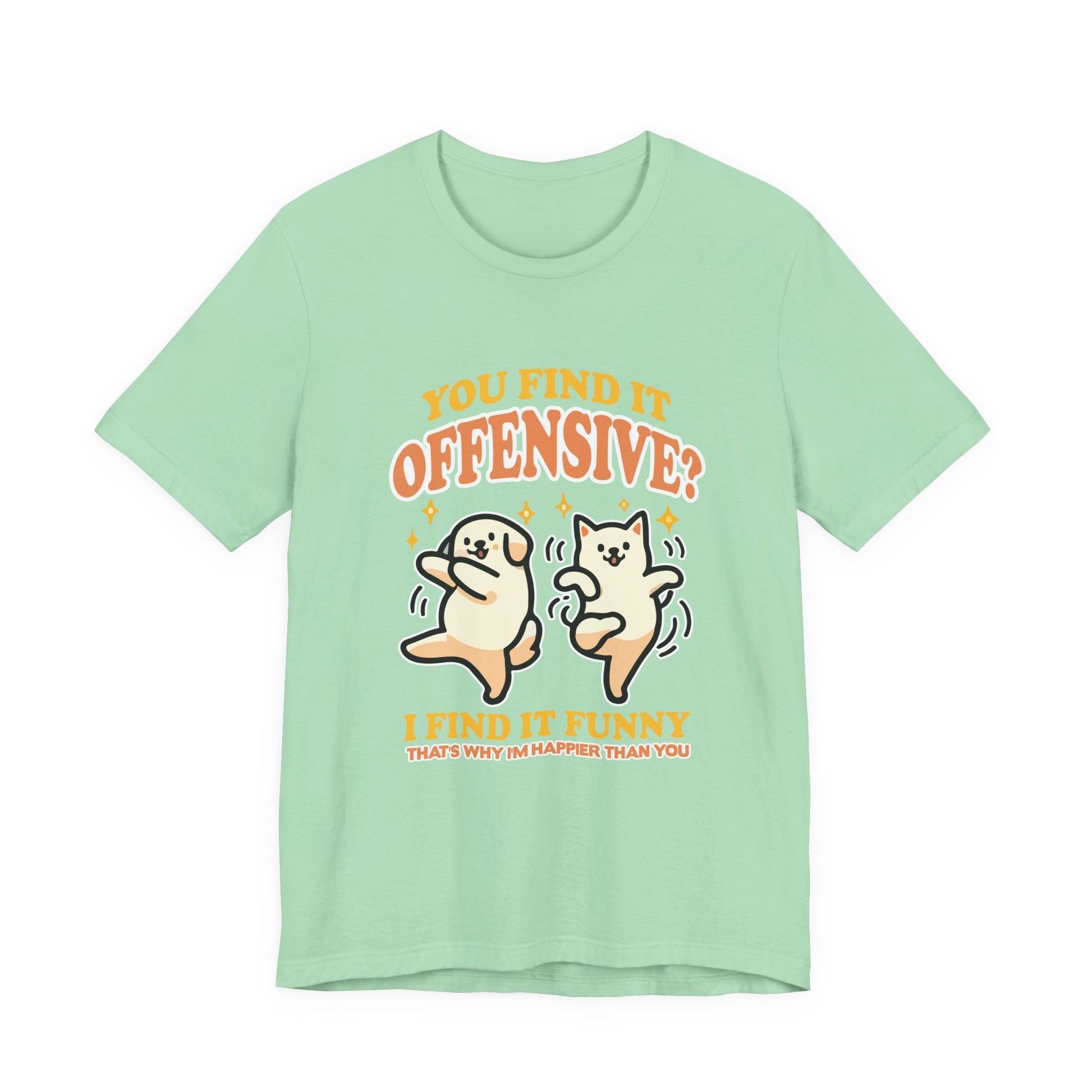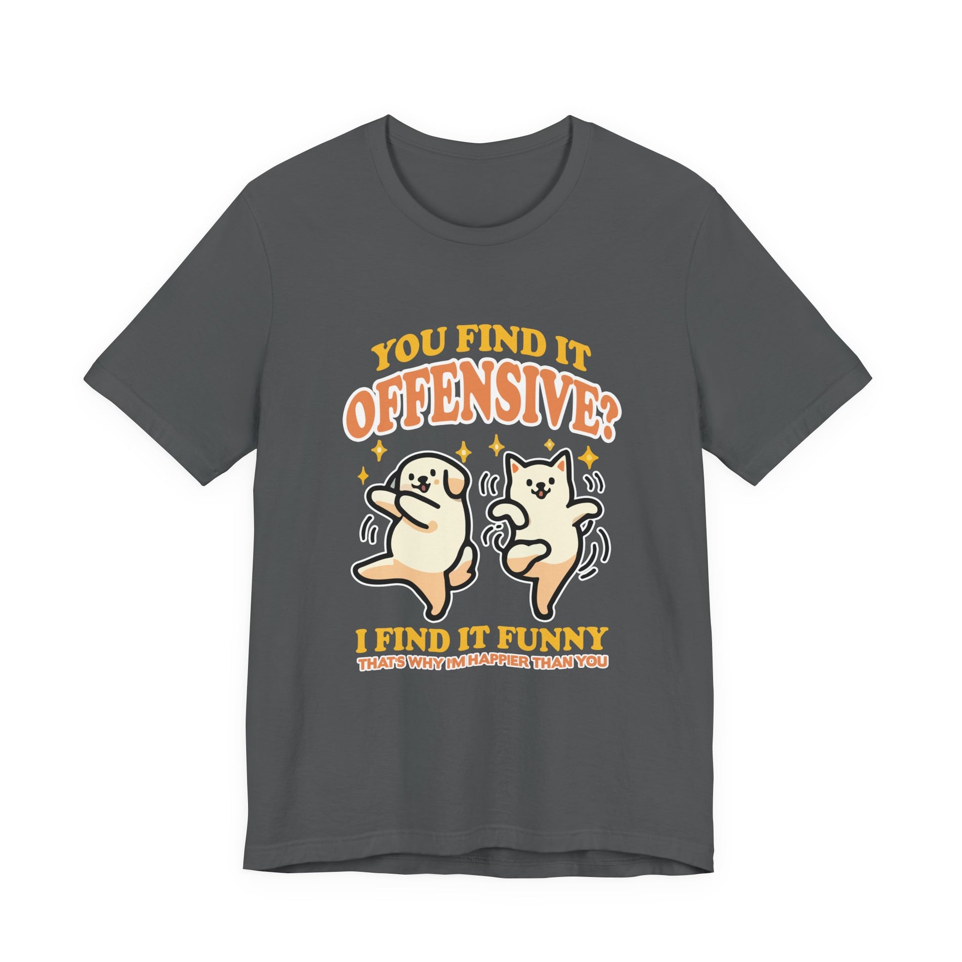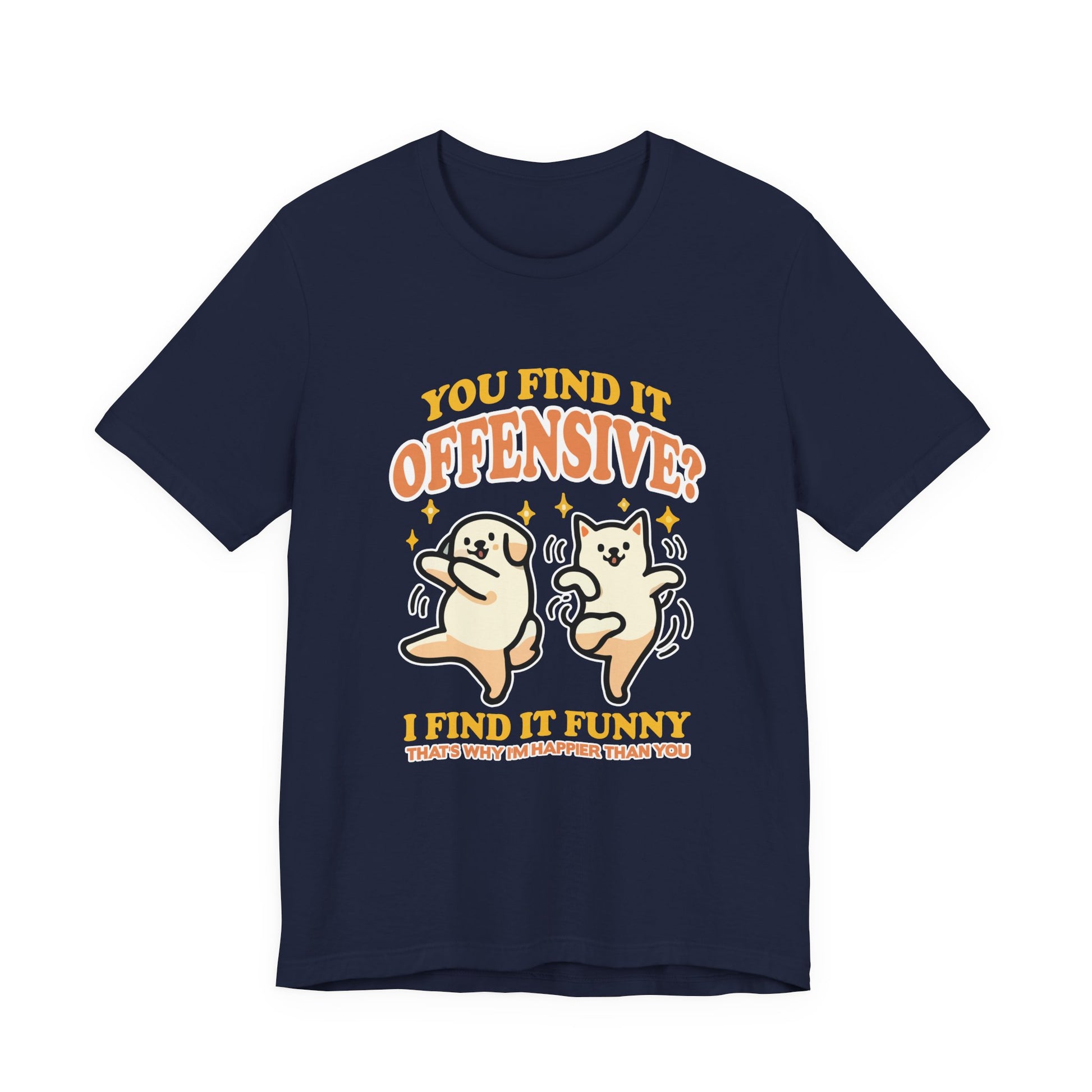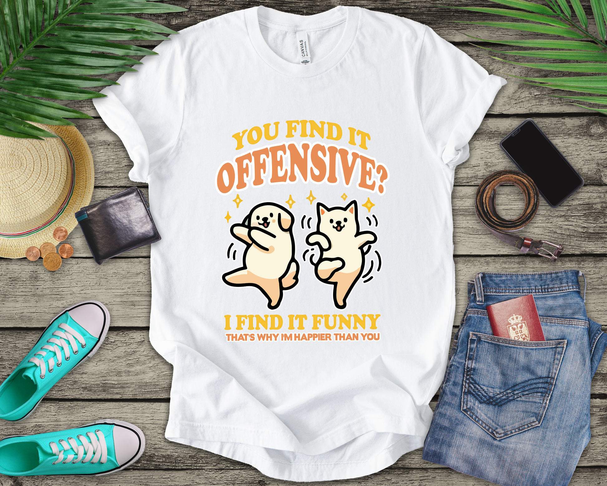 Spread joy and attitude with this energetic T-shirt! Featuring a cheerful cat and dog happily dancing together, this design delivers the witty phrase, “You find it OFFENSIVE? I find it funny, That's why I'm happier than you.” Perfect for anyone who loves humor, bold statements, and playful animal graphics. It’s a great gift for pet lovers and those who believe laughter is the best response.