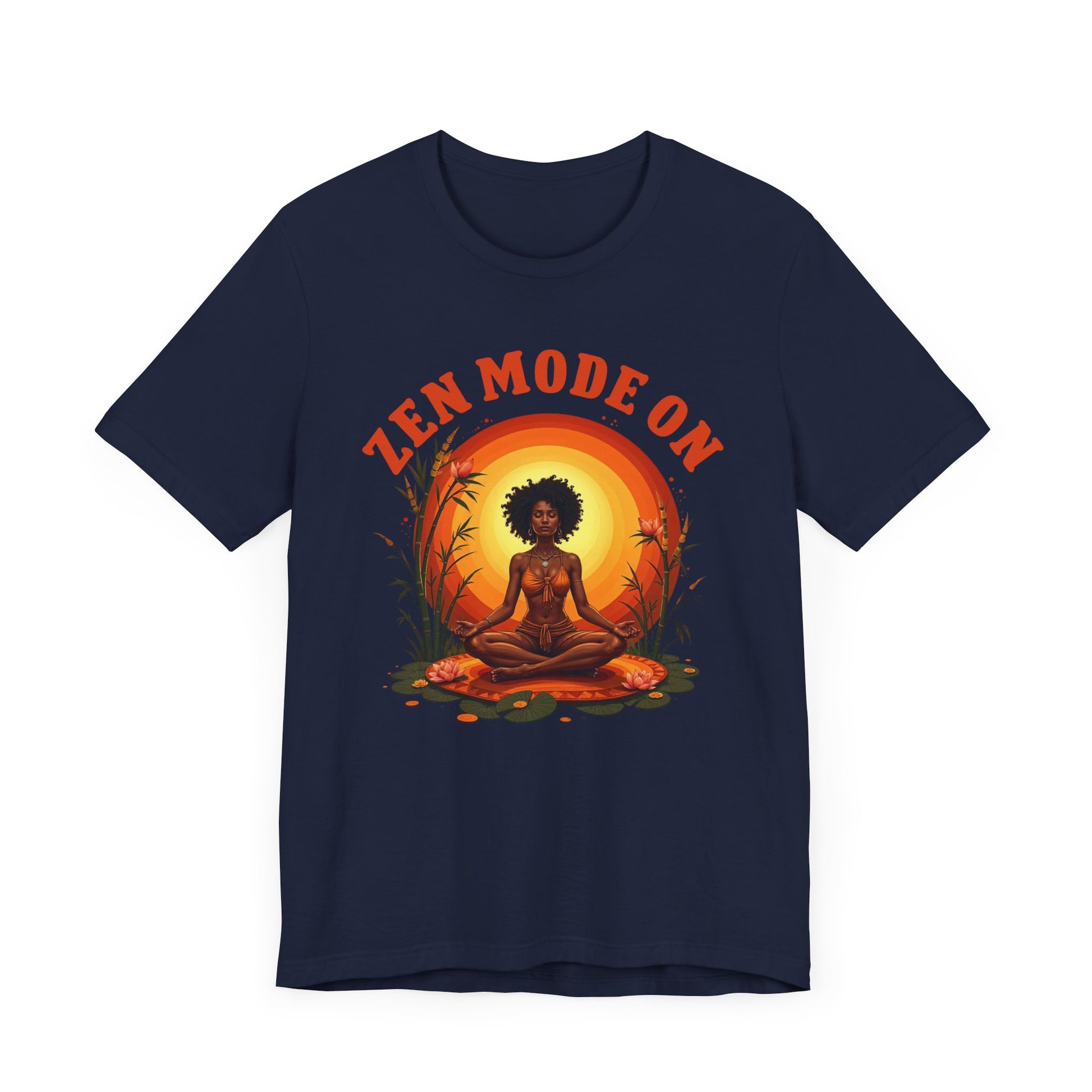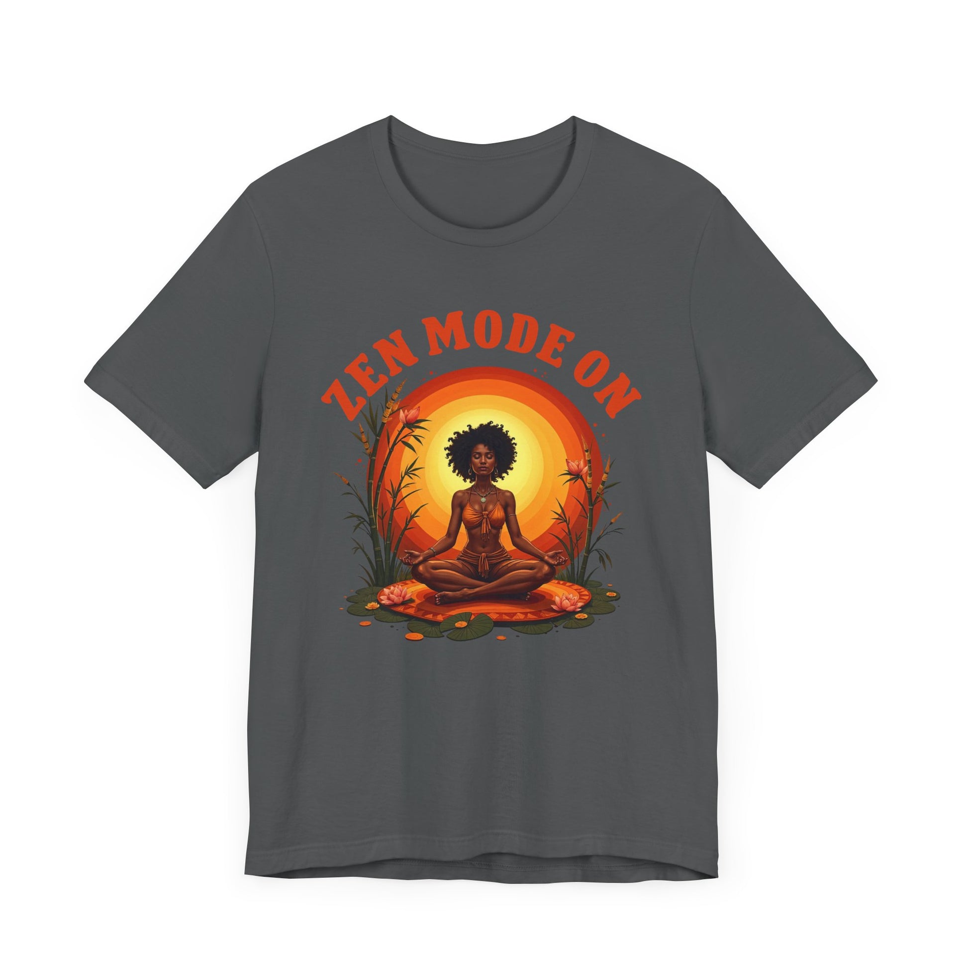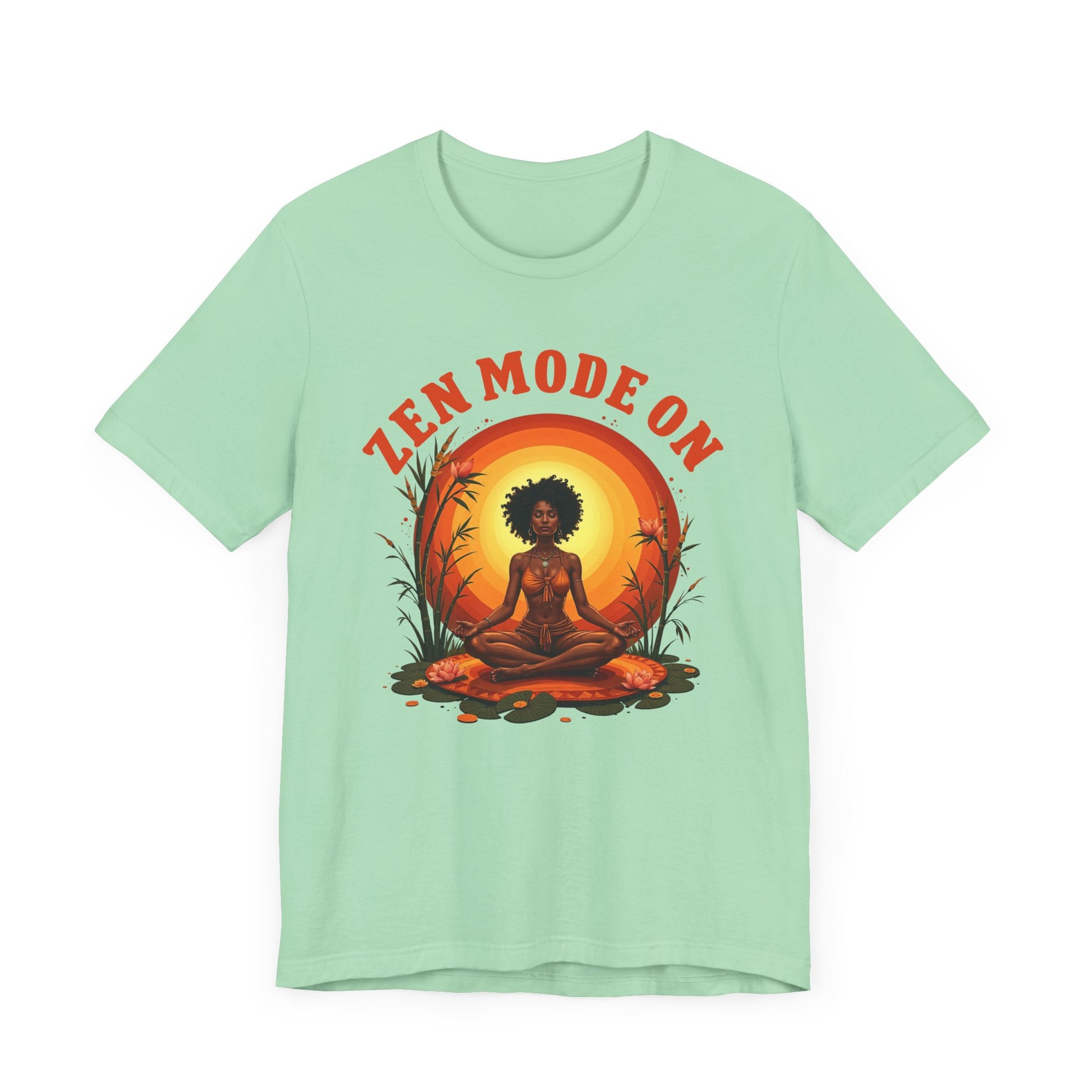 Embrace tranquility and mindfulness with this "Zen Mode On" t-shirt, featuring a serene woman meditating peacefully in an attractive dress. She sits gracefully on a circular, colorful board surrounded by lotus leaves and flowers, while a radiant background glows from light yellow to red in a soft gradient. This vibrant design is perfect for yoga lovers, meditation enthusiasts, and anyone seeking to inspire peace, positivity, and presence in their daily life. Crafted from soft, high-quality fabric for comfort during yoga, meditation, or casual outings