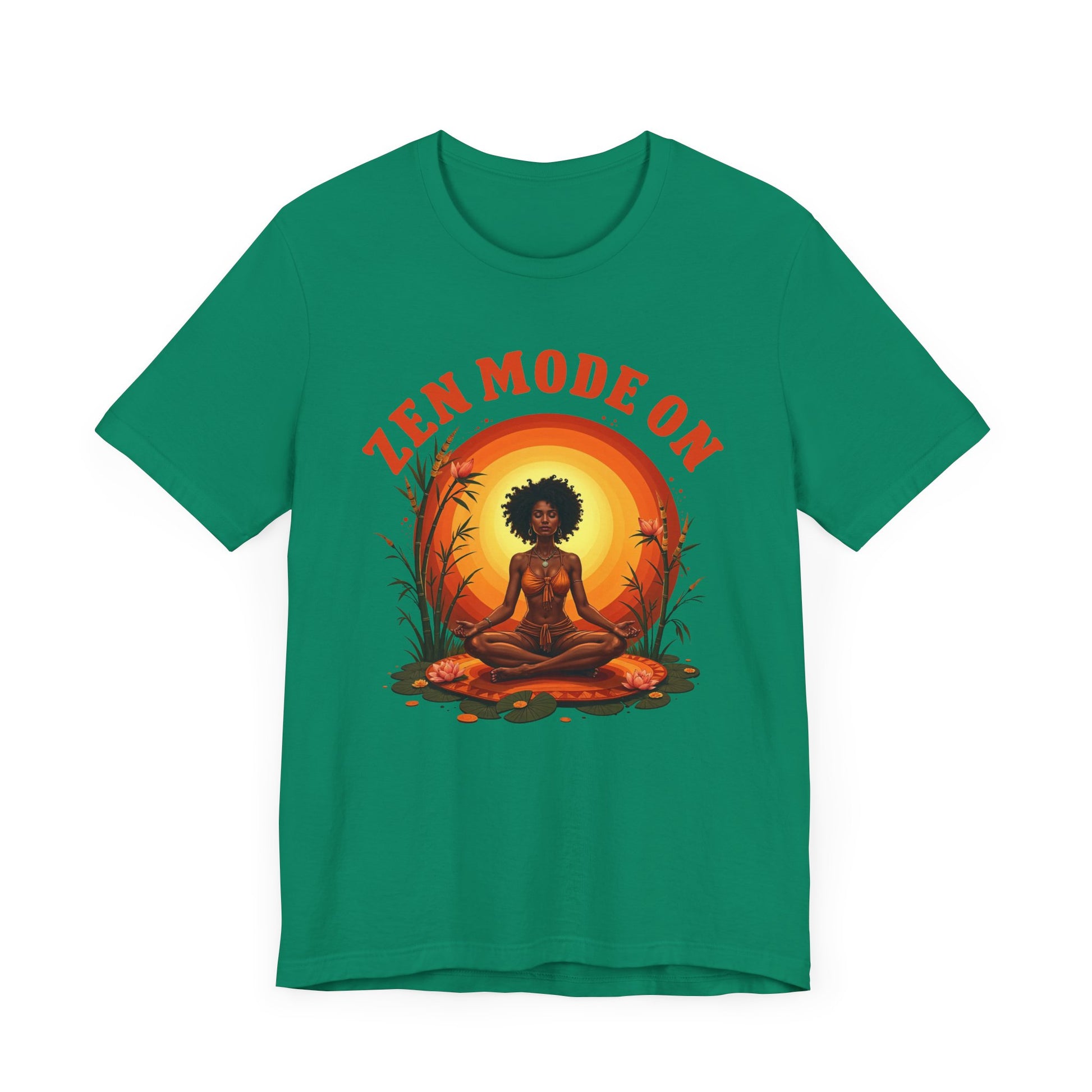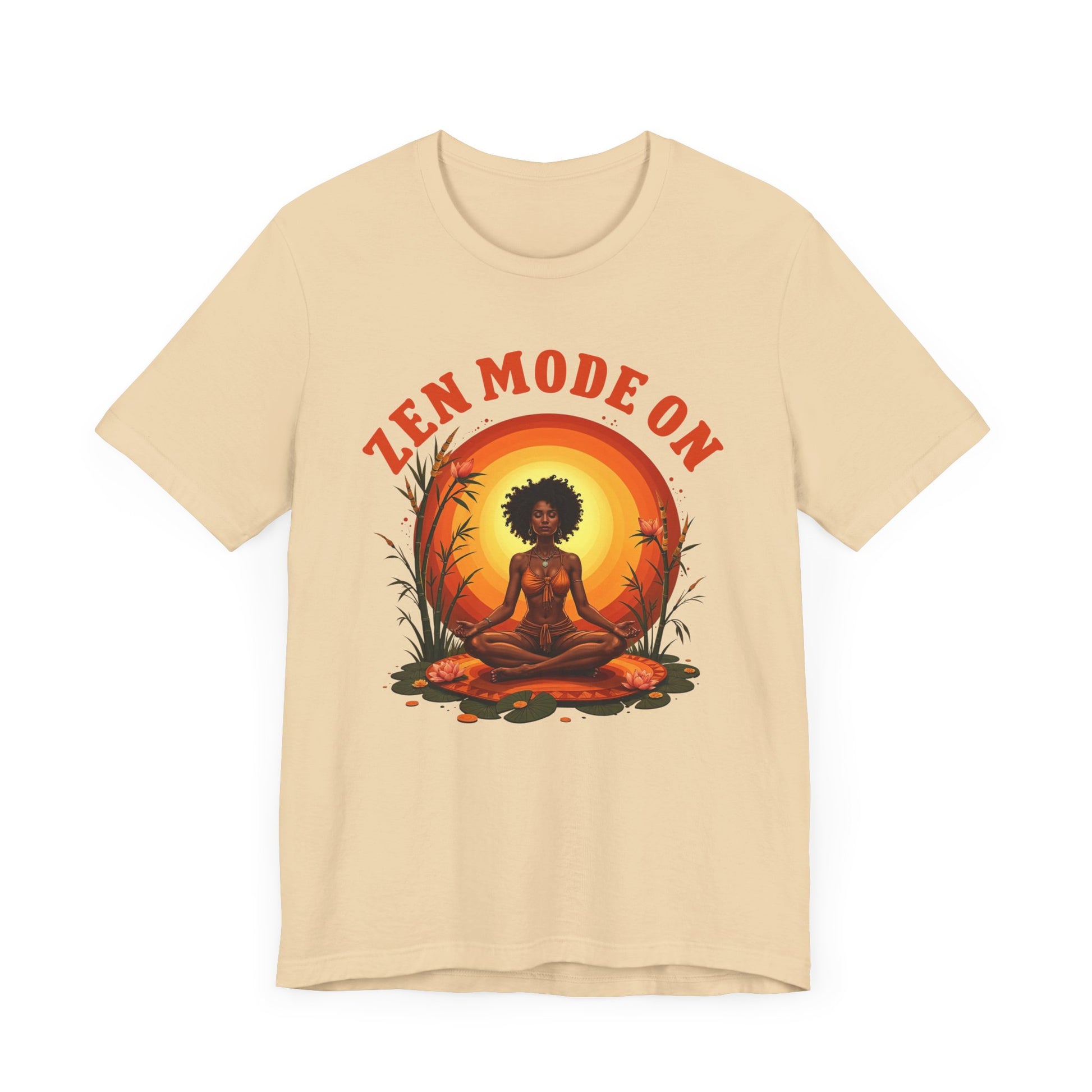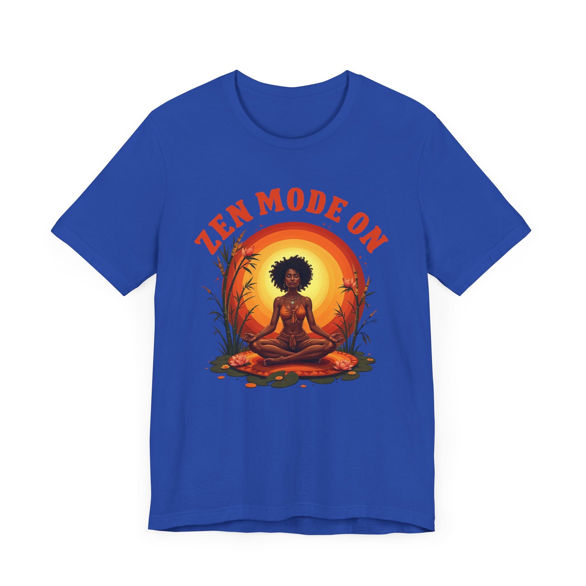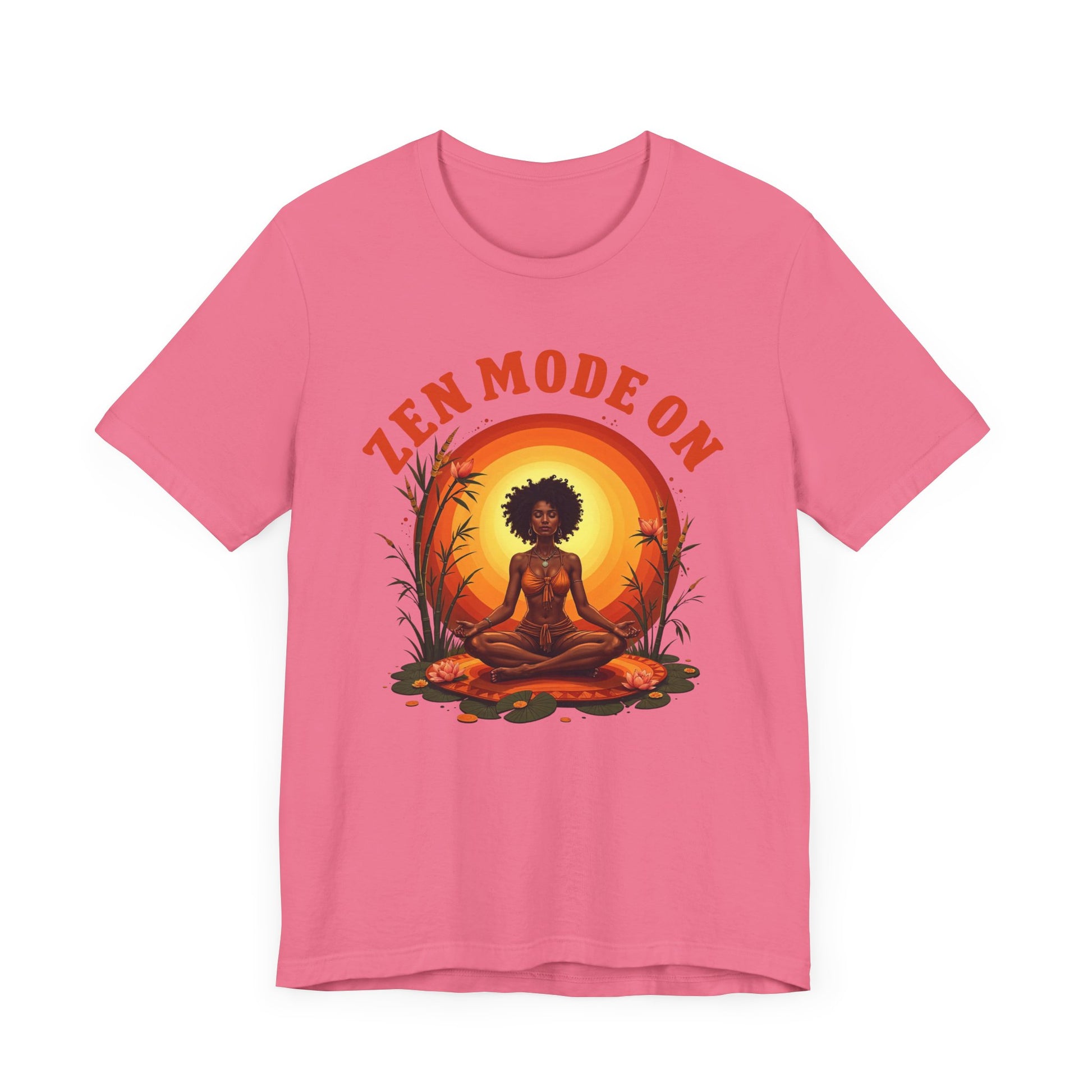 Embrace tranquility and mindfulness with this "Zen Mode On" t-shirt, featuring a serene woman meditating peacefully in an attractive dress. She sits gracefully on a circular, colorful board surrounded by lotus leaves and flowers, while a radiant background glows from light yellow to red in a soft gradient. This vibrant design is perfect for yoga lovers, meditation enthusiasts, and anyone seeking to inspire peace, positivity, and presence in their daily life. Crafted from soft, high-quality fabric for comfort during yoga, meditation, or casual outings