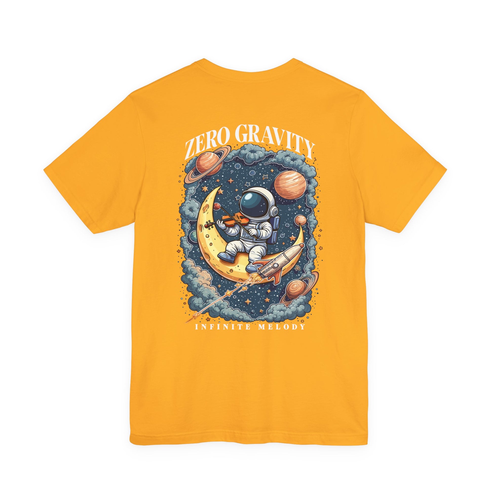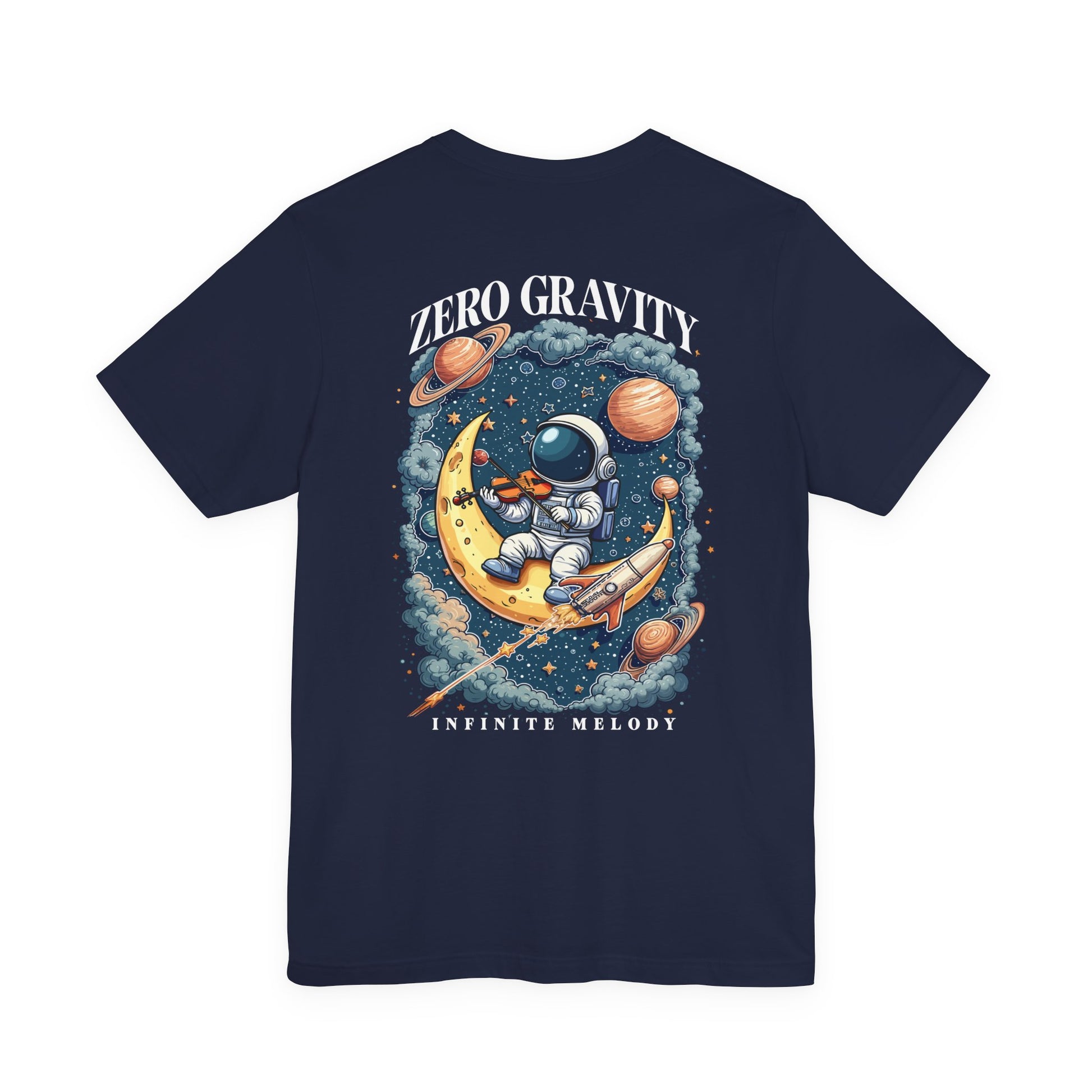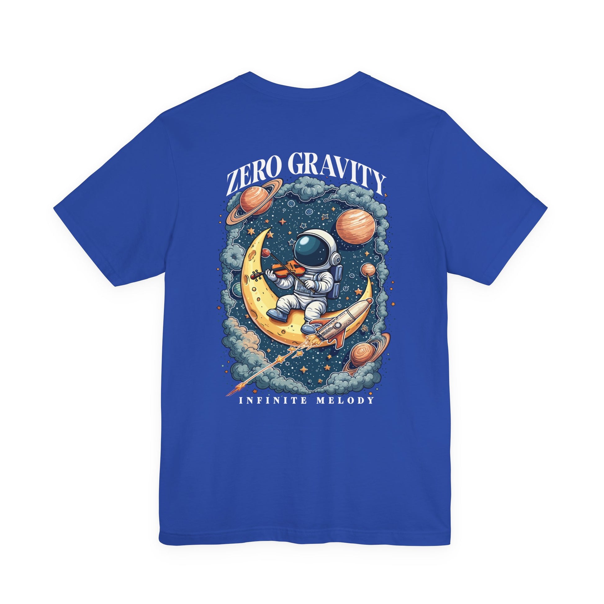 Journey beyond the stars with this stunning tshirt featuring an astronaut playing the violin while sitting on a crescent moon. Surrounded by planets, rockets, stars, and swirling space particles, the design captures the magic of music in the cosmos. Large “Zero Gravity” text tops the design, while “Infinite Melody” grounds it below. Perfect for space dreamers, music lovers, and anyone inspired by creativity that knows no bounds.